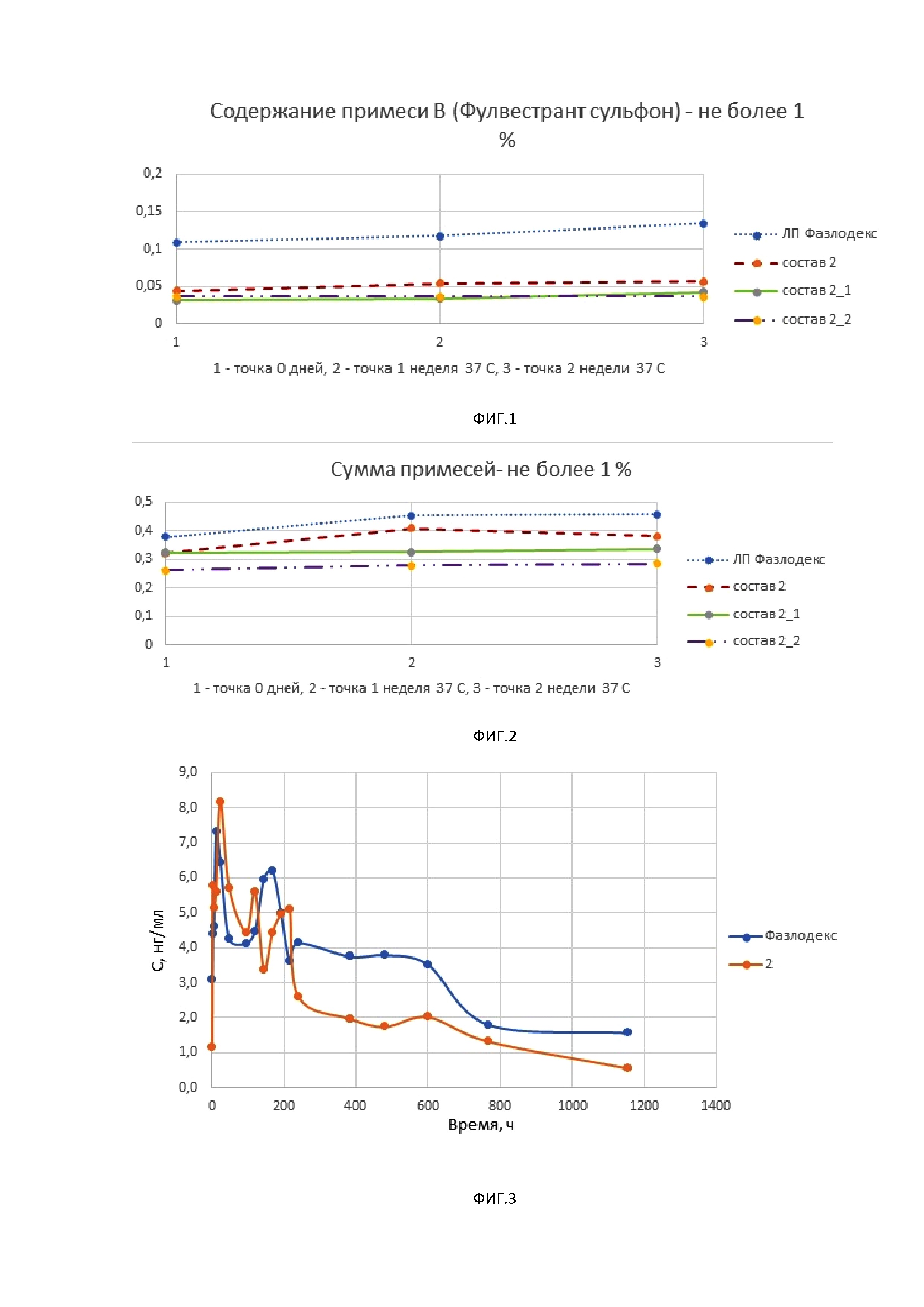 Область техники Настоящее изобретение относится к новой фармацевтической композиции, содержащей фулвестрант, к способу получения такой композиции и к применению такой композиции для лечения заболеваний или нарушений. Уровень техники Фулвестрант имеет химическое наименование 7α-[9-(4,4,5,5,5-пентафторпентилсульфинил)нонил]эстра-1,3,5-(10)-триен-3,17-β-диол и структурную формулу, представленную формулой I: Фулвестрант является конкурентным антагонистом эстрогеновых рецепторов (ЭР). По уровню аффинности к рецепторам сопоставим с эстрадиолом. Фулвестрант блокирует трофическое действие эстрогенов, не проявляя собственной эстрогеноподобной активности. Механизм его действия связан с подавлением активности и деградацией ЭР. Фулвестрант применяется в качестве лекарственной терапии метастатического или диссеминированного гормонозависимого рака молочной железы, у женщин в постменопаузе с прогрессированием заболевания после или на фоне терапии антиэстрогенами. Он ингибирует рост нечувствительных к тамоксифену и эстроген-зависимых клеток рака молочной железы. В настоящее время продаваемый продукт, Фазлодекс, представляет собой прозрачный, бесцветный до желтого, вязкий раствор для инъекций, содержащий 50 мг фулвестранта в 1 мл раствора. Неактивные ингредиенты в настоящее время одобренного продукта включают высокие концентрации бензилового спирта и бензилбензоата в качестве сорастворителей и касторовое масло. Препарат Фазлодекс поставляется в стерильных одиночных предварительно заполненных шприцах по 5 мл для внутримышечной инъекции, и в месяц может потребоваться несколько шприцев в зависимости от рекомендуемой дозы и графика дозирования. Состав должен быть охлажден при температуре 2-8 ° C и до введения должен быть доведен до комнатной температуры. Применение препарата Фазлодекс ассоциируется с болью в месте инъекции, тошнотой, рвотой и потерей аппетита, причем вероятной причиной является наличие в составе лекарственной формы значительного количества рицинолеиновой кислоты, компонента касторового масла. Фулвестрант демонстрирует определенные физические свойства, которые могут делать затруднительным изготовление фармацевтических композиций на его основе. Фулвестрант является особенно липофильной молекулой, а его растворимость в воде является крайне низкой и составляет приблизительно 10 нгмл-1(это оценка по системе смеси вода/растворитель и растворенное вещество, поскольку измерения столь малой величины невозможно осуществить в системе только вода - растворенное вещество). В этой связи изготовление фармацевтических композиций для инъекционного введения фулвестранта, которые не содержат касторового масла, но обладают хорошей стабильностью при хранении, имеет сложности с выбором эксципиентов. В настоящее время существует потребность в улучшенных композициях Фулвестранта с повышенной стабильностью фулвестранта, которые не содержат касторовое масло. Описание изобретения Ниже приведены определения терминов, которые использованы в описании этого изобретения. «Фармацевтическая композиция» обозначает композицию, включающую в себя соль согласно изобретению и, по крайней мере, один из компонентов, выбранных из группы, состоящей из фармацевтически приемлемых и фармакологически совместимых наполнителей, раст