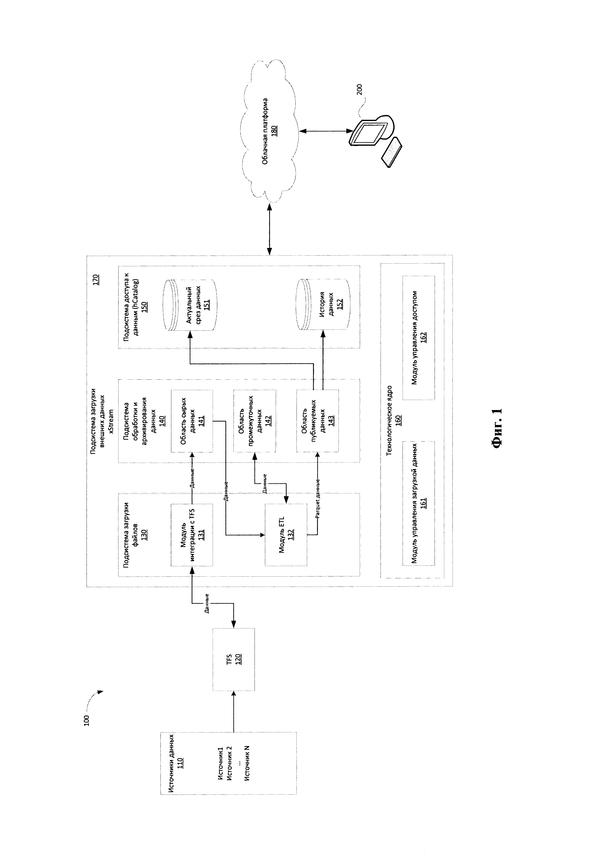 1. Система комплексного управления большими данными (Big Data), содержащая подсистему транспортировки и проверки входных данных (далее TFS), подсистему загрузки внешних данных (далее xStream), функционирующую на основании стандарта описания данных, в которой: 2. Система по п. 1, характеризующаяся тем, что TFS осуществляет проверку целостности получаемых архивных данных. 3. Система по п. 1, характеризующаяся тем, что для зарегистрированных источников в модуле управления загрузкой хранится ID упомянутых источников. 4. Система по п. 3, характеризующаяся тем, что модуль управления загрузкой осуществляет управление потоком данных множества источников по соответствующим сохраненным ID. 5. Система по п. 4, характеризующаяся тем, что для каждого источника данных в модуле управления загрузкой содержатся параметры загрузки данных. 6. Система по п. 1, характеризующаяся тем, что подсистема загрузки данных осуществляет загрузку файлов в подсистему обработки и архивирования на основании маски загрузки файлов. 7. Система по п. 6, характеризующаяся тем, что маска загрузки файлов формируется на основании, по меньшей мере, имени загруженного архивного файла. 8. Система по п. 1, характеризующаяся тем, что в подсистеме обработки и архивирования в каждой из областей хранения данных формируется каталог для хранения данных соответствующего источника. 9. Система по п. 7, характеризующаяся тем, что модуль управления загрузкой проверяет наличие информации по всем источникам в TFS. 10. Система по п. 9, характеризующаяся тем, что выполняется полная или инкрементальная загрузка данных из TFS. 11. Система по п. 10, характеризующаяся тем, что инкрементальная загрузка выполняется модулем загрузки данных при обнаружении в TFS новых данных, отличающихся от поставленных ранее по дате поставки архива файлов. 12. Система по п. 1, характеризующаяся тем, что подсистема обработки и архивирования осуществляет обработку parquet файлов для их приведения в соответствие типам Hive-SQL. 13. Система по п. 1, характеризующаяся тем, что для файлов при их обработке подсистемой обработки и архивирования выполняется проверка на наличие аналогичных данных, сохраненных ранее. 14. Система по п. 13, характеризующаяся тем, что при наличии более ранних данных в область публикуемых данных передается актуальная версия данных с перемещением предыдущей версии в каталог хранения истории с партиционированием по дате загрузки. 15. Система по п. 1, характеризующаяся тем, что hCatalog предоставляет отображение структуры данных области публикации данных. 16. Система по п. 15, характеризующаяся тем, что структура данных разбивается по базам данных, соответствующих источникам предоставления данных. 17. Система по п. 1, характеризующаяся тем, что подсистема обработки и архивирования данных дополнительно обеспечивает автоматизированную функцию оката загрузки данных на любую дату в прошлом. 18. Способ управления большими данными (Big Data) с помощью подсистемы транспортировки и проверки входных данных (далее TFS) и подсистемы загрузки внешних данных (далее xStream), причем xStream состоит из подсистемы загрузки файлов, подсистемы обработки и архивирования, подсистемы доступа к данным, модуля управления загрузкой данных и модуля управления доступом, причем способ включает этапы, на которых: 19. Способ по п. 18, характеризующийся тем, что модуль управления д