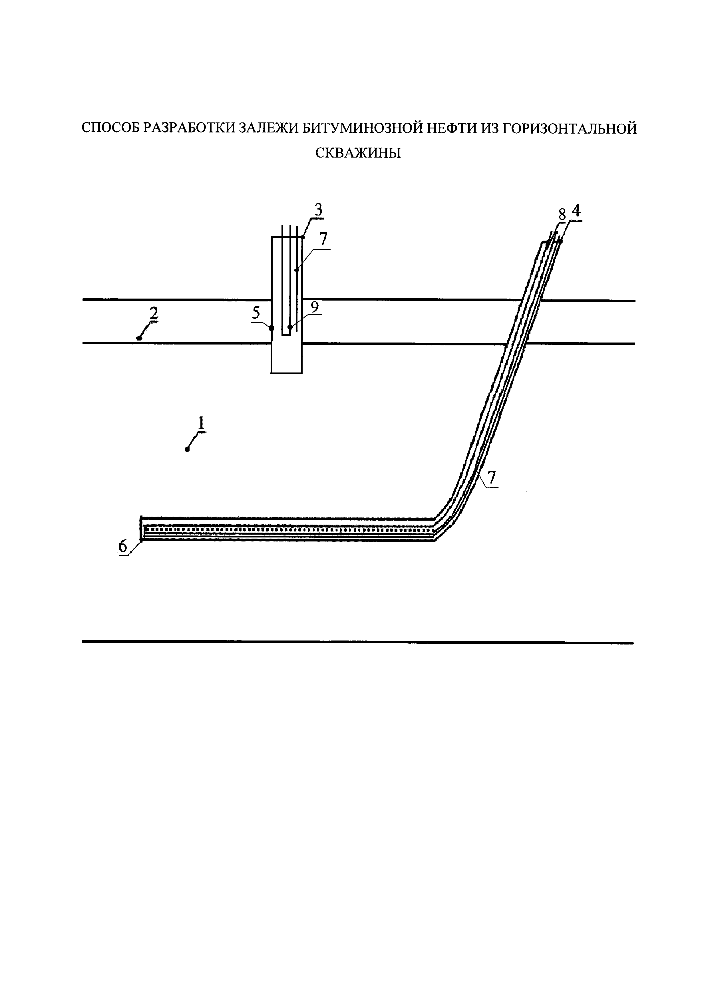 Способ разработки залежи битуминозной нефти из горизонтальной скважины, включающий строительство горизонтальной скважины с вскрытием продуктивного пласта, спуск насосно-компрессорных труб - НКТ, подачу теплоносителя по НКТ и отбор продукции скважины, отличающийся тем, что до начала строительства скважины производят исследования месторождения для выделения участков с наличием газовых шапок, бурят оценочную скважину над горизонтальной скважиной с вскрытием газовой шапки, горизонтальную скважину располагают под газовой шапкой, а при строительстве в скважинах располагают устройства контроля давления и температуры, в качестве рабочего агента для оценочной скважины применяют инертный газ, который нагнетают в газовую шапку, соблюдая условие, что давление в газовой шапке должно быть больше на 5-20% давления нагнетания рабочего агента в горизонтальную скважину, причем в качестве рабочего агента для горизонтальной скважины применяют водяной пар, который нагнетают циклически, сочетая с ожиданием термокапиллярной пропитки и последующим отбором продукции по НКТ.