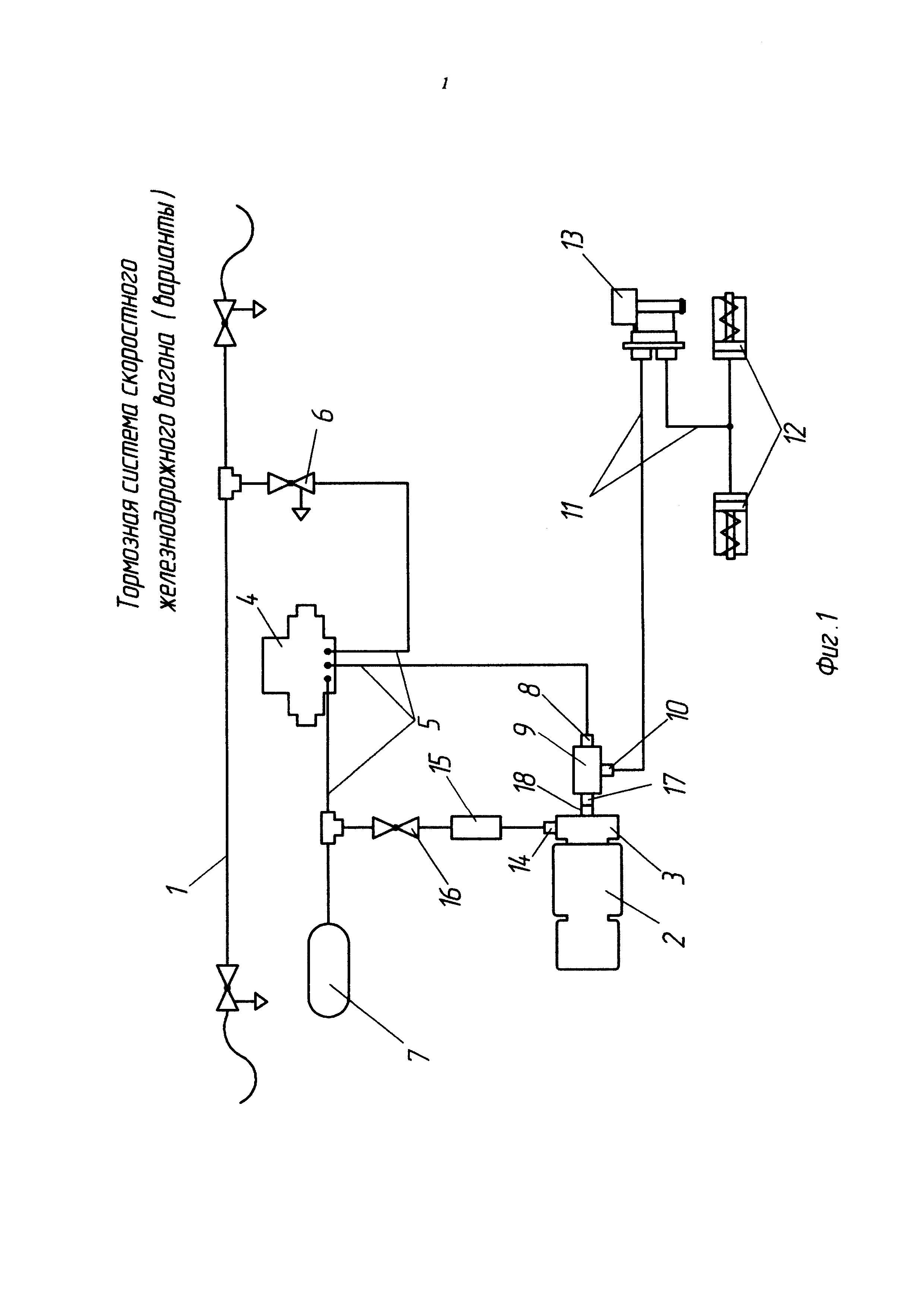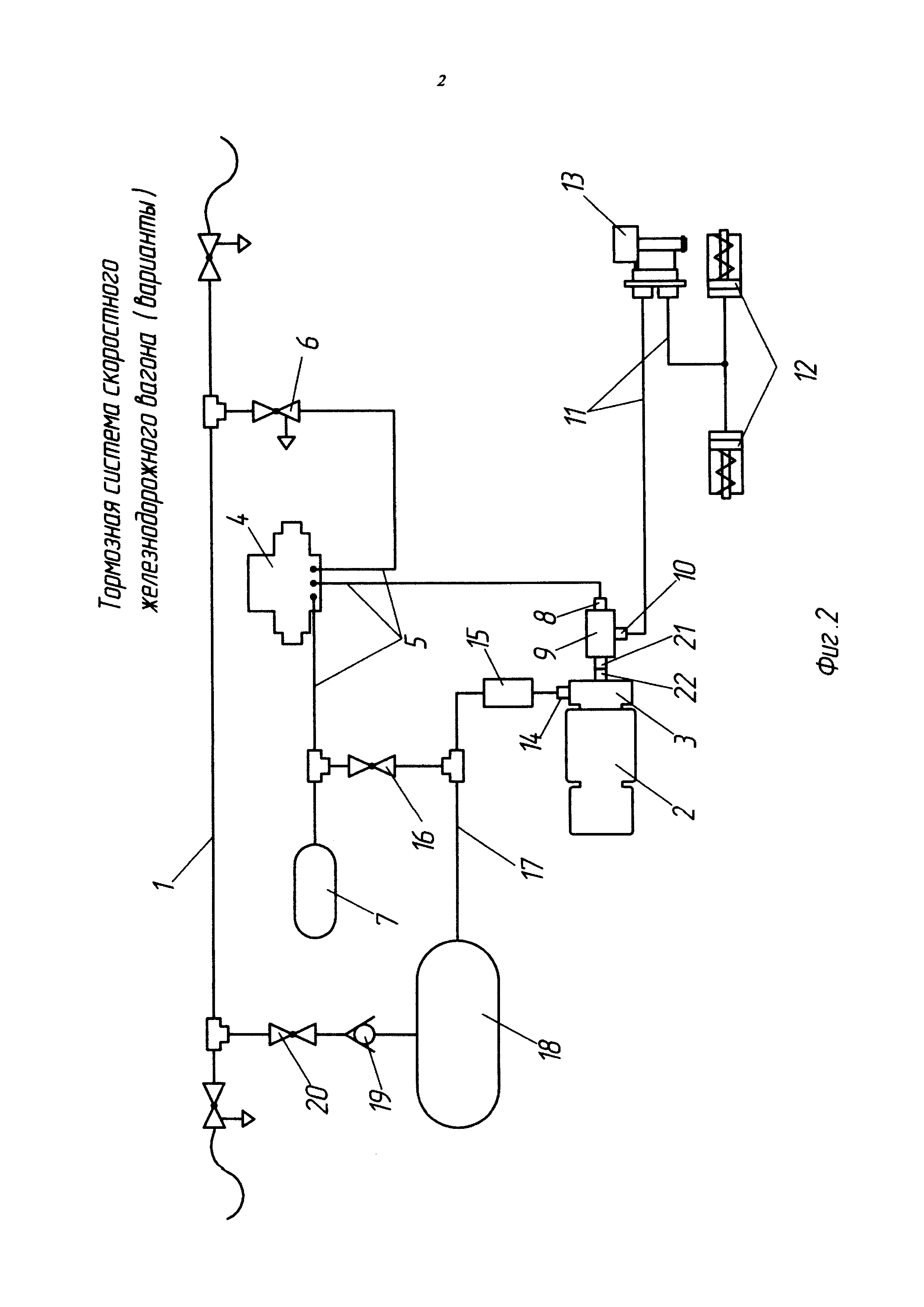 1. Тормозная система скоростного железнодорожного вагона, включающая тормозную магистраль, электропневматический воздухораспределитель, установленный на отдельном кронштейне, пневматический воздухораспределитель грузового типа, соединенный воздуховодами через разобщительный кран с тормозной магистралью, с запасным резервуаром и с подводящим отростком переключательного клапана, отводящий отросток которого соединен воздуховодом с тормозными цилиндрами через, как минимум, один авторежим, отличающаяся тем, что электропневматический воздухораспределитель соединен подводящим воздуховодом, выполненным в отдельном кронштейне, с клапаном максимального давления, подключенным через разобщительный кран к воздуховоду от запасного резервуара, а противоположный подводящий отросток переключательного клапана соединен с электропневматическим воздухораспределителем посредством воздуховода, выполненного в отдельном кронштейне. 2. Тормозная система скоростного железнодорожного вагона, включающая тормозную магистраль, электропневматический воздухораспределитель, установленный на отдельном кронштейне, пневматический воздухораспределитель грузового типа, соединенный воздуховодами через разобщительный кран с тормозной магистралью, с запасным резервуаром и с подводящим отростком переключательного клапана, отводящий отросток которого соединен воздуховодом с тормозными цилиндрами через, как минимум, один авторежим, отличающаяся тем, что электропневматический воздухораспределитель соединен подводящим воздуховодом, выполненным в отдельном кронштейне, с клапаном максимального давления, подключенным одновременно через разобщительный кран к воздуховоду от запасного резервуара и к воздуховоду от отдельного запасного резервуара, соединенного с тормозной магистралью через обратный клапан и разобщительный кран, а противоположный подводящий отросток переключательного клапана соединен с электропневматическим воздухораспределителем посредством воздуховода, выполненного в отдельном кронштейне.