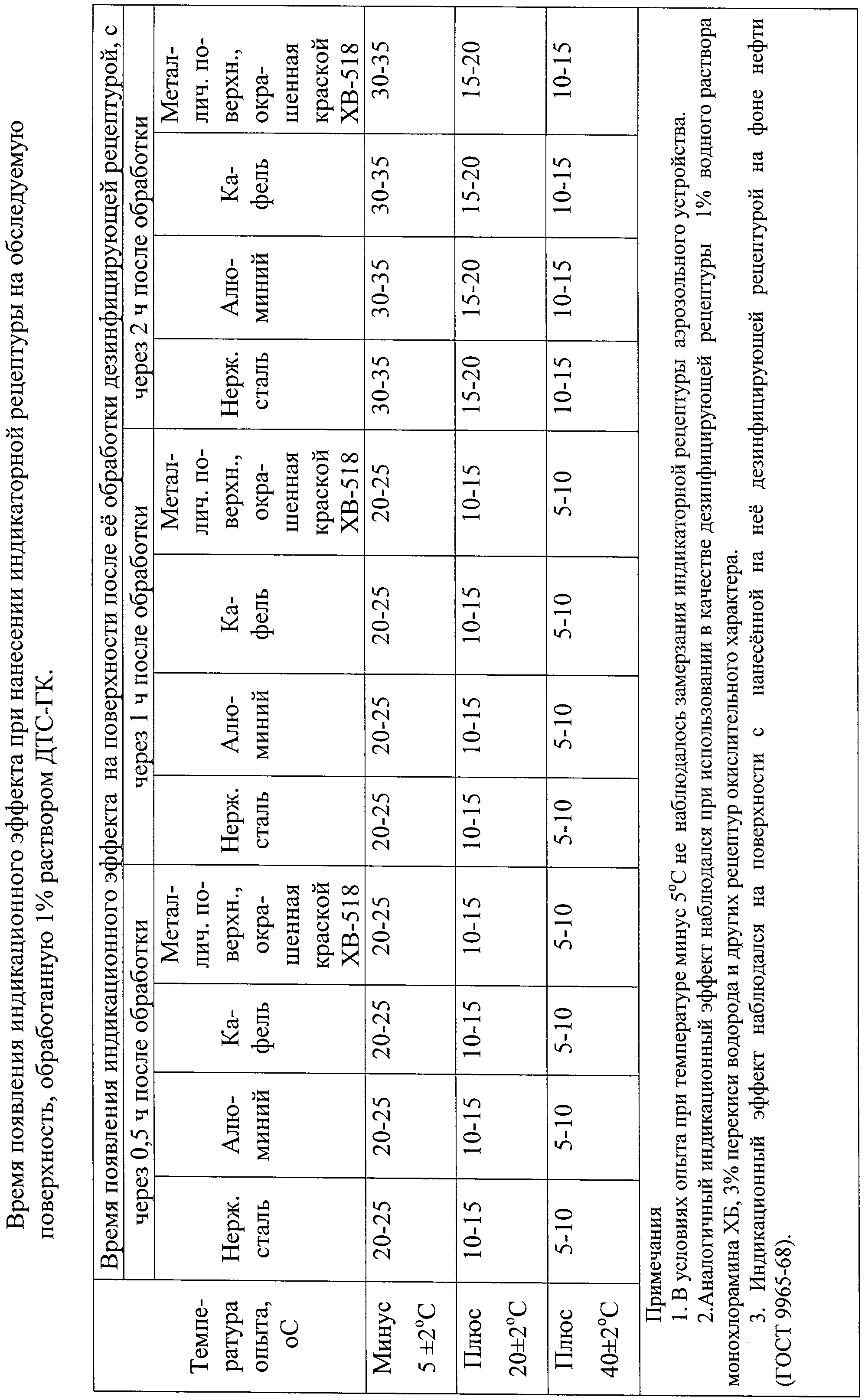Изобретение относится к области дезинфекции, в частности для экспресс-обнаружения действующего вещества дезинфектантов на поверхностях объектов. Изобретение характеризуется тем, что способ и состав индикаторной рецептуры для обнаружения веществ окислительного характера действует на горизонтальных, наклонных и вертикальных поверхностях, наносится путем орошения анализируемой поверхности с помощью аэрозольного устройства. В качестве индикаторной рецептуры используют состав, состоящий из следующих компонентов (в массовых процентах): йодид калия - 0,1-0,2; крахмал - 0,1-0,2; кислота уксусная - 1,0-1,5; ацетат натрия трехводный - 2,0-3,0; глицерин - 5,0-10,0; вода дистиллированная - до 100. Обнаружение полноты дезинфекции спустя не менее 0,5 ч и не позднее 2 ч после проведения обработки определяют по индикационному эффекту - синему окрашиванию объекта. Изобретение обеспечивает стабильность индикаторной рецептуры при хранении. 3 н. и 3 з.п. ф-лы, 2 ил., 1 табл.