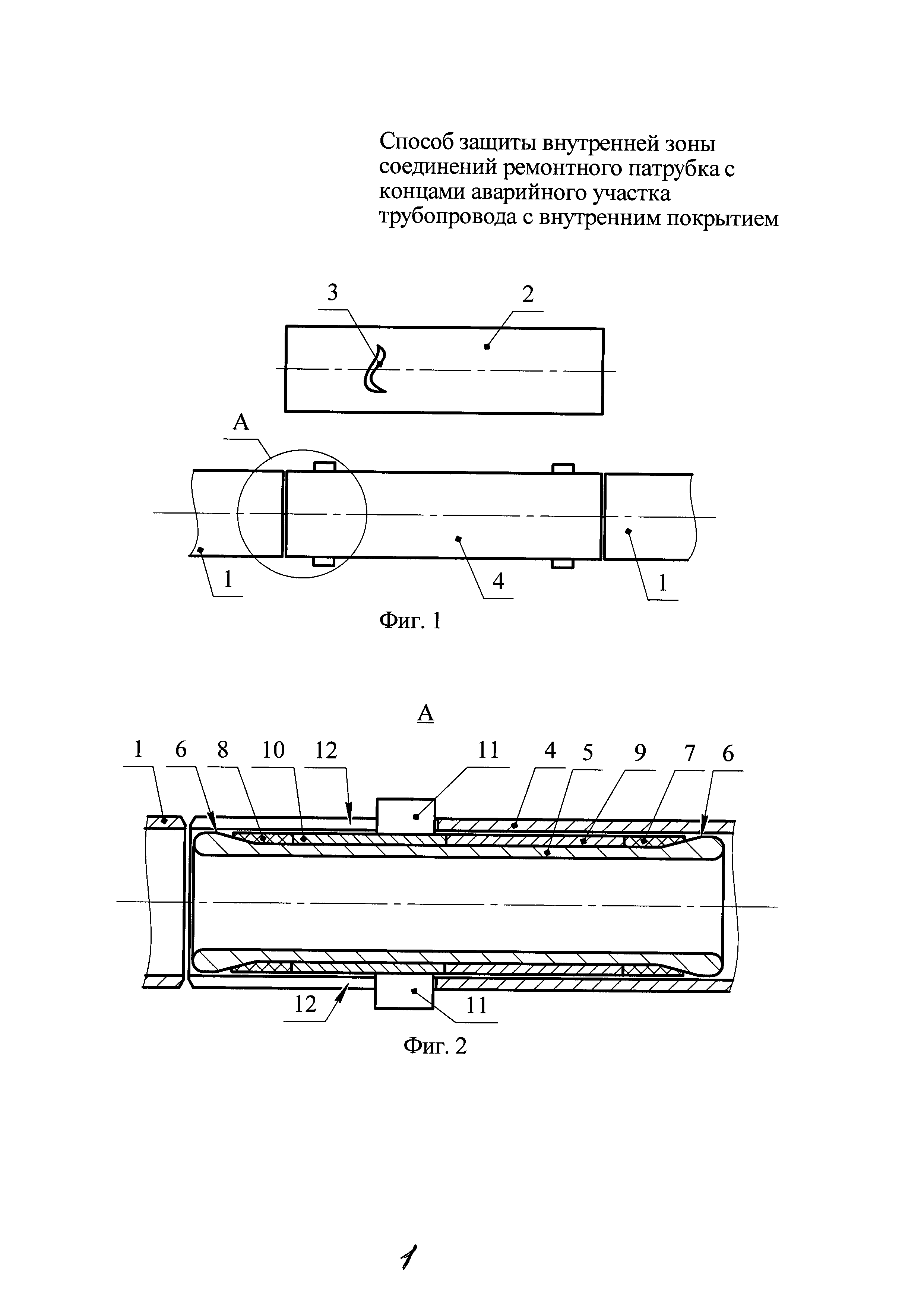 Изобретение относится к области трубопроводного транспорта и может быть использовано при строительстве и ремонте трубопроводов различного назначения, транспортирующих агрессивные среды. Известен способ защиты от коррозии зоны сварного соединения металлических труб с внутренним противокоррозионным покрытием (патент RU №2342588, МПК F16L 13/02, опубл. в бюл. №36 от 27.12.2008), включающий установку внутри конца трубы втулки, имеющей на наружной поверхности герметизирующее кольцо, закрепление втулки и подготовку концов втулки и трубы под сварку встык. Втулку изготавливают в виде двух телескопически соединенных между собой патрубков, внутренний из которых выполнен из коррозионностойкого металла и с кольцевым выступом. Герметизирующее кольцо размещают в промежутке между кольцевым выступом и внутренним торцом внешнего патрубка. Внешний патрубок вводят в трубу и прикрепляют к трубе. Путем силового перемещения внутреннего патрубка в осевом направлении прижимают герметизирующее кольцо к кольцевому выступу и торцу внешнего патрубка. Затем прикрепляют внутренний патрубок к внешнему патрубку. Недостатком данного способа является высокая стоимость втулки, так как ее внутренний патрубок изготавливается из дорогостоящей коррозионностойкой стали. Другим недостатком способа является большой объем сварки при соединении подготовленных концов труб, так как сварке подлежат три слоя металла: труба, наружный и внутренний патрубки. Большой объем сварки вызывает повышенное температурное влияние на внутреннее покрытие и герметизирующее кольцо. Как следствие, возникает необходимость увеличения расстояния от сварного шва до кольца, что, в свою очередь, увеличивает общую длину и, соответственно, стоимость втулки. Кроме того, корень шва должен выполняться специальным дорогостоящим электродом для сварки коррозионностойкой стали, что ведет к удорожанию сварочных работ и требует высокой квалификации сварщика. Известен способ соединения труб с внутренним покрытием (патент RU №2226637, МПК F16L 13/02, опубл. 10.04.2004), включающий калибровку и расширение внутреннего диаметра концов труб до нанесения покрытия. При соединении труб в полость их концов размещают внутреннюю защитную втулку, после чего трубы сваривают. Втулка имеет противокоррозионное покрытие, а на концах наружные уплотнительные элементы, которые размещаются в зонах изменения внутреннего диаметра концов труб. Недостатком данного способа является то, что для размещения внутренней защитной втулки в полость концов соединяемых труб необходимо осуществлять их осевое смещение для стыковки. Данное смещение возможно при строительстве трубопровода, когда его можно осуществлять трубой, привариваемой к уже смонтированному участку трубопровода. Необходимость осевого смещения вызывает сложности в процессе установки патрубка в существующий трубопровод для ремонта аварийного участка. В данном случае осевое смещение соединяемых концов трубопровода или патрубка невозможно. Наиболее близким по технической сущности является способ защиты внутренней зоны соединений труб с внутренним покрытием (патент RU №2637786, МПК F16L 13/00, опубл. 07.12.2017), включающий установку на вырезанном аварийном участке трубопровода ремонтного патрубка с длиной, равной длине вырезанного аварийного участка, в концевые полости к