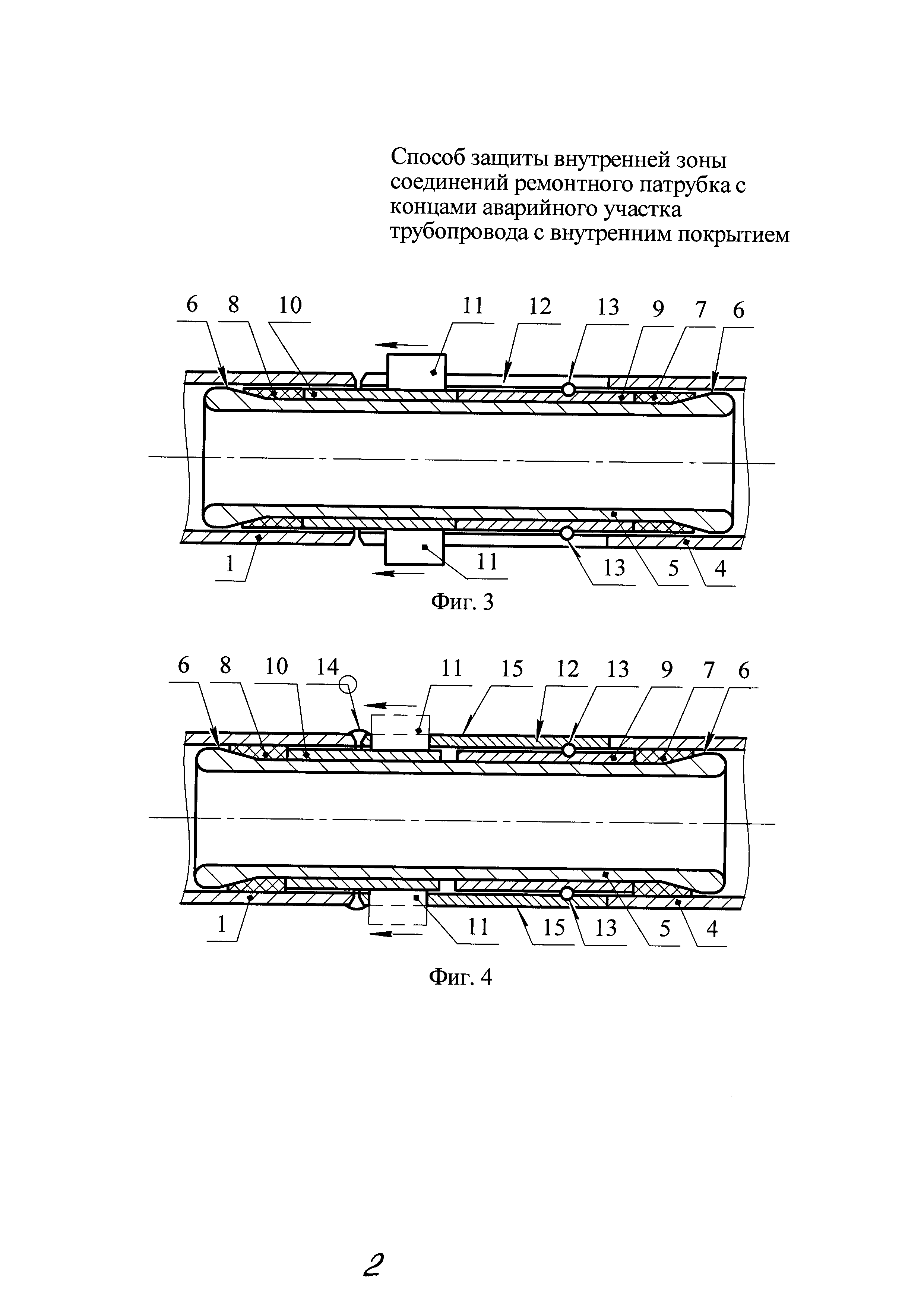 Способ защиты внутренней зоны соединений ремонтного патрубка с концами аварийного участка трубопровода с внутренним покрытием, включающий установку на вырезанном аварийном участке трубопровода ремонтного патрубка с длиной, равной длине вырезанного аварийного участка, в концевые полости которого установлены на всю длину защитные втулки в антикоррозионном исполнении, имеющие на концах уплотнительные элементы, частичный ввод защитных втулок осевым смещением в концы аварийного участка трубопровода при помощи боковых выступов, перемещающихся в продольных сквозных прорезях, выполненных на концах ремонтного патрубка, герметизацию изнутри соответствующих стыков и сквозных прорезей, соединение стыков и герметизацию боковых прорезей с фиксацией внутренних защитных втулок от осевого смещения, отличающийся тем, что защитные втулки оснащают снаружи на концах конусными расширениями, между которыми и подвижными уплотнительными элементами на каждой втулке устанавливают с возможностью продольного перемещения два толкателя, причем боковые выступы жестко соединяют с одним из толкателей соответствующей защитной втулки, после частичного ввода соответствующей защитной втулки в конец аварийного участка трубопровода толкатель без выступов фиксируют относительно ремонтного патрубка или конца трубопровода, выступы с другим толкателем перемещают от зафиксированного толкателя до сдвига уплотнительных элементов на конусные расширения с герметизацией пространств между концом трубопровода и защитной втулкой и между ремонтным патрубком и защитной втулкой.