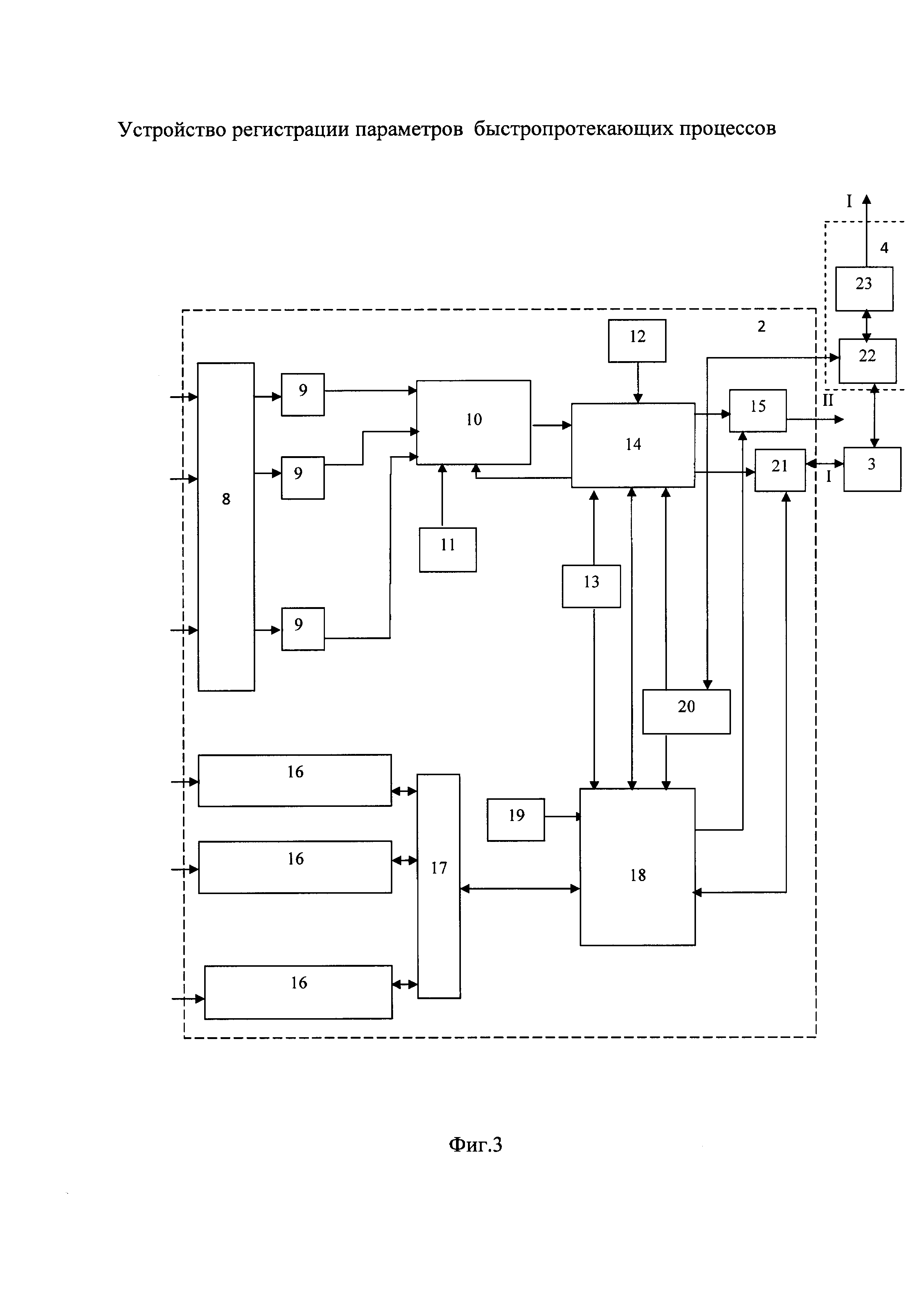 1. Устройство регистрации параметров быстропротекающих процессов, содержащее информационный датчик и блок измерения, выход информационного датчика соединен с первым входом блока измерения, второй выход блока измерения является вторым выходом устройства отличающееся тем, что в устройство дополнительно введены блок обмена данными, блок обработки и документирования, блок питания, причем первый выход блока измерения соединен с входом блока обмена данными, выход блока обмена данными соединен с входом блока измерения, выход блока обмена данными соединен с входом блока обработки и документирования, выход блока обработки и документирования соединен с входом блока обмена данными, выход блока питания соединен с вторым входом блока измерения. 2. Устройство по п. 1, в котором информационный датчик содержит n датчиков избыточного давления и n датчиков температуры, группа выходов n датчиков избыточного давления и группы выходов n датчиков температуры соединены с группой входов блока измерения. 3. Устройство по п. 1, в котором блок измерения содержит цепи согласования сигналов, n усилителей напряжения, n - канальный АЦП, прецизионный источник опорного напряжения для АЦП, супервизор канала давлений, кварцевый задающий генератор, микроконтроллер канала давлений, com-порт, n преобразователей "Термопара - Цифра" с компенсацией температуры холодного спая, схему гальваноразвязки и преобразования уровней напряжений сигналов, микроконтроллер канала температур, супервизор канала температур, модуль отладки, радиотрансивер, группа входов блока измерения, соединенная с группой выходов n датчиков давления, соединена через цепи согласования сигналов с входами n усилителей заряда, выходы которых соединены с n входами n-канального АЦП, выход прецизионного источника опорного напряжения для АЦП соединен с входом многоканального АЦП, выход многоканального АЦП соединен с входом микроконтроллера канала давлений, выход супервизора канала давлений соединен с входом микроконтроллера канала давлений, первый выход кварцевого задающего генератора соединен с входом микроконтроллера канала давлений, второй выход кварцевого задающего генератора соединен с входом микроконтроллера канала температур, выход микроконтроллера канала давлений соединен с входом многоканального АЦП, входы n преобразователей "Термопара - Цифра" с компенсацией температуры холодного спая соединены с группой выходов n датчиков температуры, выходы n преобразователей "Термопара - Цифра" с компенсацией температуры холодного спая соединены в n входами схемы гальваноразвязки и преобразования уровней напряжений сигналов, выходы которых соединены с входами микроконтроллера канала температур, выход супервизора канала температур соединен с входом микроконтроллера канала температур, первый выход модуля отладки соединен с входом микроконтроллера канала давлений, второй выход модуля отладки соединен с входом микроконтроллера канала температур, выход модуля отладки соединен с входом блока обработки и документирования, выход блока обработки и документирования соединен с входом модуля отладки, выход микроконтроллера канала температур соединен с входом схемы гальваноразвязки и преобразования уровней напряжений сигналов, выход микроконтроллера канала давлений соединен с входом 
