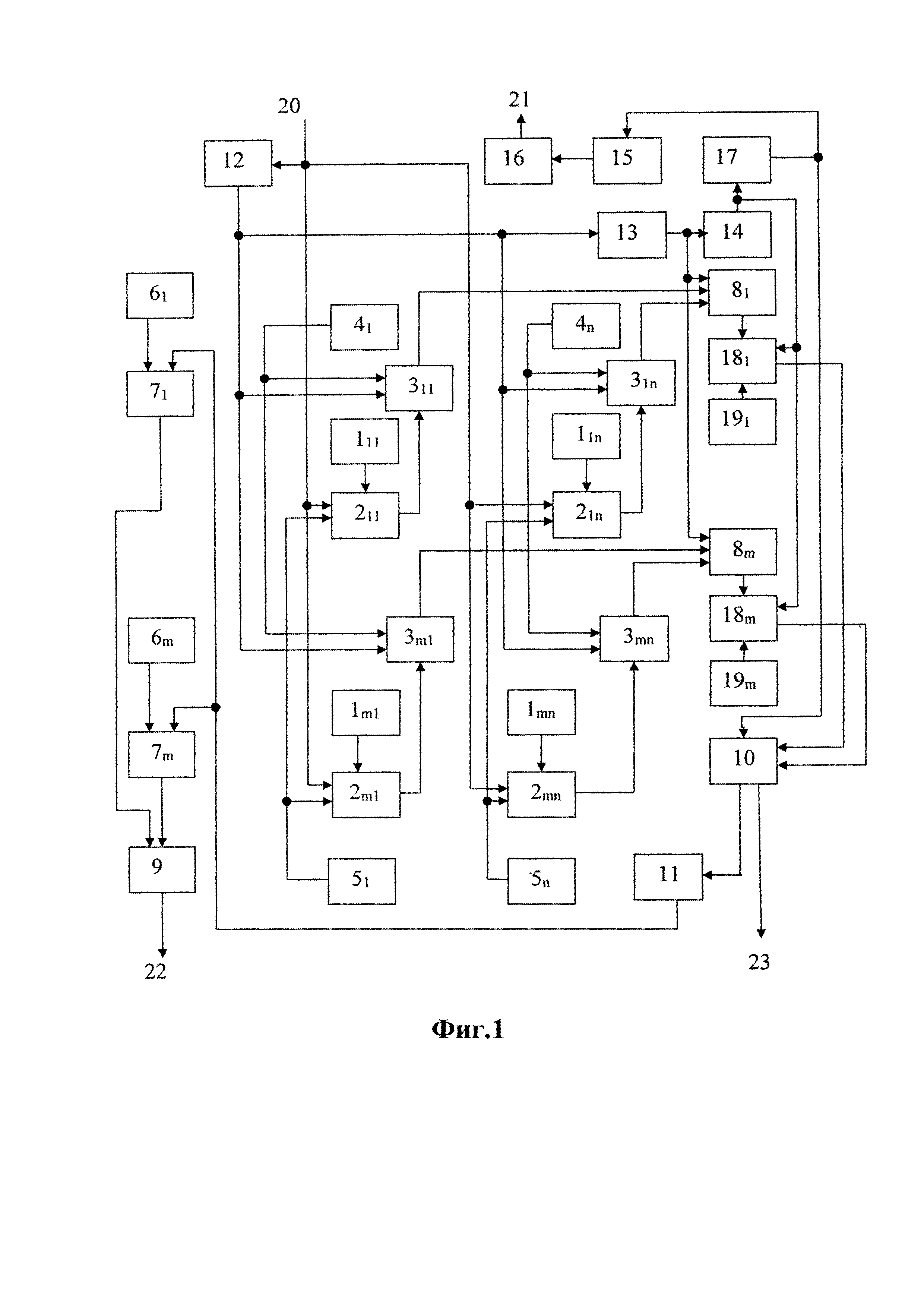 пятые регистры 19i (i=1…m), вторые блоки деления 18i (i=1…m), пятый элемент задержки 17, вход которого подсоединен к выходу третьего элемента задержки 14, а выход подсоединен к входу четвертого элемента задержки 15 и к управляющему входу блока выбора максимального кода 10, выход пятого регистра 19i (i=1…m) подсоединен к первому входу второго блока деления 18i (i=1…m), второй вход которого подсоединен к выходу сумматора 8i (i=1…m), а выход подсоединен к одноименному входу блока выбора максимального кода 10, выход третьего элемента задержки 14 подсоединен к управляющему входу второго блока деления 18i (i=1…m).
