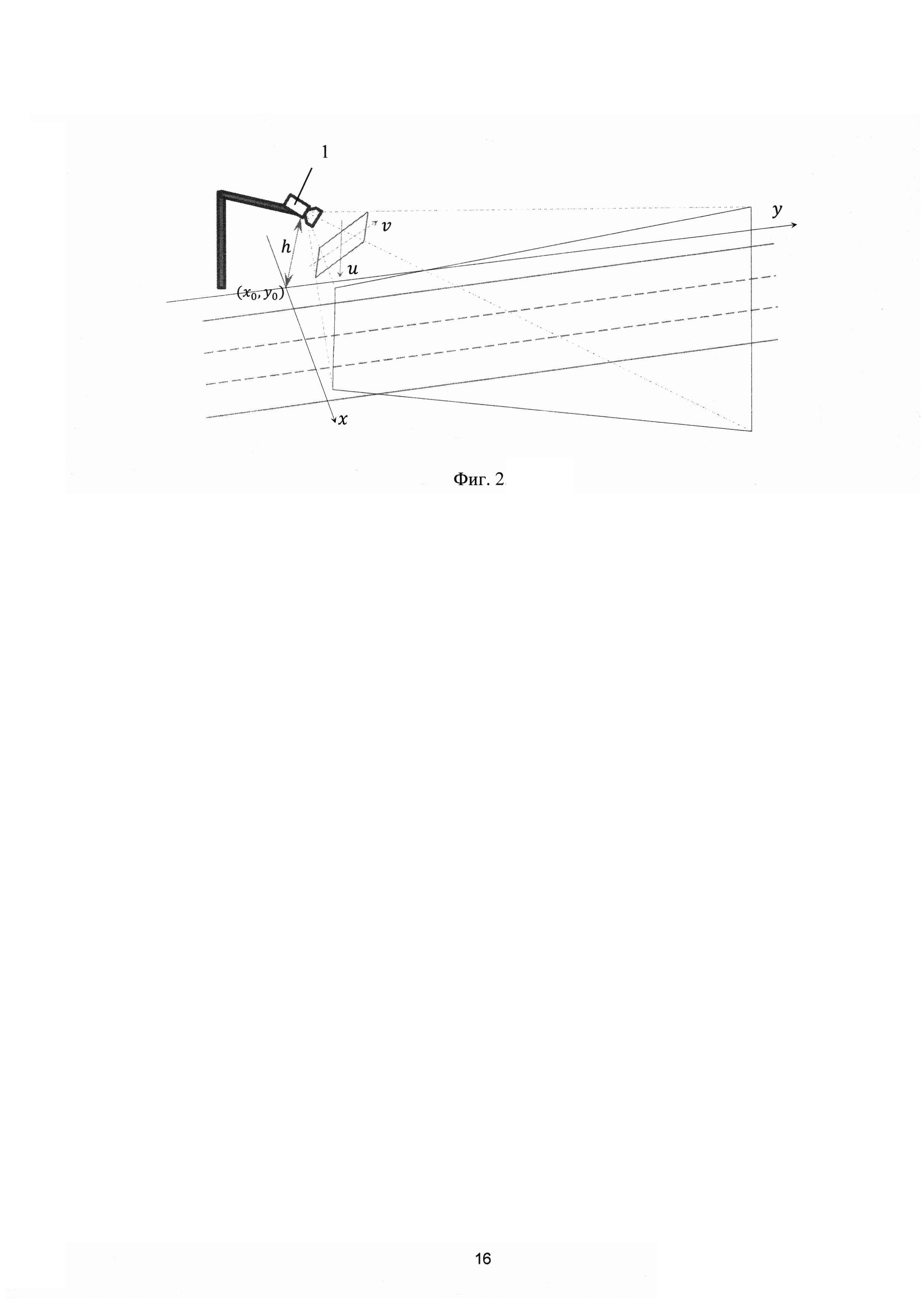 и коэффициентов проективного отображения А′, В′, С′, D′, Е′, F′, G′, Н′. Для связи координат изображения (u,v) с координатами (x,y) дорожного полотна требуется провести процедуру внешней калибровки, которая установит высоту установки h видеокамеры 1 над плоскостью дорожного полотна δ, а также положение плоскости δ в системе координат, связанной с видеокамерой 1 (Фиг. 4). Таким образом, для решения поставленной задачи требуется получить уравнение плоскости δ в параметрической форме в виде разложения по двум единичным взаимно перпендикулярным векторам, параметры-коэффициенты разложения будут играть роль координат плоскости дорожного полотна (x,y). Подставив параметрическое представление плоскости δ в формулу проективного преобразования, можно получить требуемую связь (u,v) (x,y). Уравнение плоскости δ в канонической форме дополнительно позволит установить высоту установки видеокамеры 1 и проекцию (х0,y0) точки крепления видеокамеры 1 на плоскость δ. исходных точек, при этом нормаль плоскости является собственным вектором, соответствующим минимальному собственному для матрицы