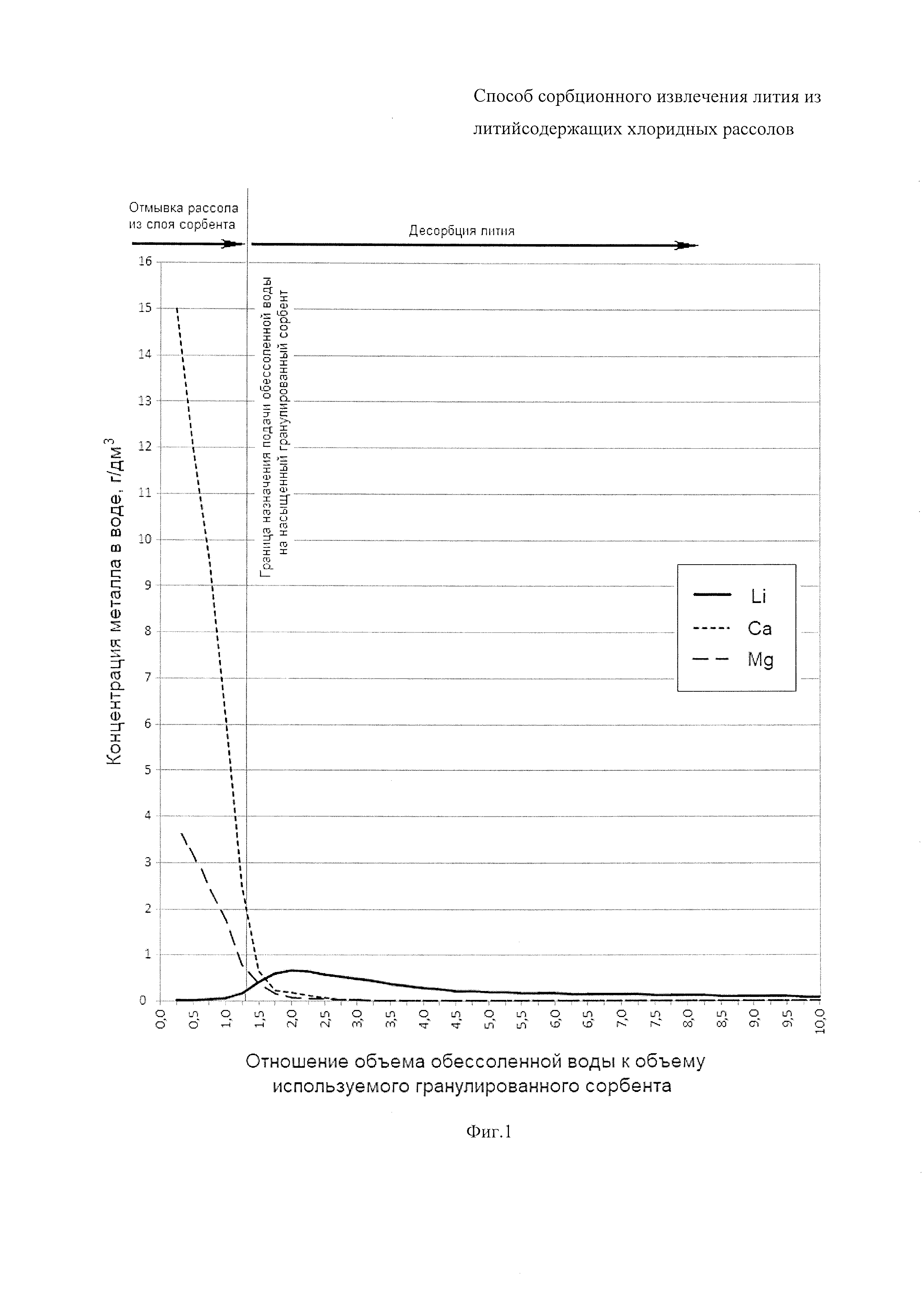 Изобретение относится к области пирометаллургии лития и может быть использовано для извлечения лития из природных рассолов, технологических растворов и сточных вод нефтегазодобывающих, химических, химико-металлургических и биохимических производств. Известен способ извлечения лития из рассолов с использованием гранулированного сорбента на основе диоксида марганца (ИСМ-1), которым заполняется колонка для работы в циклах сорбции-десорбции лития. Десорбцию лития осуществляют 0,2 н. раствором азотной кислоты (Остроушко Ю.И., Дегтерева Т.В. Гидроминеральное сырье - неисчерпаемый источник лития. Аналитичесикй обзор. - М: ЦНИИАТОМИНФОРМ, 1999. - 64 с.). Недостатками способа являются использование на стадии десорбции лития агрессивного и опасного химического реагента - азотной кислоты, обладающей пожаровзрыво-опасными свойствами и выделяющей токсичные пары, а также необходимость утилизации или нейтрализации отработанной азотной кислоты; необходимость последующей очистки элюатов от примесей кальция и магния. Известен способ извлечения лития из рассолов на основе кристаллического алюмината лития LiCl⋅2Al(ОН)3⋅nH2O, синтезированного внутри пор макропористой ионообменной смолы, и использования данного сорбента в сорбционных колонках с неподвижным фильтрующим слоем, с элюированием (десорбцией) лития и последовательным пропусканием элюата через систему колонок для его концентрирования (патент США №4291001, кл. 423-179.5, 1981). С этой целью к элюату добавляют соль неконкурирующего металла, например, NaCl или CaCl2. Система колонок эксплуатируется при условии нагревания рассола до температуры более 60°С. Недостатками способа являются сложность аппаратурного оформления (система колонн), использование соли для концентрирования элюата, высокие энергетические затраты, т.к. необходимо использование только нагретых рассолов для извлечения лития. Известен способ получения хлорида лития из растворов и установка для его осуществления с использованием гранулированного сорбента (заявка WO №03/037794, МПК C01D 15/04. Опубл. 08.05.2003). Использование гранулированного сорбента на основе дефектной разновидности соединения LiCl⋅2Al(НО)3⋅mH2O вместо кристаллических гранул, содержащих гидратированное соединение LiCl/Al(ОН)3, позволяет проводить все без исключения операции процесса обогащения при комнатной температуре, получая при этом первичный литиевый концентрат с содержанием LiCl 5,2-6,0 г/л и общим содержанием примесей (MgCl2+CaCl2) не более 5,0 г/л, что позволяет в дальнейшем концентрировать его по хлориду лития до ≥300 г/л и использовать для получения LiCl и Li2CO3. При этом использование установки с движущимся слоем гранулированного сорбента позволяет предельно минимизировать массу единовременной его загрузки. Также известен способ селективного сорбционного извлечения лития из рассолов (патент RU №2050330, МПК C02F 1/28, опубл. 20.12.1995) путем контактирования рассола с гранулированным сорбентом на основе хлорсодержащего двойного гидроксида алюминия лития с последующей десорбцией лития обессоленной водой с получением в качестве алюата раствора хлорида лития. Недостатком данных способов является использование в процессе обогащения движущегося гранулированного слоя сорбента, что приводит к механическому износу за счет истирания гранул, который составляет в год более 37% от массы единовреме