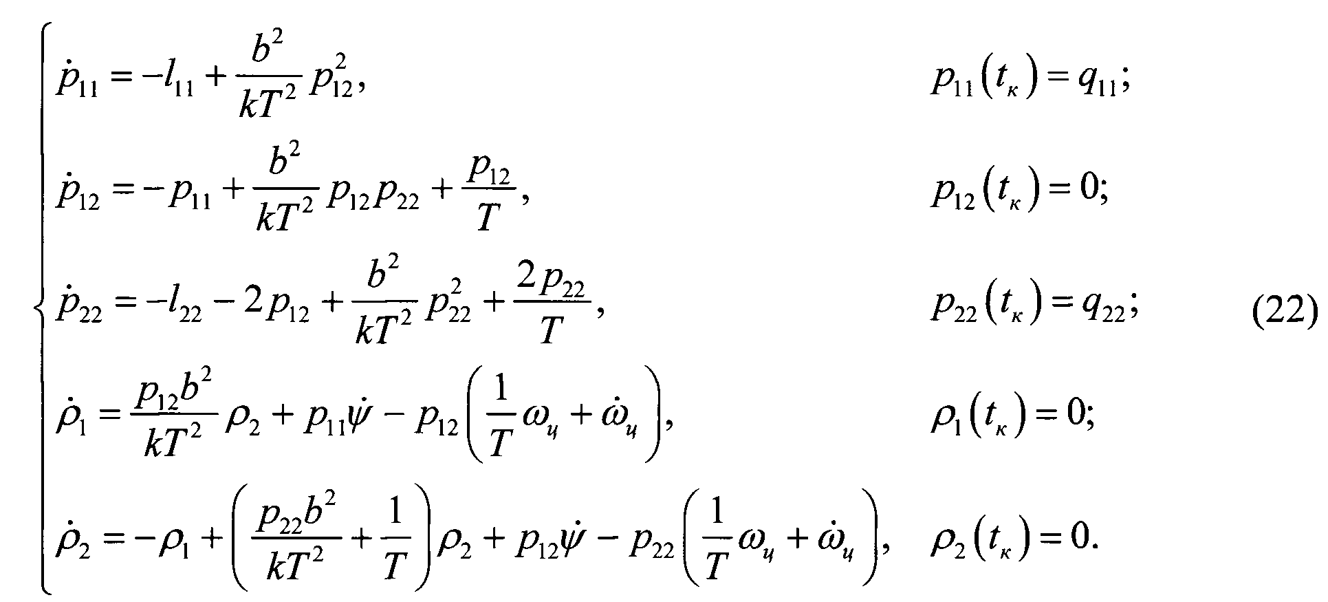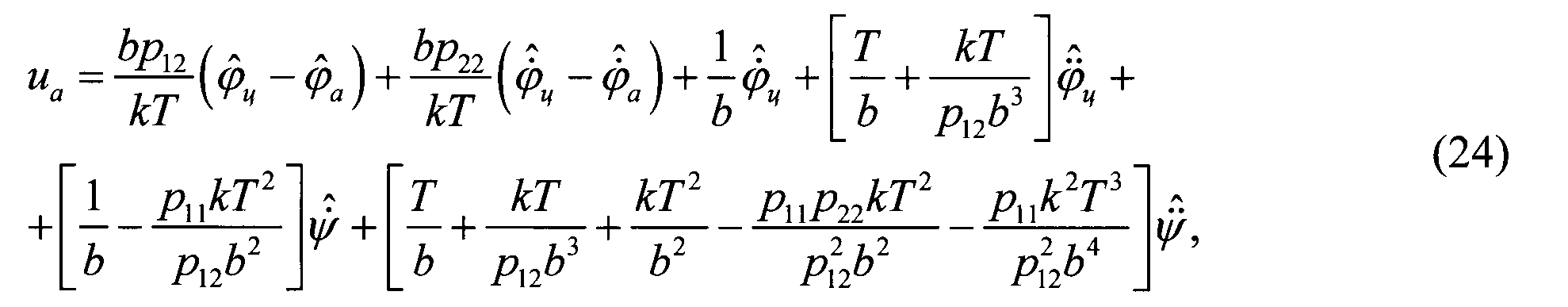 - оценки первой и второй производных угловой скорости линии визирования, Т - постоянная времени привода угломера, b - коэффициент усиления привода угломера, p11, p12 и p22 - весовые коэффициенты оценки текущего состояния следящей системы, k - коэффициент штрафа за величину сигнала управления.