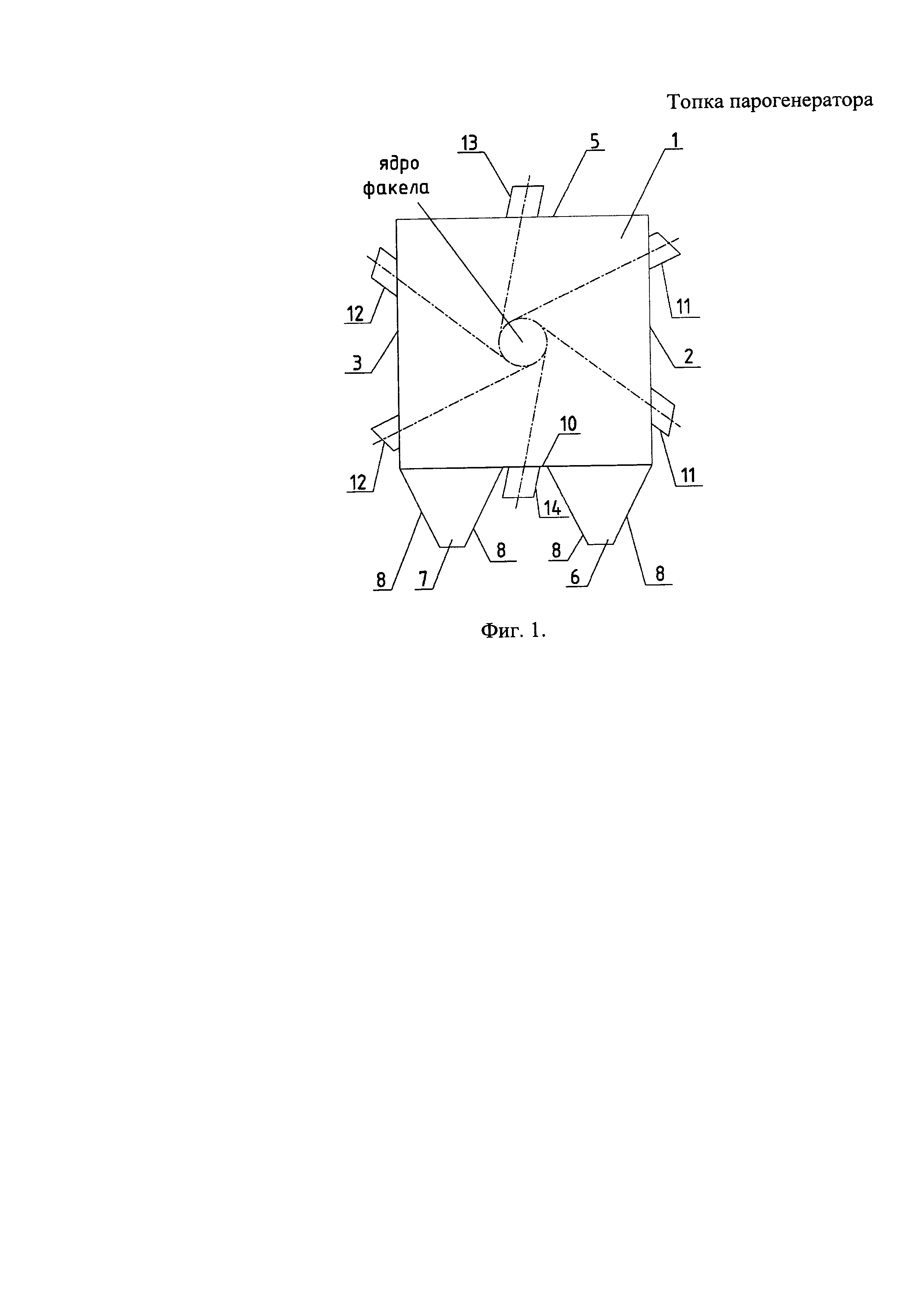 Топка парогенератора, содержащая горизонтальную камеру сгорания, ограниченную двумя вертикальными экранированными боковыми стенками, вертикальной экранированной фронтальной стенкой, горизонтальной экранированной крышей, горелки, холодную воронку, образованную группой наклонных экранированных стенок, отличающаяся тем, что горизонтальная камера сгорания выполнена квадратного сечения, горелки выбраны прямоточного типа, топка снабжена дополнительной холодной воронкой, образованной группой наклонных экранированных стенок, как и основная воронка, холодные воронки выполнены продольной формы и соединены горизонтальной экранированной стенкой, снабженной N≥1 рядами горелок, каждая боковая стенка снабжена М≥1 рядами горелок, плоскости, образованные пересечением продольных осей горелок, формируют ярусы горелок, продольные оси в каждом ярусе горелок направлены по касательной к условной окружности с относительным диаметром 0.15<dу<0.20, где d - диаметр условной окружности, D - диаметр окружности, условно вписанной в квадратное сечение камеры сгорания.