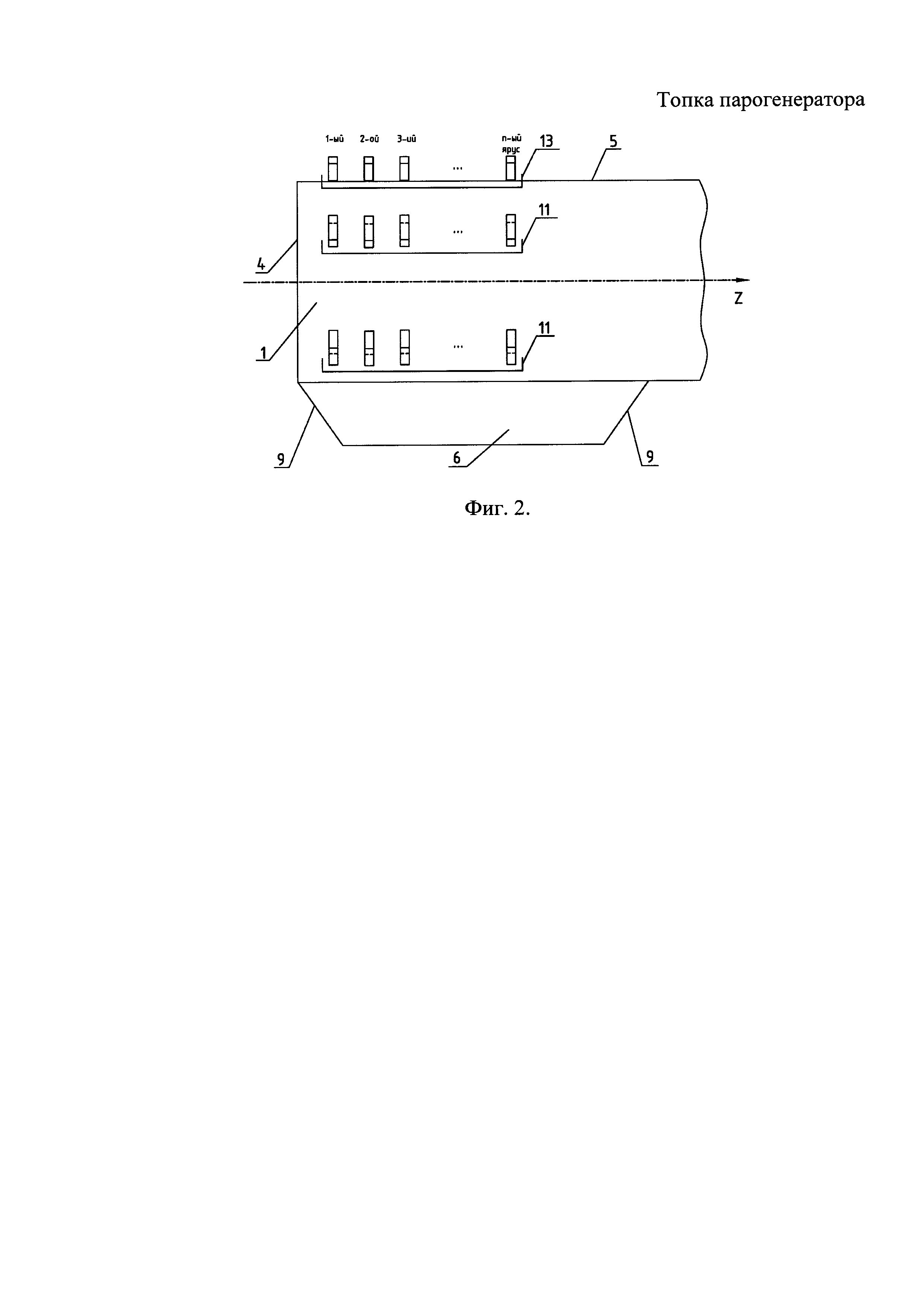 Изобретение относится к области теплоэнергетики и может быть использовано при разработке парогенераторов с пылевым сжиганием углей. Известна топка парогенератора с вертикальной квадратного сечения камерой сгорания, ограниченной четырьмя вертикальными экранированными боковыми стенками, снабженными прямоточными горелками, расположенными тангенциально, горизонтальной экранированной крышей, холодной воронкой, образованной группой наклонных экранированных стенок [Резников М.И., Липов Ю.М. Паровые котлы тепловых электростанций: Учебник для вузов. - М.: Энергоиздат, 1981, с. 59]. Основной недостаток рассматриваемого аналога заключается в вертикальном расположении камеры сгорания, обуславливающим значительную протяженность паропроводов острого пара и промперегрева, изготавливаемых из дорогостоящих жаропрочных сплавов. Известна топка парогенератора с горизонтальной прямоугольной камерой сгорания, ограниченной двумя вертикальными экранированными боковыми стенками, вертикальной экранированной фронтальной стенкой, горизонтальной экранированной крышей, холодной воронкой, образованной группой наклонных экранированных стенок. Равномерно по всей площади фронтовой стенки в несколько ярусов распределены вихревые горелки [Кяер С. Опыт проектирования и эксплуатации энергоблоков на сверхкритические параметры пара в Дании // «Электрические станции». М.: Издательство Энергопрогресс. - 2002. - №3, с. 68]. Данное техническое решение принимается за прототип. Основной недостаток рассматриваемого прототипа заключается в интенсивном зашлаковывании экранных поверхностей нагрева вследствие близкого расположения вихревых горелок со значительным углом раскрытия струй к экранированным поверхностям камеры сгорания топки парогенератора. Кроме того, в связи с отсутствием устойчивого факела, располагающегося в геометрическом центре топки парогенератора, тепловая нагрузка распределяется неравномерно между экранными поверхностями. Техническая задача, решаемая предлагаемым изобретением, заключается в уменьшении шлакования поверхностей нагрева топки парогенератора в котлах с горизонтальной компоновкой. Технический эффект, возникающий при решении поставленной технической задачи, заключается в выравнивании тепловых нагрузок между экранными поверхностями топки парогенератора в котлах с горизонтальной компоновкой и достигается тем, что в известной топке парогенератора, содержащей горизонтальную камеру сгорания, ограниченную двумя вертикальными экранированными боковыми стенками, вертикальной экранированной фронтальной стенкой, горизонтальной экранированной крышей, горелки, холодную воронку, образованную группой наклонных экранированных стенок, согласно изобретению, горизонтальная камера сгорания выполнена квадратного сечения, горелки выбраны прямоточного типа, топка снабжена дополнительной холодной воронкой, образованной группой наклонных экранированных стенок, как и основная воронка, холодные воронки выполнены продольной формы и соединены горизонтальной экранированной стенкой, снабженной N≥1 рядами горелок, каждая боковая стенка снабжена M≥1 рядами горелок, плоскости, образованные пересечением продольных осей горелок, формируют ярусы горелок, продольные оси в каждом ярусе горелок направлены по касательной 