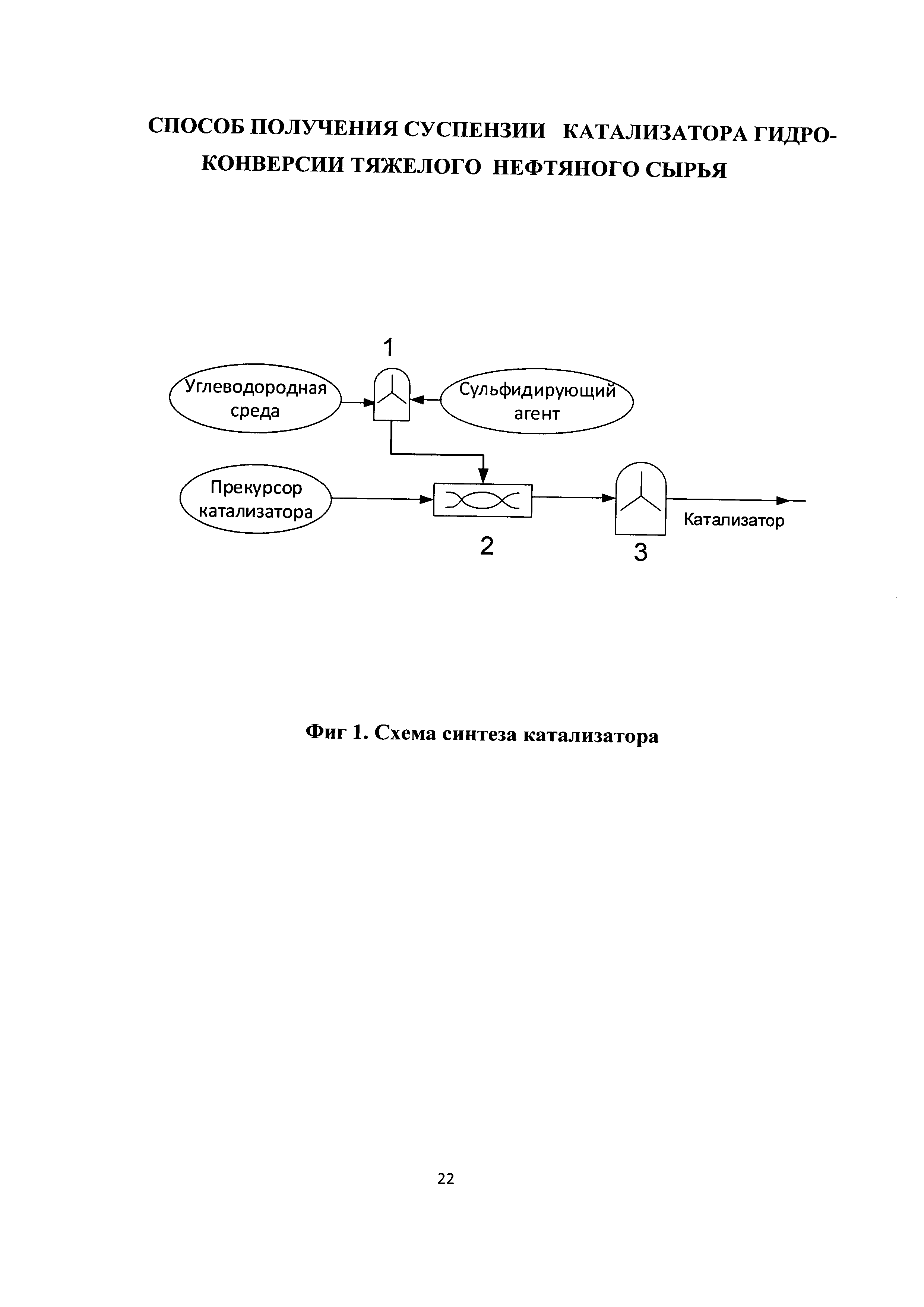 1. Способ получения суспензии катализатора гидроконверсии тяжелого нефтяного сырья, включающий стадии получения гомогенной смеси водного раствора водорастворимого прекурсора катализатора - солей молибдена, никеля или кобальта, и сульфидирующего агента в углеводородной среде, диспергирования смеси с получением обращенной эмульсии и термообработки обращенной эмульсии, отличающийся тем, что в качестве сульфидирующего агента используют элементную серу при атомном отношении серы к никелю, молибдену или кобальту S/Me=1.5-2.0, получение указанной гомогенной смеси осуществляют путем предварительного растворения серы в углеводородной среде, содержащей асфальтены, при отношении их содержания парафинонафтеновым углеводородам более 0,16 и к ароматическим углеводородам более 0.08, при температуре 130°С, последующего добавления в указанную среду водного раствора прекурсора катализатора и гомогенизации при температуре 60-90°С, а термообработку обращенной эмульсии осуществляют в течение 2-8 ч при температуре 280-370°С с получением суспензии, содержащей стабилизированные в углеводородной среде частицы катализатора размером не более 350 нм. 2. Способ по п. 1, отличающийся тем, что в качестве водорастворимого прекурсора катализатора используют парамолибдат аммония.