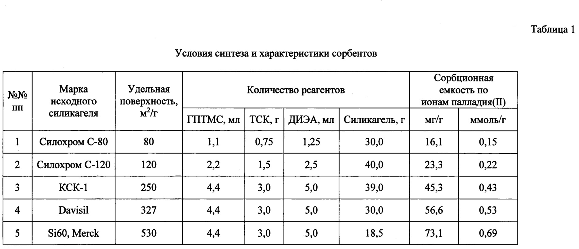 Изобретение относится к области получения и применения материалов для сорбционного извлечения ценных элементов из водных растворов и может быть использовано для сорбции ионов палладия из растворов различного состава. Известен сорбент на основе силикагеля, модифицированный 3-аминопропилтриэтоксисиланом и содержащий привитые группы -(CH2)3NH2, рекомендованный для извлечения ионов палладия из продуктов переработки катализаторов (Патент РФ на изобретение №2442833, опубликовано 20.02.2012). Сорбент обеспечивает количественное извлечение палладия из растворов, содержащих ионы меди, магния и алюминия. Сорбент не позволяет отделить палладий(II) от платины(IV). Элюирование палладия(II) осуществляют 5%-ным раствором тиомочевины в 0,1 М HCl, степень десорбции не превышает 90%. Известен сорбент для извлечения палладия на основе силикагеля с привитыми меркаптогруппами -(CH2)3SH (Патент РФ на изобретение №2187566, опубликовано 20.08.2002). Однако данный сорбент является практически одноразовым и рекомендован для фотометрического определения палладия. Известен сорбент, содержащий силикагель с привитыми группами фенилтиомочевины или аллилтиомочевины, рекомендованный для извлечения палладия из кислых хлоридных растворов сложного состава (Патент РФ на изобретение №2103394, опубликовано 27.01.1998). Однако известный сорбент не проявляет селективности по отношению к ионам палладия для растворов, содержащих платину, степень извлечения обоих металлов составляет 95-99%. Кроме того, известный способ извлечения палладия не предлагает эффективного элюента, что ограничивает возможность многократного использования данного сорбента. Известен сорбент на основе силикагеля с привитыми молекулами 2-амино-3-(бензтиазол-2-ил)пирроло[2,3-b]хиноксалина и его использование для связывания металлов платиновой группы (Авторское свидетельство СССР на изобретение №1623685, опубликовано 30.01.1991). Однако полнота извлечения палладия из солянокислых растворов на известном сорбенте не превышает 75%. Для связывания ионов платиновых металлов предложены сорбенты на основе силикагеля с привитыми молекулами следующего состава: -(CH2)3OCH2CH(OH)CH2SR (Патент США №5190661, опубликован 02.03.1993; Патент США №5318846 опубликован 07.06.1994; Патент РФ на изобретение №2116828, опубликовано 10.08.1998). Сорбент с R=4-NO2C6H4 позволяет извлекать более 99% палладия(II) из растворов, содержащих ионы платины(II), меди(II), никеля(II) и железа(III), сорбцию осуществляют из 9 М HCl, количественную десорбцию - 5 М HBr. Сорбенты с R=4-ClC6H4, 3-ClC6H4, 2-ClC6H4, 3,4-Cl2C6H3 или 2,6-Cl2C6H3 позволяют извлекать более 99% палладия(II) из растворов, содержащих ионы платины(II), меди(II), никеля(II) и железа(III), сорбцию осуществляют из 9 М HCl, количественную десорбцию - 0,5 М раствором K2SO3. Таким образом, достигается разделение палладия(II) и платины(II), тогда как в технологических растворах платина присутствует в степени окисления +4. Другим недостатком известных сорбентов являются крайне жесткие условия сорбции: селективное извлечение палладия достигается практически в концентрированной HCl. Наиболее близким по технической сущности и достигаемому результату (прототипом) является сорбент на основе силикагеля, содержащий привитые группы следующего состава: -(СН2)3ОСН2СН(ОН)CH2SCH2CH2OH (Патент РФ на изобретение №2354448, опубликовано 10.05.2009). Сорбент обеспечивает количественное (более 99%) извлечение ионов палладия(II) из 0,