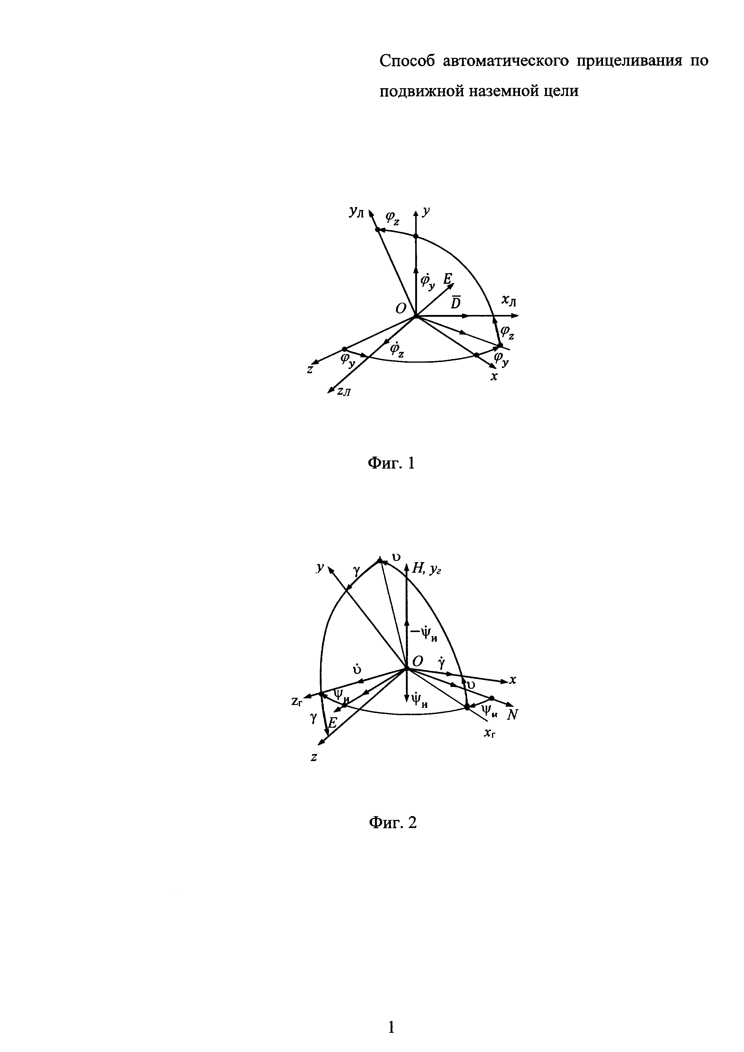 Способ автоматического прицеливания по подвижной наземной цели, включающий реализацию процедуры привязки к цели и определение ее ориентации по непрерывным измерениям текущих углов визирования цели и ограниченному во времени (не более 3 с) измеряемому лазерным дальномером (ЛД) массиву текущей дальности до нее, каждое из измерений которого с использованием измеряемой инерциальной навигационной системой (ИНС) угловой и навигационной информации приводят к осям подвижной системы координат (ПСК) в проекциях, на оси которой определяют составляющие ее абсолютной угловой скорости и составляющие абсолютной линейной скорости движения объекта, а на основе кинематических дифференциальных уравнений относительного движения цели в проекциях на оси ПСК реализуют математическую процедуру оптимальной фильтрации и идентификации дискретно обновляющейся последовательности составляющих дальности, оценивают оптимальные компоненты дальности до цели, компоненты ее абсолютной линейной скорости и ускорения, по завершении работы которой оптимальный фильтр-идентификатор перенастраивают и переводят в режим краткосрочного, на время не более 10 с, прогноза его параметров, при этом расчет поправок на стрельбу осуществляют с началом процедуры привязки к цели, текущие значения которых в виде символа подвижной прицельной марки (ППМ) индицируют на экране индикатора на лобовом стекле (ИЛС) летчика, и управляя объектом, в зависимости от режима применения неуправляемого авиационного средства поражения (АСП), совмещают ППМ либо с реальной целью, либо в режиме целеуказания (ЦУ) от оператора - с неподвижным прицельным перекрестием (НПП) ИЛС и, удерживая ее в одном из этих положений, нажимают боевую кнопку (БК) и осуществляют прицельную стрельбу, отличающийся тем, что с началом процедуры привязки к цели рассчитываемые поправки на стрельбу Δϕy, Δϕz, определяющие текущие угловые координаты расчетной точки падения боеприпаса, используют для формирования параметров необходимых для расчета потребных для прицельной стрельбы углов ориентации объекта, при этом в варианте применения авиационных средств поражения (АСП) летчиком берут их с обратным знаком -Δϕy, -Δϕz, а в варианте применения АСП по ЦУ от оператора определяют как результат их сравнения с текущими углами визирования цели ϕy-Δϕy, ϕz-Δϕz, после чего указанные параметры в совокупности с текущими значениями углов эволюции объекта υ, γ, ψи используют для формирования текущих значений потребных для прицельной сопроводительной стрельбы углов ориентации объекта (потребное значение крена γП принимают равным нулю), текущие значения которых сравнивают с текущими углами υ, γ, ψи эволюции объекта и формируют тем самым постоянно обновляющуюся последовательность входных сигналов оптимального фильтра-идентификатора, который синтезируют на основе дискретной процедуры оптимальной фильтрации и идентификации и в соответствии с дифференциальными уравнениями, описывающими характер изменения текущей угловой ориентации объекта относительно изменяющегося во времени, потребного для прицельной стрельбы положения объекта с параметрами состояния системы