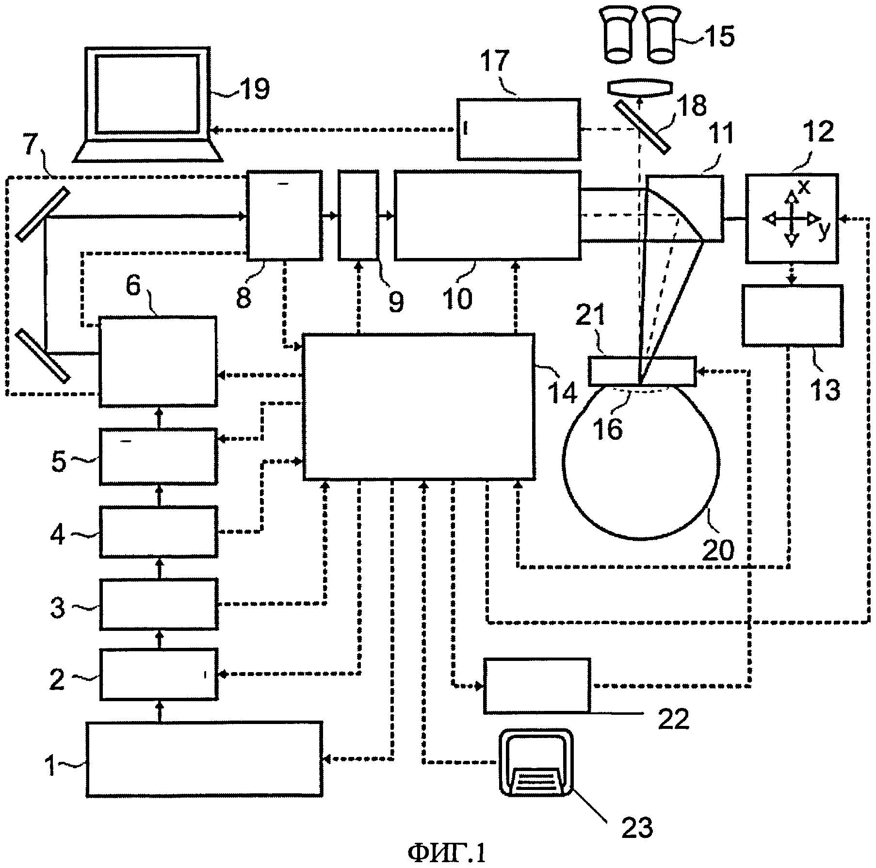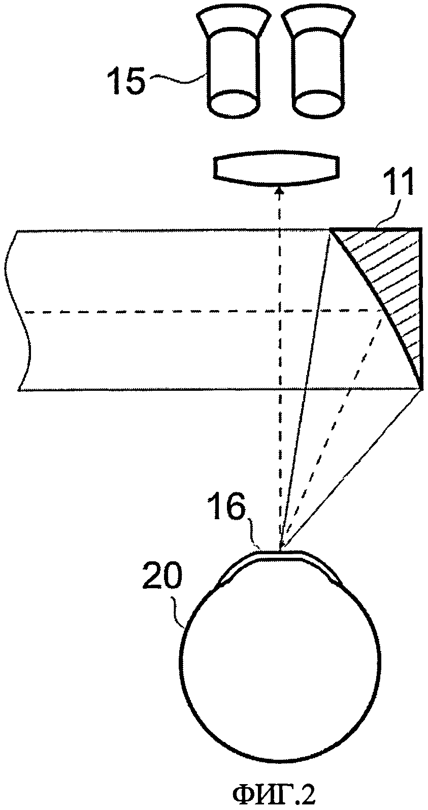 1. Офтальмохирургическая лазерная система, содержащая фемтосекундный лазер, систему доставки излучения, сканирующий модуль для перемещения фокальной точки согласно выбранному алгоритму, систему фокусировки, оптические элементы которой имеют определенный размер, проекция которых на плоскость операции имеет границы, систему управления, отличающаяся тем, что разрешенные фокальные точки системы фокусировки расположены вне проекции оптических элементов системы на плоскость операции, отстоят от границы проекции хотя бы на два размера фокального пятна и доступны для наблюдения в процессе операции. 2. Офтальмохирургическая лазерная система по п.1, отличающаяся тем, что угол падения центральной части излучения фемтосекундного лазера на плоскость операции отличается от нормали на угол, больший половины апертуры системы фокусировки не более чем на 2°. 3. Офтальмохирургическая лазерная система по п.2, отличающаяся тем, что основным элементом системы фокусировки является внеосевое параболическое зеркало с числовой апертурой более 0,35 и углом отклонения менее 90°. 4. Офтальмохирургическая лазерная система по п.3, отличающаяся тем, что система содержит пилотный лазер. 5. Офтальмохирургическая лазерная система по пп.3, 4, отличающаяся тем, что система содержит операционный микроскоп.