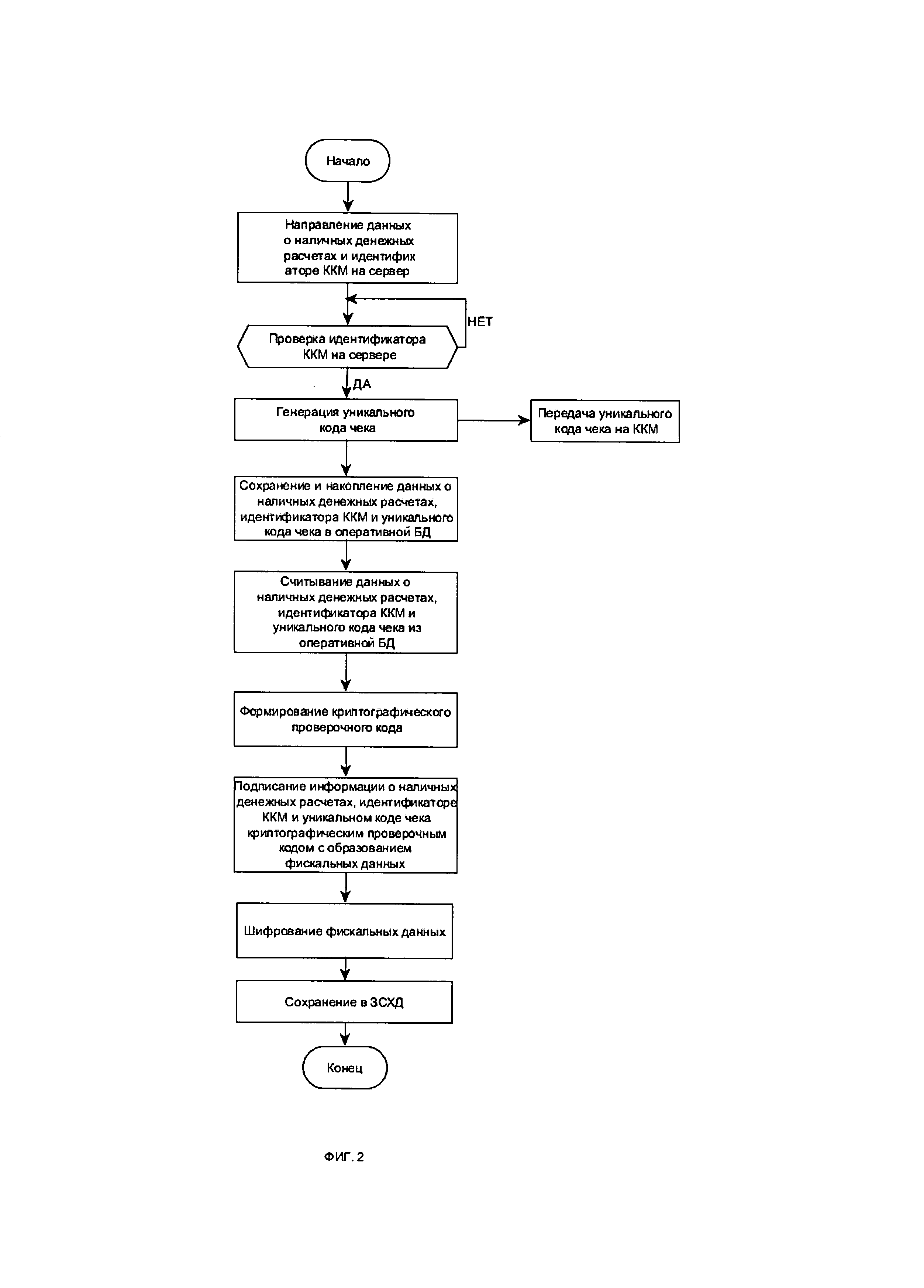 Изобретение относится к системам обработки данных о наличных денежных расчетах и/или расчетах с использованием платежных карт, включающих несколько электронных контрольно-кассовых машин, взаимодействующих с центральным устройством для обработки информации - сервером оператора фискальных данных. Известен способ контроля за выручкой электронных кассовых аппаратов, включающий направление идентификатора и данных по каналу связи, проверку идентификатора с последующим принятием решения о разрешении или запрете доступа, при разрешении доступа накопление и сохранение данных о наличных денежных расчетах в оперативной базе данных (патент РФ №2106015, G07G 1/00, G07G 1/12, 1998 год). Недостатком известного способа является то, что данные о выручке собираются на самой контрольно-кассовой машине, что увеличивает возможность несанкционированного доступа к данным о выручке и искажения данных о выручке. В основу изобретения поставлена задача создания способа обработки данных о наличных денежных расчетах и/или расчетах с использованием платежных карт на сервере оператора фискальных данных при работе множества контрольно-кассовых машин с функцией передачи информации, при выполнении которого обеспечивается защищенность базы данных о наличных денежных расчетах и/или расчетах с использованием платежных карт. Технический результат, на достижение которого направлено заявленное изобретение, состоит в повышении уровня защиты данных о наличных денежных расчетах и/или расчетах с использованием платежных карт за счет того, что уникальный код кассового чека генерируется сервером и данные о наличных денежных расчетах и/или расчетах с использованием платежных карт для каждой контрольно-кассового машины переносятся на сервер оператора фискальных данных и сохраняются там в зашифрованном виде. Ниже перечислены понятия, используемые в следующем смысле. Кассовый чек - первичный учетный документ, выполненный контрольно-кассовой машиной в момент оплаты товара (работы, услуги) на бумажном носителе и/или в форме электронного документа, подтверждающий факт осуществления между пользователем и покупателем (клиентом) наличных денежных расчетов и/или расчетов с использованием платежных карт, содержащий сведения об этих расчетах. Контрольно-кассовая машина с функцией передачи информации - это счетно-суммирующее вычислительное устройство, предназначенное для регистрации или учета денежных расчетов при приобретении товаров или оказании услуг и обеспечивающее хранение информации по указанным расчетам при выполнении торговых операций или оказании услуг без создания защищенных фискальных данных, то есть без фискальной памяти, а также обеспечивающее передачу указанной информации в неизменном электронном виде на сервер оператора фискальных данных. Оператор фискальных данных - юридическое лицо, имеющее право на обработку фискальных данных, имеющее соответствующие технические средства и самостоятельно осуществляющее обработку фискальных данных. Обработка фискальных данных - любое действие (операция) или совокупность действий (операций), совершаемых с использованием средств автоматизации с информацией о наличных денежных расчетах и/или расчетах с использованием платежных карт с уникальным кодом чека, включая сбор, запись, систематизацию, нак