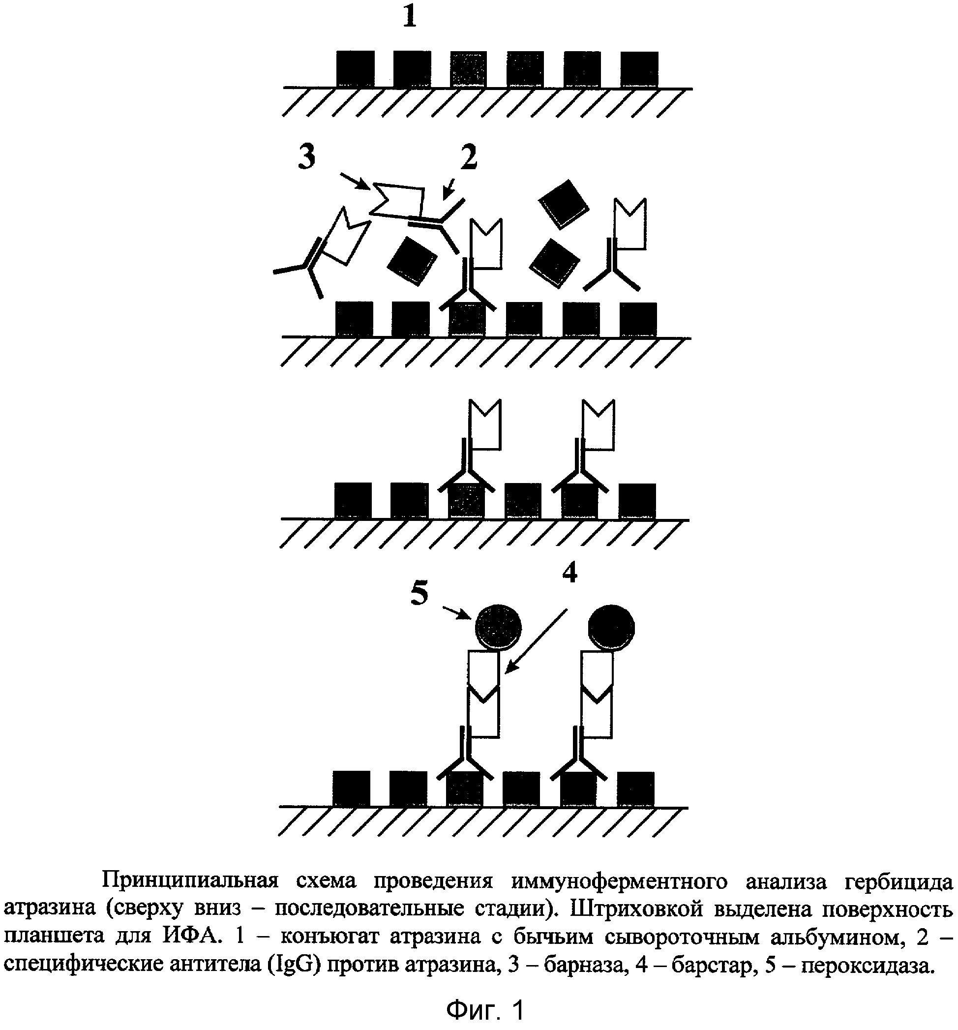 представлена на фиг.1. 100 мкл раствора конъюгата атразина с бычьим сывороточным альбумином (0,5 мкг/мл, в ФБ - 50 мМ К-фосфатном буфере, рН 7,4, с 0,1 М NaCl) добавляли в лунки полистиролового