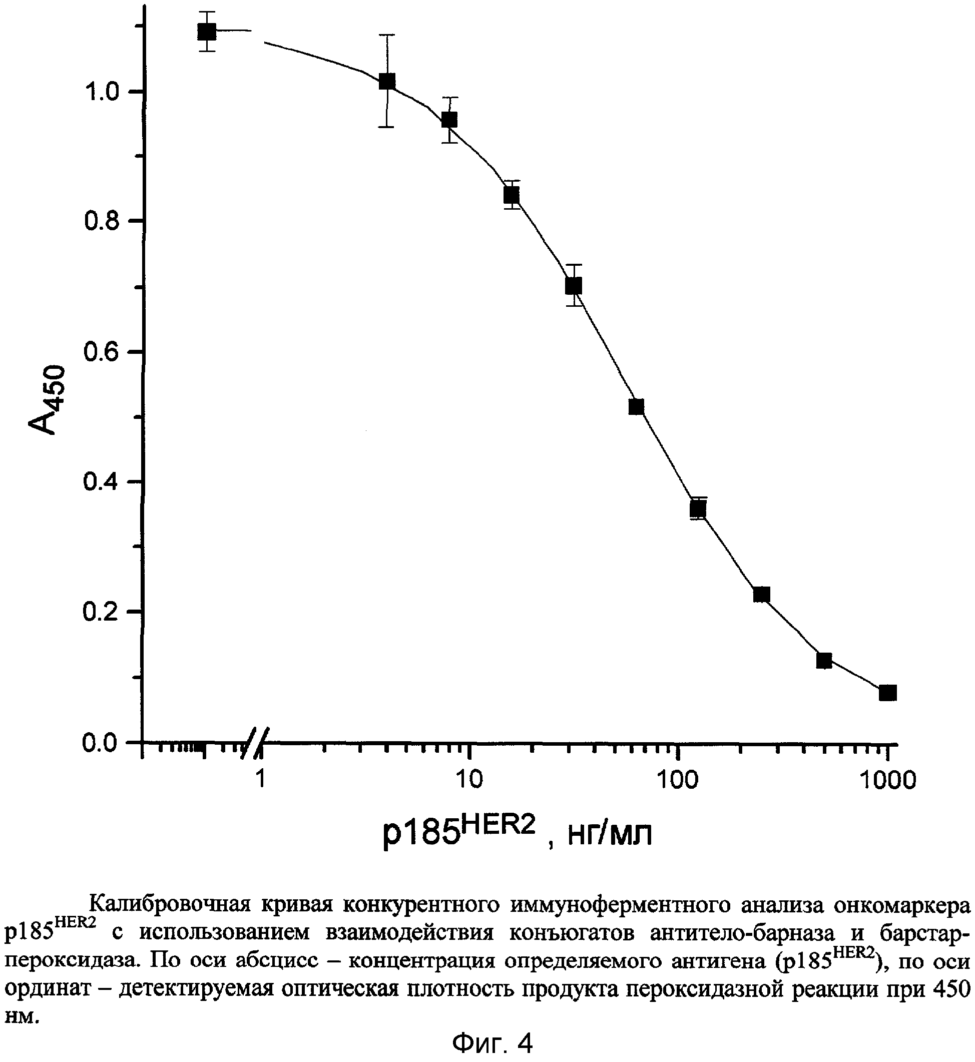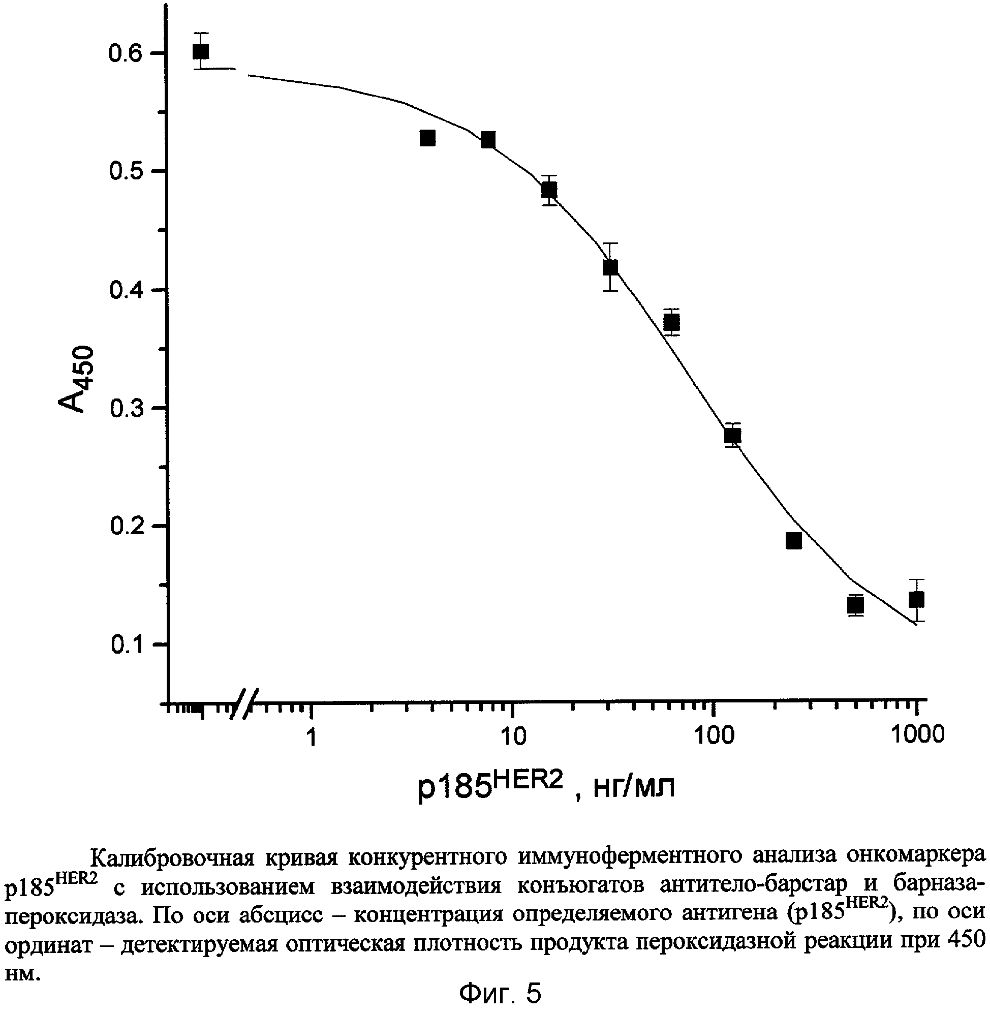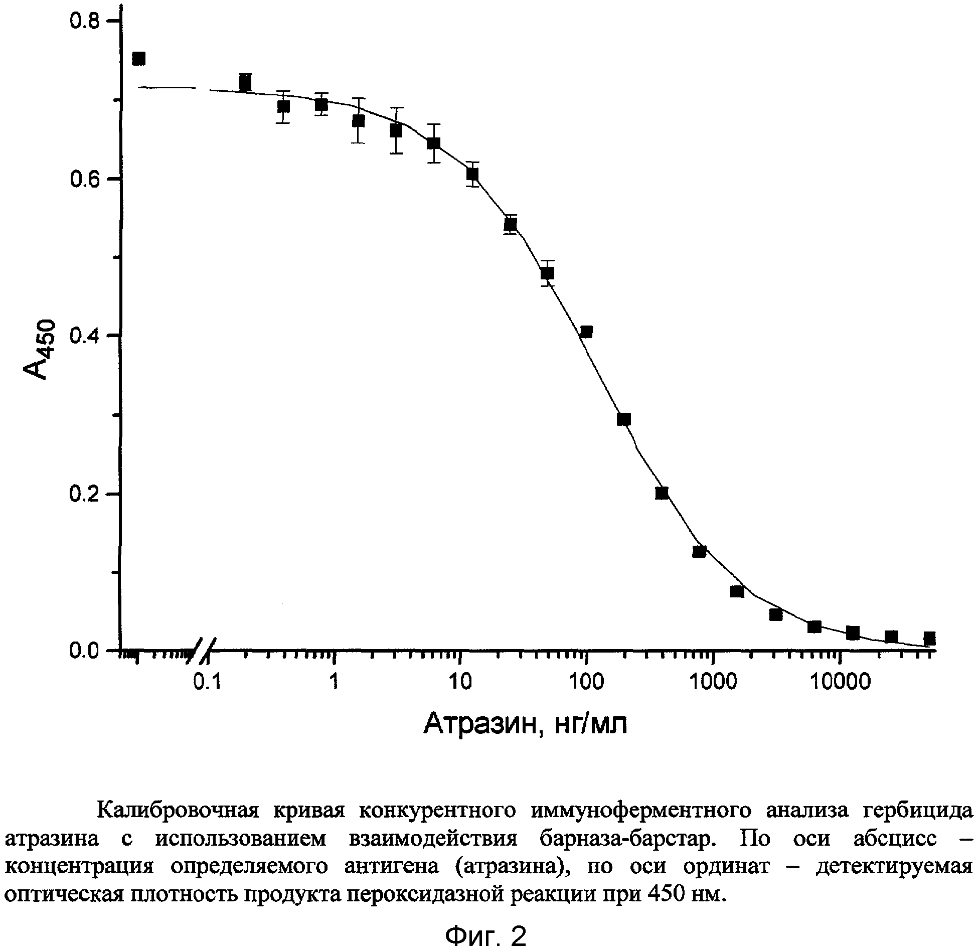 серной кислоты. Оптическую плотность образовавшихся окрашенных продуктов регистрировали при 450 нм. Полученная калибровочная кривая конкурентной иммунодетекции представлена на фиг.2.
