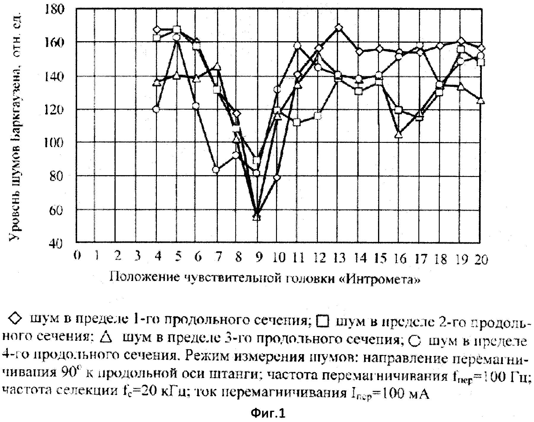Область техники, к которой относится изобретение. Изобретение относится к области эксплуатации нефтедобывающего оборудования, а именно, к способу и устройству, применяемым для контроля состояния насосных штанг нефтедобывающих скважин. Уровень техники. Для раннего обнаружения усталостных микротрещин и видимого контроля состояния штанги на наличие микротрещин исследован магнитолюминесцентный метод неразрушающего контроля. Для подтверждения эффективности метода был выполнен комплекс работ по усталостным испытаниям штанг в коррозионной среде, приближенно моделирующей реальные условия эксплуатации. Рассмотрены и исследованы два способа осуществления магнитолюминесцентного метода: сухой и мокрый. Сухой и мокрый способы контроля были осуществлены с применением магнитолюминесцентных сухих порошков ЛЮМАГПОР-5 (ТУ6-09-5296-86) и LY-2500 фирмы "Helling" и суспензий на их основе. При опробовании мокрого способа исследованы три варианта суспензий: с порошком LY-2500 - два состава в разных соотношениях и с порошком ЛЮМАГПОР-5 - один состав. В процессе исследования для выявления эффективного варианта сравнивалась протяженность выявленных микротрещин и наличие фона на образцах. Из данных способов контроля наиболее оптимальным для контроля поверхности штанги является магнитолюминесцентный контроль в приложенном поле электромагнита с использованием суспензии на основе порошка LY-2500 фирмы «Helling». Установлено, что применение порошка LY-2500 фирмы «Helling» позволяет выявлять трещины на рабочих стандартных образцах с шириной их раскрытия 1 мкм, что соответствует требованиям ГОСТ 21105-87. Отработка мокрого способа магнитолюминесцентного метода контроля в производственных условиях была осуществлена в период проведения усталостных испытаний фрагмента насосной штанги. После 6081500 циклов нагружения фрагмента штанги магнитолюминесцентным методом была выявлена трещина у основания штанги, состоящая как бы из двух трещин суммарной протяженностью 8 мм. При достижении 7032600 циклов нагружения протяженность трещины составила 16 мм. Таким образом, магнитолюминесцентный метод контроля насосной штанги в приложенном поле электромагнита позволяет эффективно диагностировать поверхностные дефекты типа микро- и макротрещин. Для прогнозирования эксплуатационных возможностей насосных штанг как новых, так и бывших в эксплуатации существует метод измерения шумов Баркгаузена, обладающий высокой чувствительностью к структурным изменениям ферромагнитного материала. При осуществлении данного метода проводятся исследования фрагментов насосных штанг с маркировкой 19НЗА 001 и 19Н2А 28Н1 из стали 20Н2М производства Очерского машзавода без нагрузки и при циклическом нагружении в коррозионной среде. Для установления эксплуатационных возможностей материала насосной штанги в процессе коррозионно-усталостных испытаний ее фрагмента выполняются измерения шумов Баркгаузена при приложении к штанге продольной растягивающей нагрузки. В процессе исследований фрагментов под нагрузкой выявлено, что уменьшение амплитуды шумов Баркгаузена связано с разрушением кристаллической решетки материала штанги, зарождением и развитием микро- и макронесплошностей с наружной поверхности фрагмента. Распределение шумов Баркгаузена вдоль фрагмента насосной штанги Очерского машзав