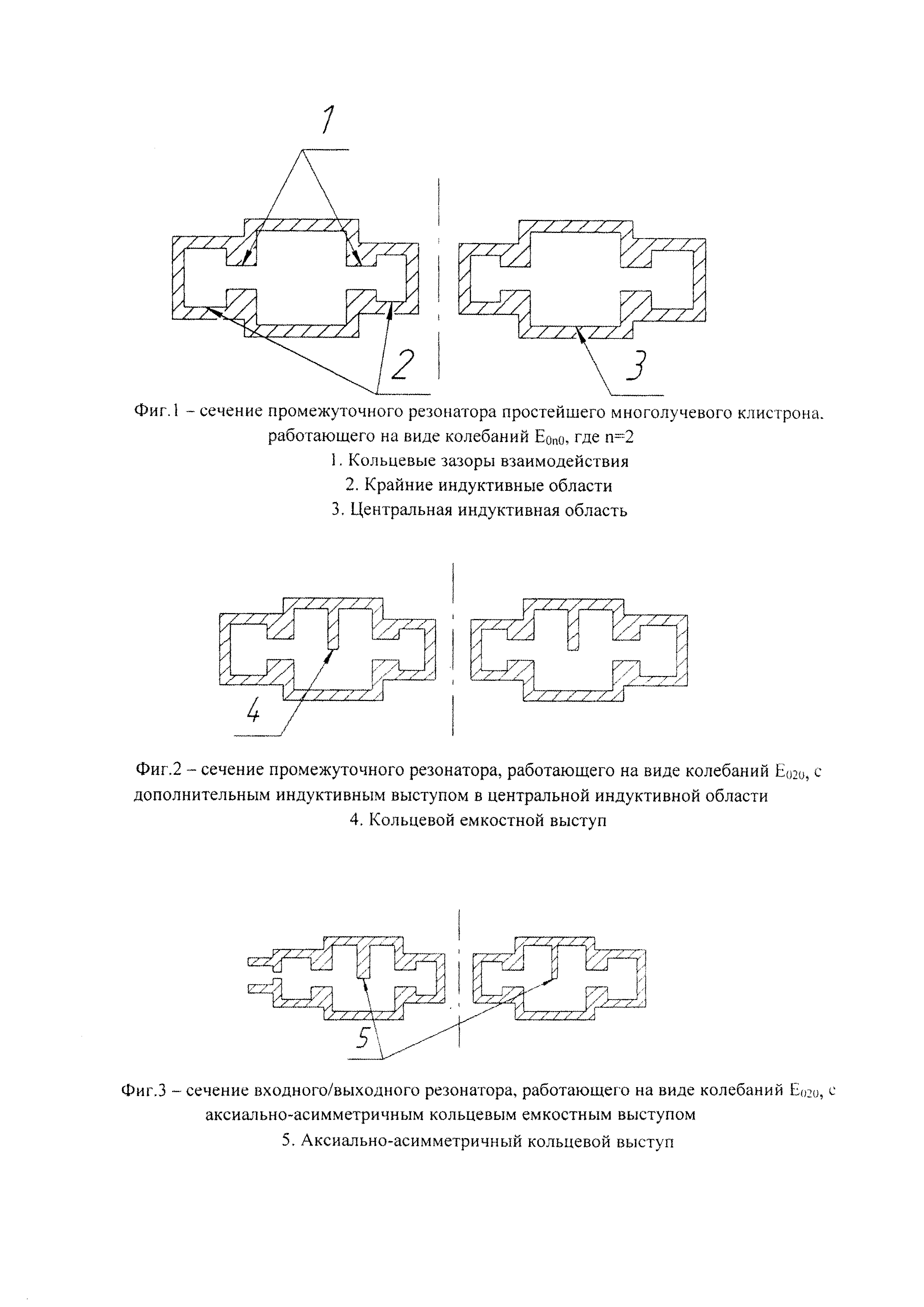 1. Многолучевой клистрон, использующий кольцевые резонаторы, отличающийся тем, что кольцевые резонаторы работают на высшем виде колебаний E0n0 и содержат n кольцевых емкостных зазоров, между которыми расположены кольцевые индуктивные области, где n=2, 3. 2. Многолучевой клистрон по п. 1, отличающийся тем, что во всех или некоторых индуктивных областях кольцевых резонаторов содержатся дополнительные кольцевые выступы в областях нулевого электрического поля на рабочем виде колебаний. 3. Многолучевой клистрон по п. 1 или 2, отличающийся тем, что его входной и выходной резонаторы связаны с внешней нагрузкой аксиально-асимметричными элементами связи. 4. Многолучевой клистрон по п. 1 или 2, отличающийся тем, что его входной и выходной резонаторы во всех или некоторых индуктивных областях содержат один или несколько закорачивающих штырей, соединяющих торцевые крышки резонатора.
