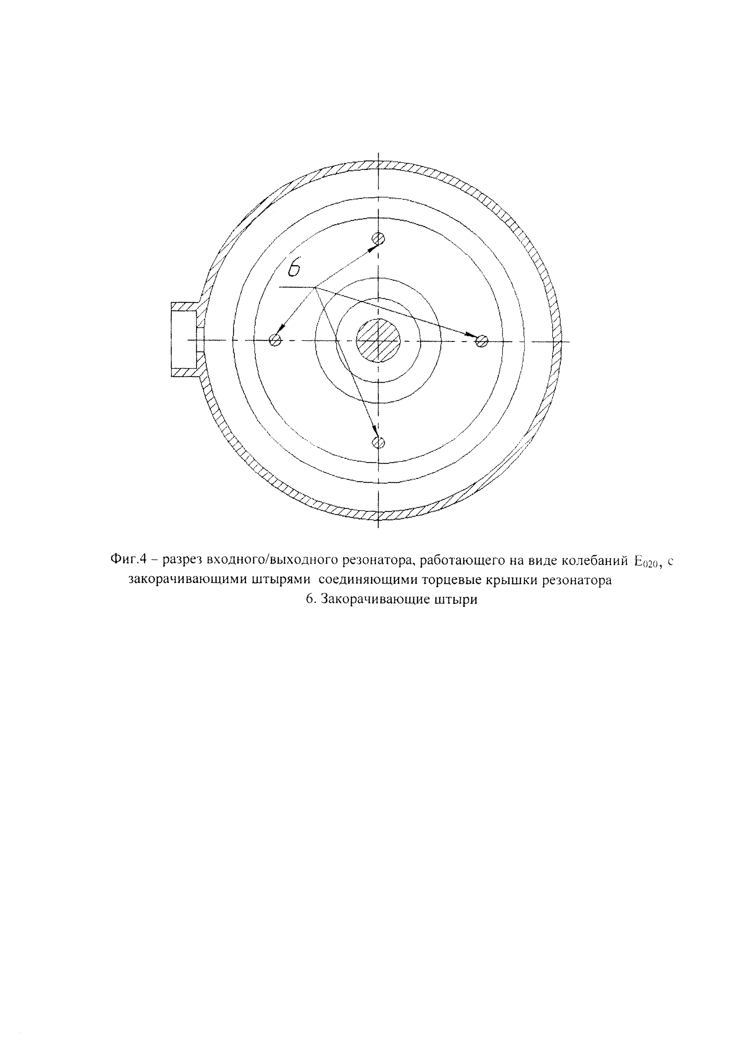 Изобретение относится к сверхмощной радиоэлектронике, в частности к клистронам с выходной мощностью мегаваттного уровня. Традиционной для клистронов является однолучевая конструкция с тороидальными резонаторами [1]. Однако серьезным недостатком однолучевых клистронов с выходной мощностью мегаваттного уровня является высокое напряжение, порядка 100 кВ и более. Такая конструкция требует крупногабаритной массивной защиты персонала от жесткого рентгеновского излучения, а также применения масляной изоляции наружных поверхностей электронной пушки клистрона. Все это затрудняет использование мощных клистронов в мобильных и перемещаемых конструкциях аппаратуры. Эффективным способом снижения напряжения клистрона в несколько раз, а также повышения его КПД и рабочей полосы частот, является применение многолучевой конструкции с количеством лучей 6-50. Однако применение тороидальных резонаторов в сверхмощных многолучевых клистронах (МЛК) связано с проблемой обеспечения радиальной равномерности СВЧ поля в зазоре взаимодействия [2]. Обычно центры пролетных каналов в МЛК располагаются на нескольких концентрических окружностях. В случае, когда диаметр зазора взаимодействия тороидального резонатора превышает 0,2-0,25λ0, где λ0 - длина рабочей волны в свободном пространстве, в зазоре возникает значительная радиальная неравномерность поля по различным рядам пролетных каналов, что резко снижает КПД клистронов. Таким образом, в сверхмощных МЛК с большой суммарной площадью катодов, работающих в сантиметровом диапазоне длин волн, и особенно высокочастотной его части, применение тороидальных резонаторов невозможно. Чтобы увеличить число каналов, было предложено перейти на МЛК (прототип) с резонаторами кольцевого типа, работающими на низшем виде колебаний E0n0 [2]. Пролетные каналы при этом могут располагаться по центральной линии емкостного зазора, соответствующей максимуму электрического СВЧ поля. При этом обеспечивается максимальная радиальная равномерность поля по сечениям пролетных каналов. Однако при увеличении числа пролетных каналов и соответственно длины емкостного зазора к рабочему (основному) виду колебаний приближаются ближайшие паразитные виды, имеющие азимутальные вариации поля, согласно формуле где λв - длина волны в волноводе; λ0 - длина волны в свободном пространстве; λкр - критическая длина волны. Для паразитного вида колебаний Е012 условием резонанса будет λв=πD, где D - диаметр кольцевого зазора. Из приведенной формулы очевидно, что разница по частоте между рабочим и паразитным видами колебаний падает как с ростом диаметра емкостного зазора, так и с ростом рабочей частоты, что делает неприменимым такой тип резонаторов при дальнейшем повышении рабочей частоты и (или) мощности [3]. Другим вариантом является расположение пролетных каналов на нескольких концентрических рядах по обе стороны от центральной линии емкостного зазора, что существенно уменьшает диаметр кольца. Однако при этом поле в пролетных каналах при дальнейшем увеличении мощности и (или) частоты МЛК становится неравномерным в радиальном направлении. К основным недостаткам этой конструкции, как показано выше, относится неравномерность электрического поля в радиальном или азимутальном направлении, а также близость высших видов колебаний, при уве