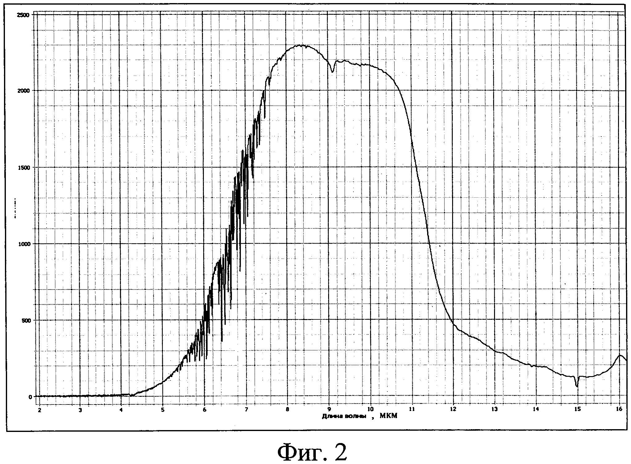 Излучатель инфракрасный относится к источникам инфракрасного излучения, применяемым в оптических инфракрасных абсорбционных газоанализаторах. Параметры оптического инфракрасного абсорбционного газоанализатора в значительной степени определяются характеристиками источника инфракрасного излучения. Для оптимального применения инфракрасного газоанализатора при анализе газов, спектры поглощения которых расположены в длинноволновом участке спектра 8-11 микрометров, например хладонов, отравляющих, взрывчатых, наркотических и др. веществ необходим источник инфракрасного излучения, максимум спектра излучения которого расположен в этой области спектра. В инфракрасных газоанализаторах находят широкое применение излучатели, в которых нагретое тело является источником инфракрасного излучения. Спектр излучения таких излучателей близок к спектру излучения черного тела (Криксунов Л.З. Справочник по основам инфракрасной техники. М., Сов. радио, 1978. УДК 621.384..3(031). Глава 3. Источники инфракрасного излучения). Применение инфракрасного излучателя со спектром излучения, близким к спектру излучения черного тела, является неоптимальным для газоанализаторов, работающих в длинноволновой области спектра, вследствие того, что рабочая температура излучателей в инфракрасных газоанализаторах обычно находится в пределах 600-900°С, максимум излучения такого излучателя, в соответствии с законом Вина, будет находиться в диапазоне 3-4 микрометров. При этом максимум излучения сдвинут в коротковолновую область спектра по отношению к участку спектра, где расположены линии поглощения вышеуказанных анализируемых газов и плотность спектра излучения в длинноволновом участке спектра будет значительно меньше, чем в зоне максимума спектра излучения, что снижает эффективность излучателя в длинноволновом участке спектра и затрудняет достижение высокой чувствительности и избирательности инфракрасного газоанализатора (Р.Хадсон. Инфракрасные системы. Издательство «Мир», 1972. УДК 621.384.3. Глава 2. Инфракрасное излучение, стр.22, Фиг 2.2. Спектральная плотность излучения абсолютно черного тела при некоторых температурах). Цель изобретения - повышение эффективности и селективности инфракрасного излучателя для инфракрасного газоанализатора, работающего в длинноволновом участке спектра. Эта цель достигается тем, что в качестве источника излучения используется нагретое тело, оптический материал которого имеет спектр поглощения, расположенный в области спектров поглощения анализируемых газов. В соответствии с законом Кирхгофа такое тело излучает также в той области, где имеется поглощение спектра. Поскольку спектр излучения такого излучателя занимает ограниченную полосу спектра излучения, определяемую оптическими свойствами материала, из которого изготовлено излучающее тело, то, по определению, такой излучатель называется селективным. В качестве оптического материала для излучателя, предназначенного для работы в длинноволновом участке инфракрасного спектра 8-11 микрометров, применен монокристаллический сапфир - Al2O3, оптические свойства которого применимы для выполнения поставленной задачи. Конструктивно излучатель представляет собой тонкий диск толщиной несколько десятых долей миллиметра, установленный по оси оптического канала, с распо