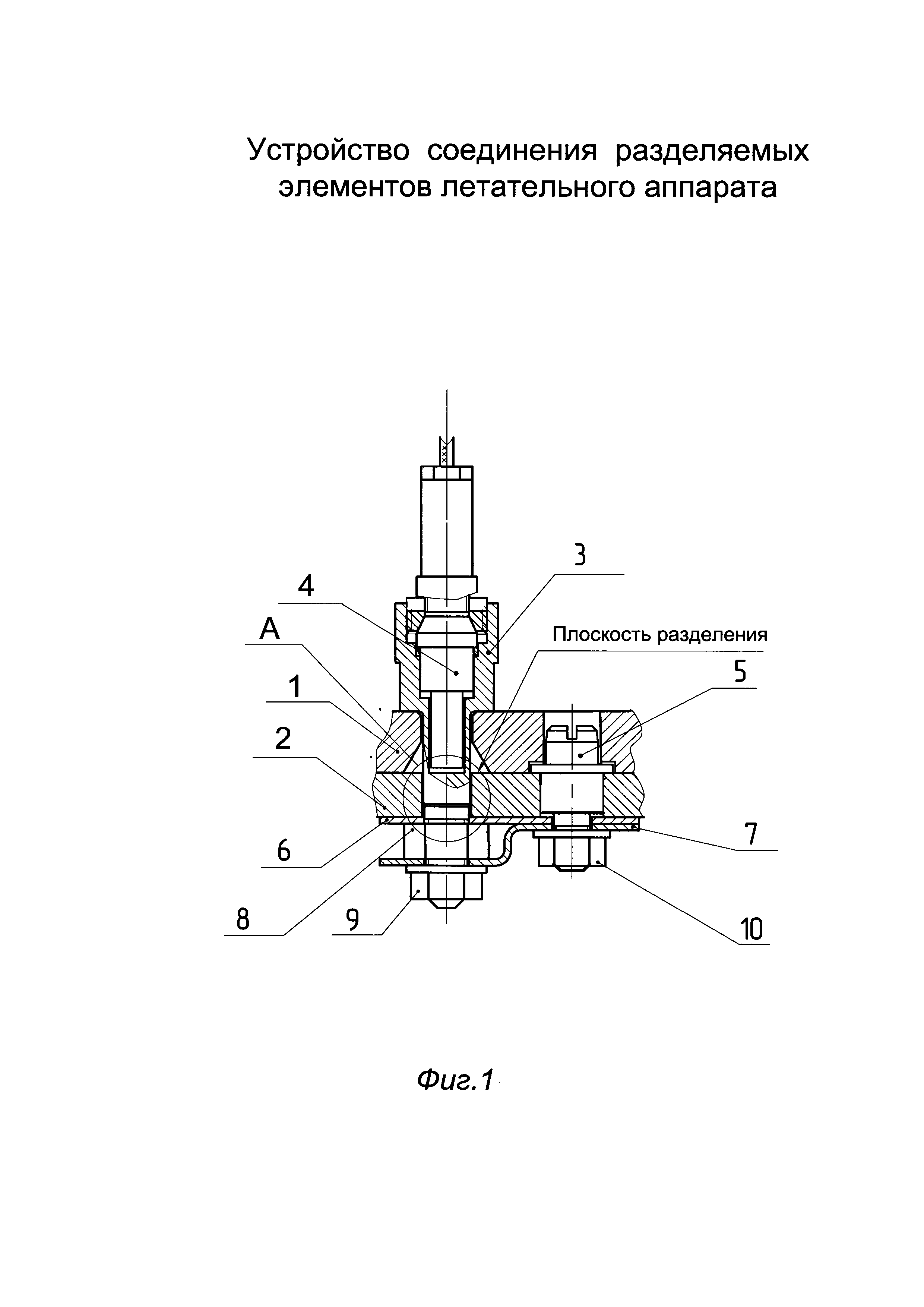 1. Устройство соединения разделяемых элементов летательного аппарата, содержащее стыковочный фитинг и отделяемый фитинг, расположенные по плоскости стыка, в сквозные отверстия которых установлен пироболт с крепежной гайкой и плоской шайбой, отличающееся тем, что устройство дополнительно снабжено изогнутой пластиной, один конец которой жестко закреплен на отделяемом фитинге посредством узла фиксации, а другой контактирует с крепежной гайкой и выполнен с отверстием, через которое пропущена резьбовая часть пироболта, а плоская шайба жестко связана с отделяемым фитингом, при этом пироболт выполнен в двух диаметрах d>d1 с уступом, размещенным между плоскостью стыка и плоской шайбой, с возможностью взаимодействия указанного уступа с плоской шайбой в процессе срабатывания. 2. Устройство по п. 1, отличающееся тем, что узел фиксации плоской шайбы и изогнутой пластины выполнен в виде направляющего штыря, закрепленного на отделяемом фитинге параллельно оси пироболта и взаимодействующего с ответным отверстием, выполненным в стыковочном фитинге.