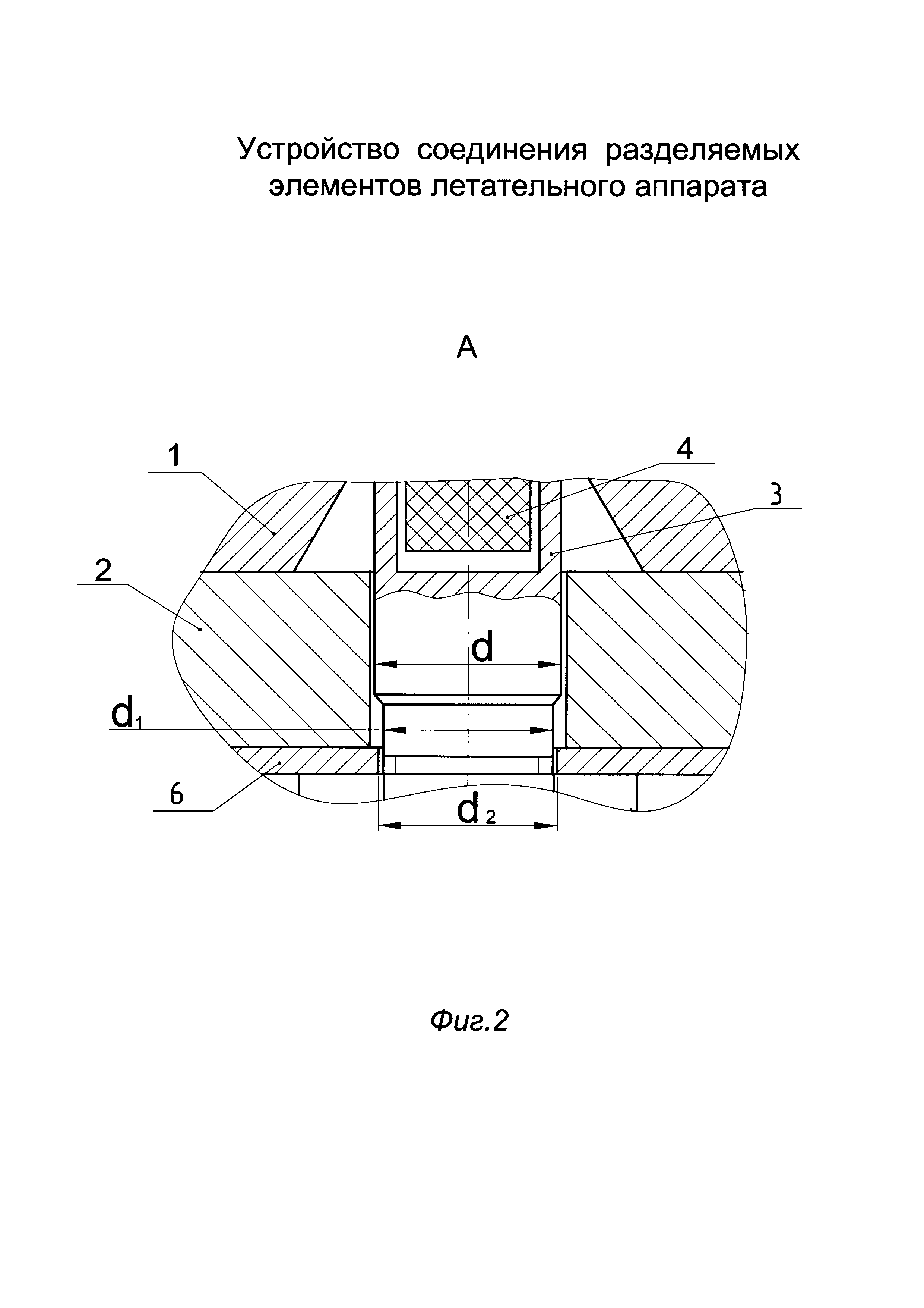 Изобретение относится к области машиностроения, а именно к системам разделения элементов летательных аппаратов. В машиностроении известны системы разделения ступеней летательных аппаратов, содержащие стыковочный фитинг и отделяемый фитинг частей летательного аппарата, расположенные по плоскости стыка, в сквозные отверстия которых установлен пироболт с электродетонатором с крепежной гайкой и плоской шайбой (см., например, Основы конструирования ракет-носителей космических аппаратов. - М.: Машиностроение. 1991, с. 354. Принято за прототип.) Недостатком указанной системы разделения является элемент неопределенности при разделении, способный снизить надежность системы, т.к. при срабатывании пироболта часть его вылетает и может повредить близлежащие элементы конструкции изделия, работоспособность которых еще необходима для функционирования летательного аппарата (кабели, приборы системы управления или телеметрии). Кроме этого при срабатывании пироболта возникает ударная нагрузка, которая может отрицательно влиять на систему управления изделием. Задачей данного изобретения является создание устройства соединения разделяемых элементов летательного аппарата с достижением технического результата в виде повышения эксплуатационных характеристик устройства его частей за счет создания конструкции стыковочных элементов, которые должны защитить изделие от разрушения из-за выпадения части разрывного болта и погашения импульса при его срабатывании. Эта задача решается таким образом, что в устройство соединения разделяемых элементов летательного аппарата, содержащее стыковочный фитинг и отделяемый фитинг частей летательного аппарата, расположенные по плоскости стыка, в сквозные отверстия которых установлен пироболт с крепежной гайкой и плоской шайбой, в соответствии с изобретением дополнительно снабжено изогнутой пластиной, один конец которой жестко закреплен на отделяемом фитинге посредством узла фиксации, а другой контактирует с крепежной гайкой и выполнен с отверстием, через которое пропущена резьбовая часть пироболта, а плоская шайба жестко связана с отделяемым фитингом, при этом пироболт выполнен в двух диаметрах d>d1 с уступом, размещенным между плоскостью стыка и плоской шайбой, с возможностью взаимодействия указанного уступа с плоской шайбой в процессе срабатывания, а узел фиксации плоской шайбы и изогнутой пластины выполнен в виде направляющего штыря, закрепленного на отделяемом фитинге параллельно оси пироболта и взаимодействующего с ответным отверстием, выполненным в стыковочном фитинге. На фиг. 1 показана схема элементов стыка. На фиг. 2 показана укрупненная схема отрывающейся части болта. Устройство соединения разделяемых элементов летательного аппарата содержит (см. фиг. 1) расположенные по плоскости стыка стыковочный фитинг 1 и отделяемый фитинг 2, пироболт 3, электродетонатор 4, направляющий штырь 5, плоскую шайбу 6 и изогнутую пластину 7, закрепленные на пироболте гайками 8, 9, а на отделяемом фитинге 2 вместе с направляющим штырем 5 гайкой 10. В устройстве соединения разделяемых элементов летательного аппарата (см. фиг. 2) отрывающая часть пироболта выполнена в двух диаметрах d>d1 с уступом, размещенным между плоскостью стыка и плоской шайбой 6, а отверстие под пироболт 3 на плоской шайбе выполнено д