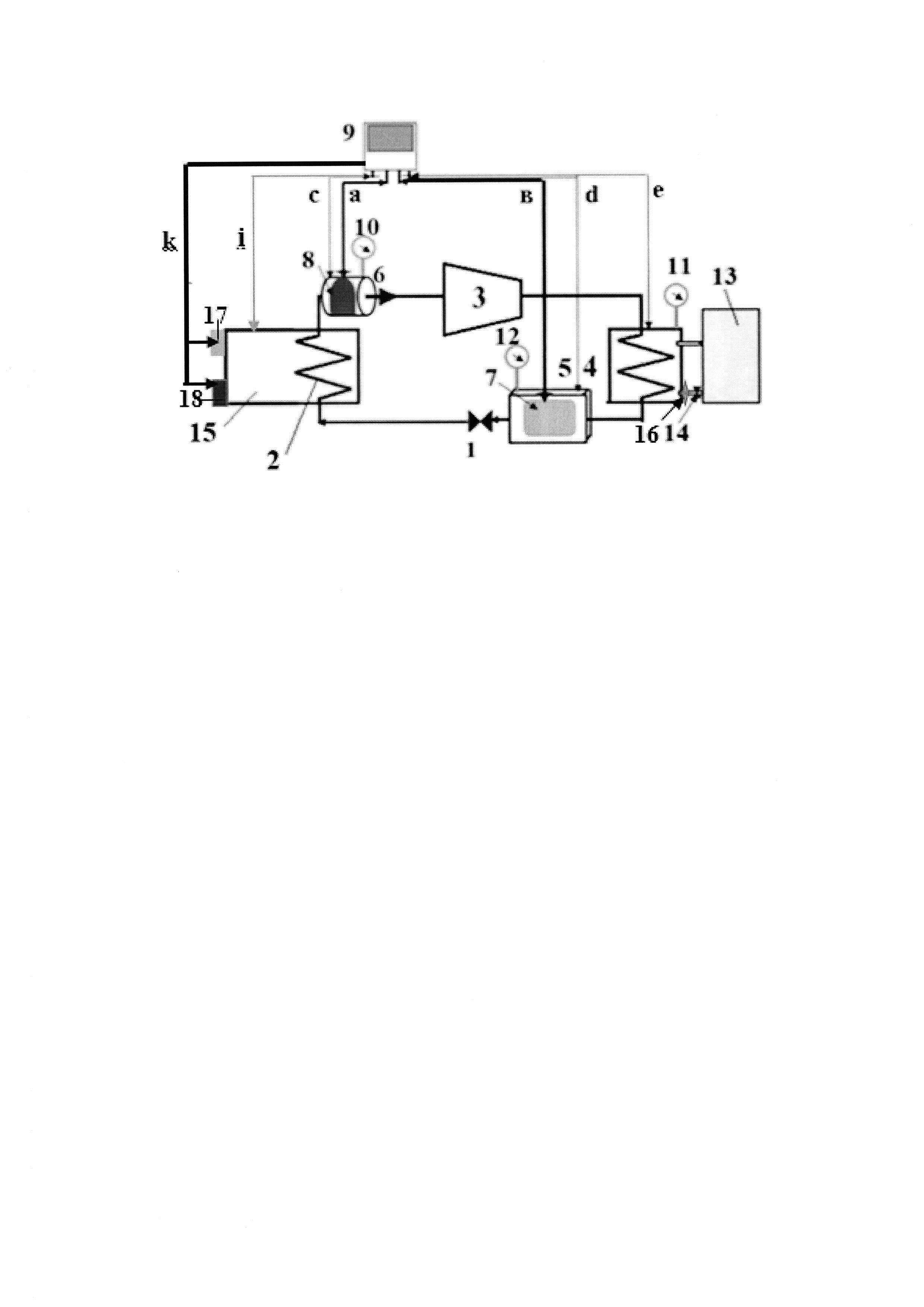 Для оценки эффективности работы тепловых насосов (ТН) необходимо проведение их стендовых термодинамических исследований. Существуют различные конструкции стендов для изучения характеристик ТН. Так, разработан и построен стенд для испытаний ТН [1]. Стенд предназначен для изучения влияния различных теплоносителей на теплотехнические характеристики ТН. В состав стенда входит компрессор, конденсатор, испаритель, ресивер со смотровой трубкой, фильтр-осушитель, электромагнитный вентиль, терморегулирующий вентиль. На стенде установлена система контроля параметров установки в процессе проведения экспериментов и автоматического снятия показаний с датчиков, размещенных на стенде. Однако в данном стенде отсутствует возможность регулирования температуры хладагента на входе в компрессор. Между тем термодинамические характеристики теплоносителя, подающегося в компрессор, в значительной степени влияют на эффективность работы как самого компрессора ТН, так и всей теплонасосной установки (ТНУ). Известна экспериментальная установка для исследования режимов работы ТН [2]. В состав установки входят испаритель, конденсатор, компрессор, ресивер, емкости с охлаждаемой и нагреваемой водой; насос для перекачки воды, дроссельный вентиль и электронагреватели воды. При работе стенда с помощью электронагревателей меняется температура соответственно низкопотенциального теплоносителя в емкости, связанной с испарителем и температура охлаждающей воды (обратки) в емкости, связанной с конденсатором. Температура теплоносителей в испарителе и конденсаторе регистрируется с помощью термометров сопротивлений и моста сопротивлений. Изменяются температуры теплоотдатчика и теплоприемника и на основе выполненных измерений строятся графоаналитические зависимости температуры воды на выходе из конденсатора от температуры теплоотдатчика. В установке не предусмотрена возможность регулирования температуры теплоносителя на входе в компрессор, тем самым существенно ограничиваются объемы исследований, связанных с эффективностью работы компрессора ТН. Наиболее близким техническим устройством к предлагаемому является стенд для испытаний тепловых насосов (авторское свидетельство SU 1416819 А1) [3]. Стенд содержит компрессор, конденсатор, регулирующий вентиль, испаритель, первый, второй и третий циркуляционные контуры для низкопотенциального теплоносителя разной температуры с емкостями и насосами. Стенд также содержит теплообменник-охладитель, установленный в тепловом насосе между конденсатором и вентилем. Такая конструкция обеспечивает возможность работы стенда в широком диапазоне температур низкопотенциального теплоносителя и позволяет определять влияние этих температур на эффективность ТН. Переход на новый температурный режим приводит к изменению температуры конденсации и испарения рабочего тела в конденсаторе и испарителе. Однако конструкция стенда не позволяет осуществлять регулирование температуры рабочего тела, поступающего в компрессор ТН. В результате значительно сокращаются возможности исследования и поиска оптимальных режимов работы компрессора. Задачей изобретения является обеспечение возможности регулирования и управления параметрами теплоносителя как на выходе из конденсатора, так и на выходе из испарителя ТН