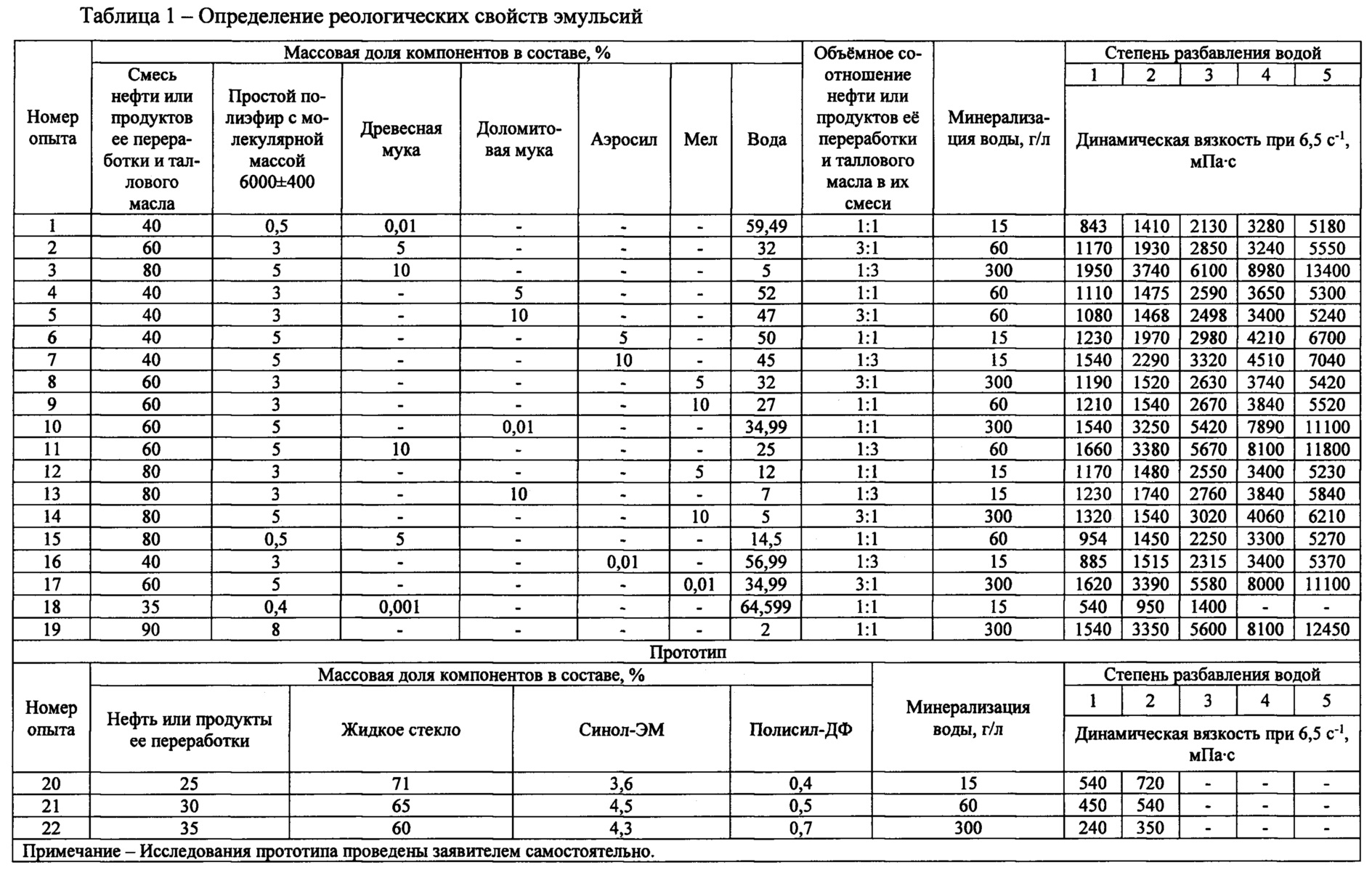 Изобретение относится к нефтяной промышленности, в частности к составам для ограничения водопритока в добывающей скважине, и может найти применение для выравнивания профиля приемистости нагнетательной скважины. Известен состав для выравнивания профиля приемистости нагнетательных скважин и селективной изоляции воды в добывающих скважинах (патент RU №2313558, С09К 8/44, С09К 8/82, опубл. 27.12.2007, Бюл. №36), являющийся устойчивой эмульсией, содержащий эмульгатор, углеводород и водный раствор хлорида металла. Недостатком указанной эмульсии являются ее невысокие изолирующие свойства состава за счет невысоких вязкостных свойств состава. Известен способ изоляции водопритока в скважине (патент RU №2418153, МПК Е21В 33/138, опубл. 10.05.2011, Бюл. №13), включающий последовательную закачку в изолируемый интервал обратной эмульсии на основе водной дисперсной фазы и углеводородной дисперсионной среды с кремнийорганическим тампонажным составом и закрепляющего состава на основе кремнийорганического тампонажного состава в большей концентрации. До обратной эмульсии в изолируемый интервал закачивают водную суспензию глины для увеличения вязкости и стабильности эмульсии, в качестве кремнийорганического тампонажного состава применяют Силор НЧ. Недостатком данного состава является низкая эффективность изоляции из-за недостаточно высоких прочностных свойств состава. Наиболее близким к предлагаемому по технической сущности и достигаемому результату является состав для селективного ограничения водопритоков в добывающих скважинах (патент RU №2391378, МПК С09К 8/467, С09К 8/504, опубл. 10.06.2010, Бюл. №16), включающий инвертную эмульсию, состоящую из дисперсионной углеводородной фазы - нефти или продуктов ее переработки, стабилизатора эмульсии - химически модифицированного кремнезема - Полисила-ДФ и дисперсной фазы. В качестве дисперсной фазы содержит натриевое жидкое стекло и дополнительно - маслорастворимое поверхностно-активное вещество - Синол-ЭМ. Недостатками известного состава являются низкая эффективность изоляции водопритока в добывающей скважине за счет низкой стабильности эмульсии и низкой эмульгирующей способности состава, что особенно важно для получения долговременного эффекта изоляции водопритока, а также невысокие реологические свойства (указанный состав не образует прочный водоизоляционный экран, эффективно блокирующий напор пластовых вод). Техническими задачами изобретения являются повышение эффективности изоляции водопритока в добывающей скважине за счет улучшения эмульгирующей способности состава, а также улучшение стабильности и реологических свойств эмульсионных систем, получаемых в пластовых условиях, что позволяет получить прочный водоизоляционный экран в нефтяном пласте добывающих скважин. Технические задачи решаются составом для ограничения водопритока в добывающей скважине, включающим инвертную эмульсию, состоящую из дисперсионной углеводородной фазы, стабилизатора эмульсии и дисперсной фазы. Новым является то, что в качестве дисперсионной углеводородной фазы используют смесь нефти или продуктов ее переработки и таллового масла, в качестве стабилизатора эмульсии - простой полиэфир с молекулярной массой 6000±400, в качестве дисперсной фазы - воду с минерализацией от 15 до 300 г/л и доломитовую муку, или мел, или аэросил, 