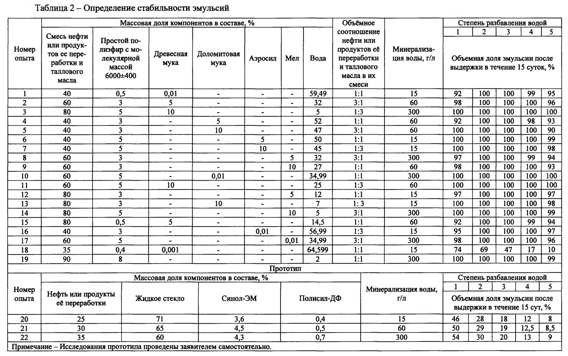 Состав для ограничения водопритока в добывающей скважине, включающий инвертную эмульсию, состоящую из дисперсионной углеводородной фазы, стабилизатора эмульсий и дисперсной фазы, отличающийся тем, что в качестве дисперсионной углеводородной фазы используют смесь нефти или продуктов ее переработки и таллового масла, в качестве стабилизатора эмульсии - простой полиэфир с молекулярной массой 6000±400, в качестве дисперсной фазы - воду с минерализацией от 15 до 300 г/л и доломитовую муку, или мел, или аэросил, или древесную муку при следующем соотношении компонентов, мас. %: причем объемное соотношение нефти или продуктов ее переработки и таллового масла в их смеси составляет от 1:3 до 3:1.смесь нефти или продуктов ее переработки и таллового масла 40-80 простой полиэфир с молекулярной массой 6000±400 0,5-5,0 доломитовая мука, или мел, или аэросил, или древесная мука 0,01-10,0 вода с минерализацией от 15 до 300 г/л остальное,