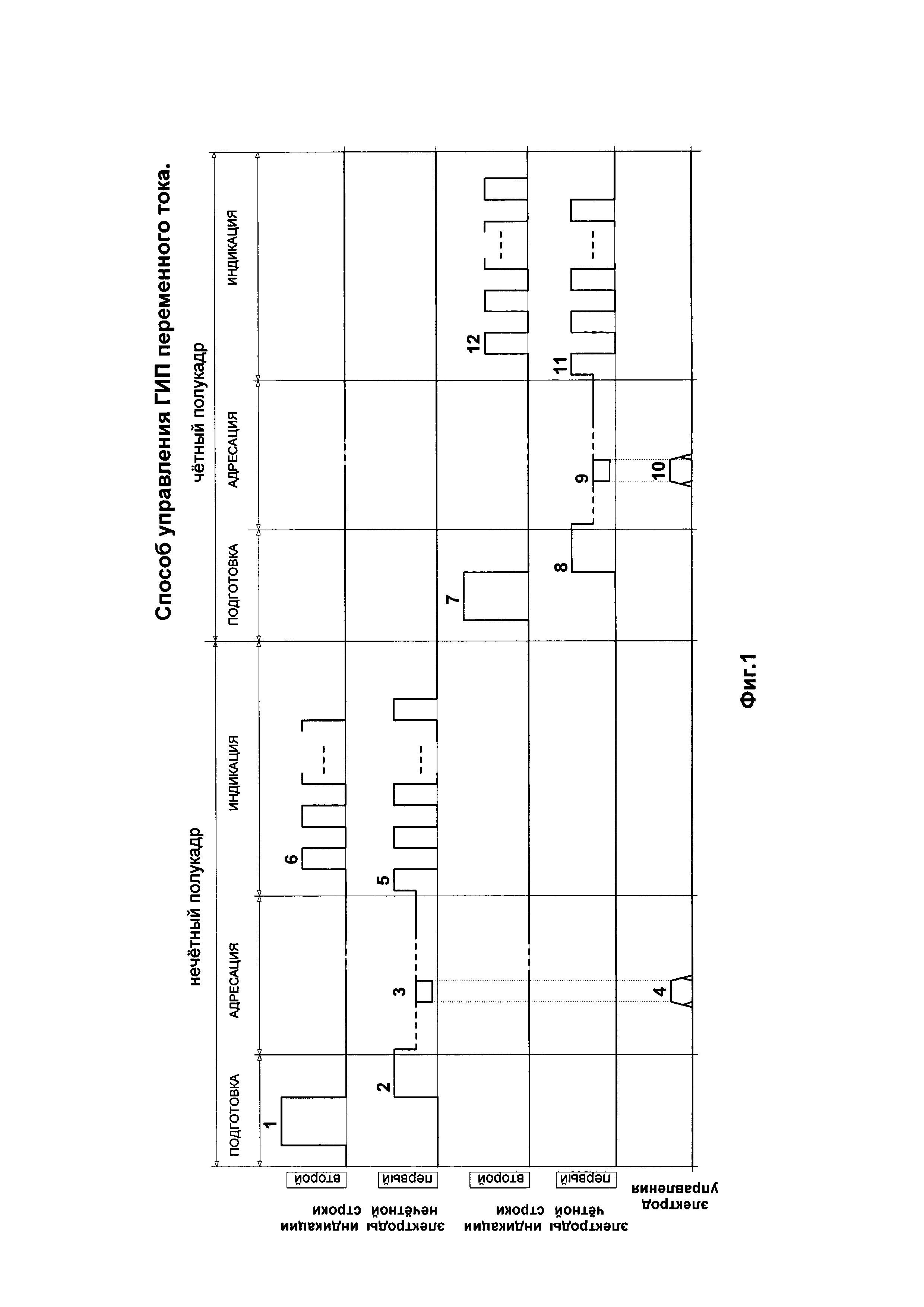 Изобретение относится к газоразрядной технике и может быть использовано в средствах отображения информации на газоразрядных индикаторных панелях (ГИП) переменного тока с поверхностным разрядом, в частности, в газоразрядных видеомодулях, предназначенных для отображения знакографической информации. Известен способ управления ГИП переменного тока, каждый элемент отображения которой содержит электрод управления по одной из координат и два параллельных электрода индикации по другой координате, заключающийся в подаче импульсов инициализации разряда, селективной записи/стирания, развертки и поддержания разряда на электроды ГИП переменного тока в интервалах подготовки, адресации и индикации кадра изображения [патент ЕР №0554172, H01J 17/49, 1993 г.] Недостатком данного способа управления является то, что при его использовании в светящемся состоянии могут находиться элементы отображения, отделенные друг от друга вдоль электрода управления только одним нерабочим промежутком между электродами индикации, что снижает надежность управления ГИП переменного тока из-за перекрестного влияния друг на друга светящихся элементов отображения, особенно при малом шаге между ними. Известен способ управления ГИП переменного тока, каждый элемент отображения которой содержит электрод управления по одной из координат и два параллельных электрода индикации по другой координате, заключающийся в разделении кадра изображения на два полукадра, в одном из которых обеспечивают режимы подготовки, адресации и индикации в элементах отображения нечетных строк, в другом - в элементах отображения четных строк, при этом каждый из электродов индикации принадлежит двум соседним элементам отображения, расположенным вдоль электрода управления, что обеспечивает уменьшение в два раза количества адресуемых электродов индикации и, соответственно, драйверов строк [статья V. Kanasawa а. о. «High-Resolution Interlaced Addressing for Plasma Displays», 1999 SID]. Недостатком данного способа управления является то, что при его использовании в каждом из полукадров могут находиться в светящемся состоянии элементы отображения, отделенные друг от друга вдоль электрода управления только одним неиспользуемым в данном полукадре промежутком между электродами индикации, что снижает надежность управления ГИП переменного тока из-за перекрестного влияния друг на друга светящихся элементов отображения. Наиболее близким способом того же назначения к заявленному объекту по совокупности признаков является способ управления ГИП переменного тока, каждый элемент отображения которой содержит электрод управления по одной из координат и два параллельных электрода индикации по другой координате, заключающийся в разделении кадра изображения на два полукадра, каждый из которых содержит интервалы подготовки, адресации и индикации, в одном из которых в интервалах адресации и индикации импульсы развертки и поддержания разряда подают на электроды индикации элементов отображения нечетных строк, в другом - четных строк, при этом в интервалах подготовки импульсы инициализации разряда подают на адресуемые в данном полукадре электроды индикации и расположенные рядом с ними электроды индикации элементов отображения соседних строк [патент РФ №2238601, H01J 17/49, 2004 г. - прототип]. Недостатком данного способа управления 