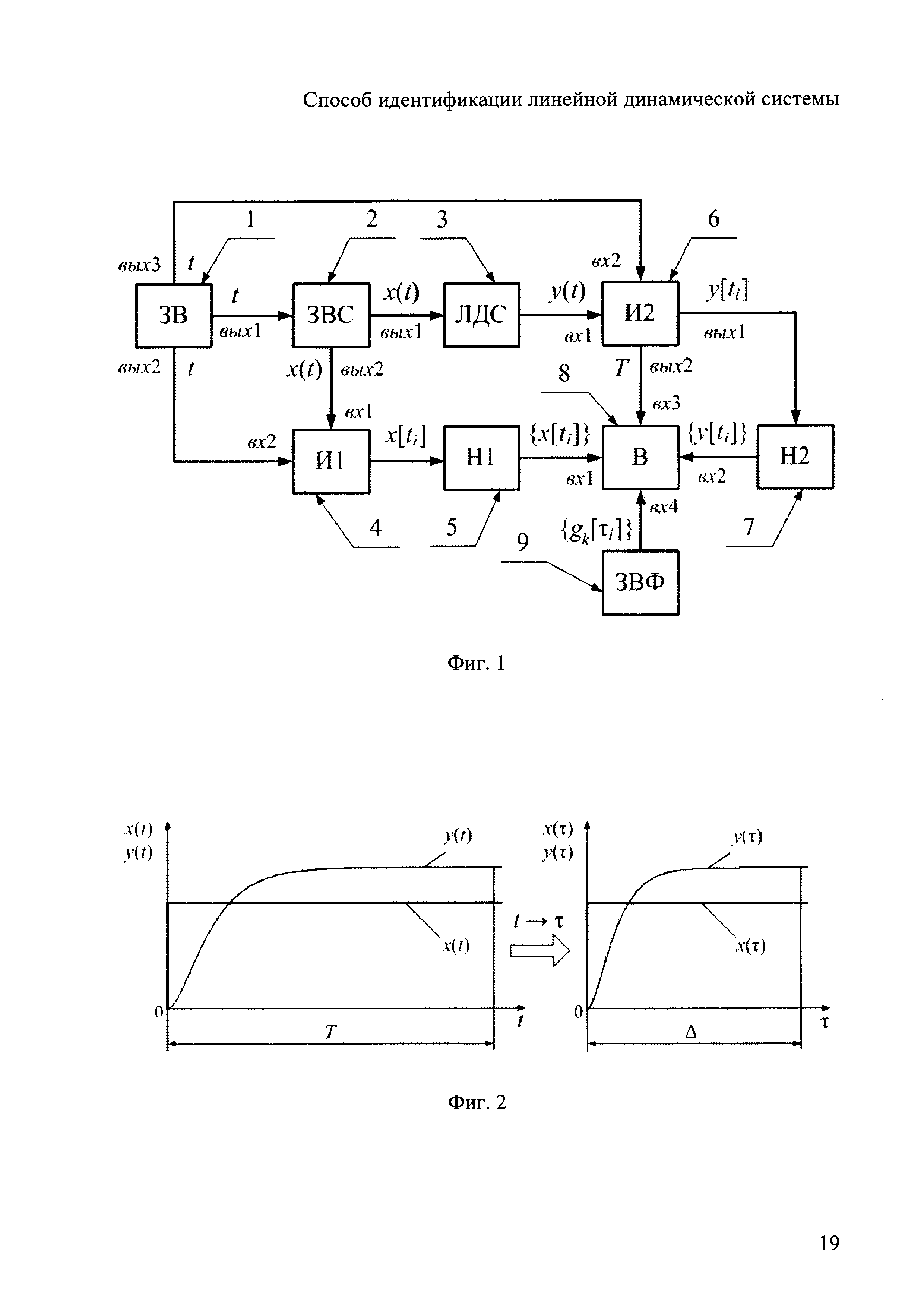 Изобретение относится к области автоматического управления и может быть использовано в самонастраивающихся системах автоматического управления электромеханическими, электротехническими, энергетическими, теплотехническими, механическими объектами и процессами, а также в информационно-измерительной технике для контроля указанных объектов и процессов. Известен способ идентификации линейной динамической системы (Дейч A.M. Методы идентификации динамических объектов. - М.: Энергия, 1979. - 240 с. С. 50-58), в котором первоначально задают передаточную функцию системы простейшего априорного вида в дробно-рациональной форме, формируют входные гармонические сигналы заданной амплитуды и частоты, по отдельности подают их на вход линейной динамической системы, при воздействии каждого из входных гармонических сигналов измеряют входной сигнал, измеряют выходной сигнал при установившемся колебательном движении системы и определяют его амплитуду и фазу по отношению к входному сигналу, далее для каждого входного гармонического сигнала рассчитывают значения амплитудно-частотной характеристики и фазо-частотной характеристики системы, далее составляют систему уравнений в зависимости от коэффициентов передаточной функции априорного вида, частот входных гармонических сигналов, амплитудно-частотных характеристик, фазо-частотных характеристик, решают ее и идентифицируют коэффициенты передаточной функции, получают модель линейной динамической системы, далее рассчитывают переходную функцию модели, получают переходную функцию линейной динамической системы, затем задают критерий соответствия переходной функции модели и переходной функции линейной динамической системы, затем сравнивают переходные функции по заданному критерию и оценивают соответствие линейной динамической системы и модели, при существенном их отличии итеративно усложняют передаточную функцию априорного вида и повторяют процедуру идентификацию до получения удовлетворительного результата, причем количество входных гармонических сигналов задают в зависимости от числа коэффициентов передаточной функции априорного вида, усложнение передаточной функции априорного вида осуществляют путем увеличения числа ее коэффициентов, а удовлетворительный результат при оценке соответствия переходных функций считают достигнутым, когда дальнейшее усложнение передаточной функции априорного вида не приводит к повышению этого соответствия по заданному критерию. Недостатком данного технического решения является сложность и громоздкость идентификации линейной динамической системы вследствие необходимости проведения большого объема вычислений при оценке соответствия указанной системы и ее модели, а также вследствие повторов идентификации до получения удовлетворительного результата. Известен другой способ идентификации линейной динамической системы (Семенов А.Д., Артамонов Д.В., Брюхачев А.В. Идентификация объектов управления: Учебное пособие. - Пенза: Изд-во Пензенского Гос. Университета, 2003. - 211 с. С. 102-108), в котором первоначально задают передаточную функцию системы простейшего априорного вида в дробно-рациональной форме, формируют входные периодические сигналы прямоугольной формы заданной амплитуды и частоты, по отдельности подают их на вход линейной дина