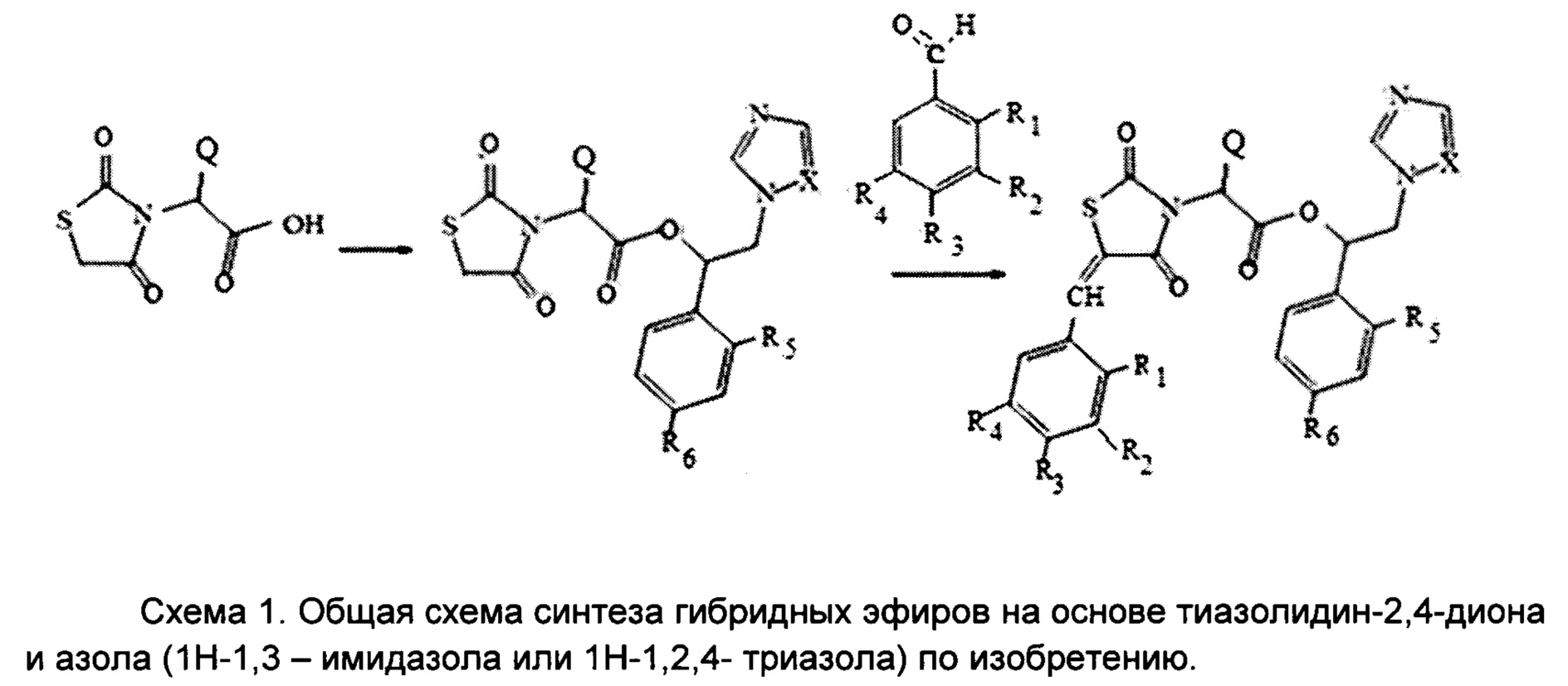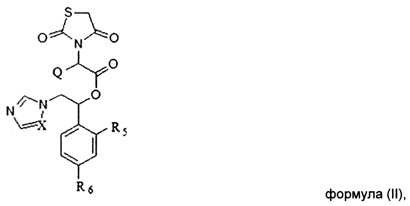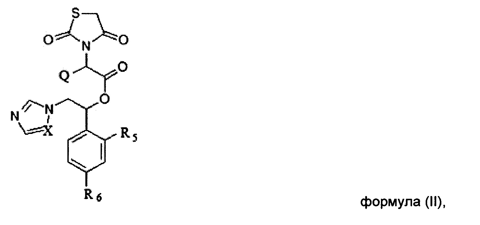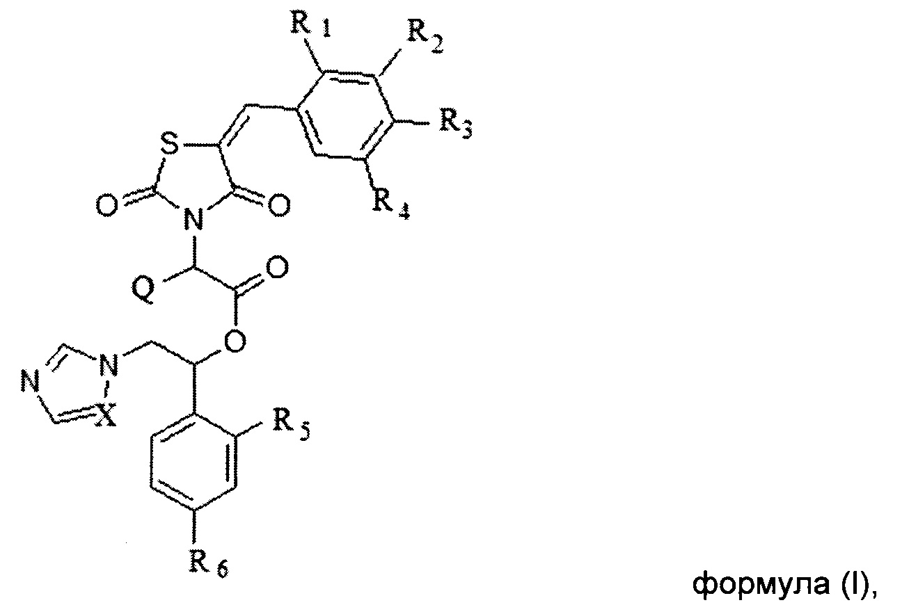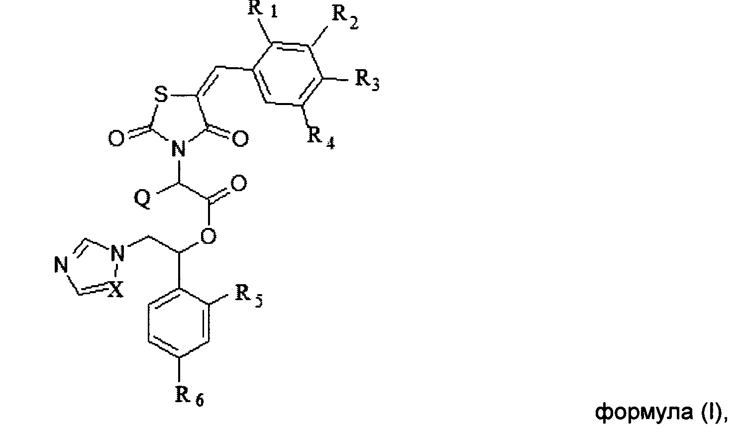 1. Соединение общей формулы (I) или общей формулы (II): или его стереоизомер или энантиомер, фармацевтически приемлемая соль, где: X выбирается независимо и представляет собой СН или N; Q выбирается независимо и представляет собой Н, -C1-6-алкил, фенил, галогенированный фенил, нафтил или галогенированный нафтил; R1, R2, R3, R4 выбираются независимо и представляют собой Н, -C1-6-алкил, -ОН, галоген, -O-бензил, фенил, причем фенил или бензил может быть необязательно замещен, по меньшей мере, одним заместителем, выбранным из галогена, -CN, -ОН, -O-C1-6-алкила, -СООН, -COOC1-6-алкил, причем R1 и R2 совместно с циклом, к которому они присоединены, могут образовывать бициклический фрагмент нафтил; R5, R6 выбираются независимо и представляют собой галоген. 2. Соединение по п. 1, в котором: X представляет собой СН; R5, R6 представляют собой Cl. 3. Соединение по п. 1, в котором: X представляет собой N; R5, R6 представляют собой F. 4. Соединение по п. 1, в котором: Q представляет собой 2-Cl-фенил, 4-Cl-фенил, 4-F-фенил, 2,4-Cl2-фенил. 5. Соединение по п. 1, в котором: R1, R2, R4 представляют собой Н; R3 представляет собой F. 6. Соединение по п. 1, в котором: R1, R2, R4 представляют собой Н; R3 представляет собой Cl. 7. Соединение по п. 1, в котором: R1 представляет собой -ОН; R2, R3, R4 представляют собой Н. 8. Соединение по п. 1, в котором: R1, R4 представляют собой Н; R2, R3 представляют собой -O-бензил. 9. Соединение по п. 1, в котором: R2, R3, R4 представляют собой Н; R1 представляет собой -O-CH2-4-F-C6H4. 10. Соединение по п. 1, в котором: R1 представляет собой -ОН; R2, R3 представляют собой Н; R4 представляет собой Cl. 11. Соединение по п. 1, в котором: R1 представляет собой -O-CH2-p-COOCH3-C6H4; R2, R4 представляют собой Cl; R3 представляет собой Н, галоген или -O-бензил. 12. Соединение по п. 1, в котором: R1 представляет собой -O-CH2-4-COOH-C6H4; R2, R4 представляют собой Cl; R3 представляет собой Н, галоген или -O-бензил. 13. Соединение по п. 1, выбранное из группы: 1-(2,4-дихлорфенил)-2-(1Н-1,3-имидазол-1-ил)этил-2-(тиазолидин-2,4-дион-3-ил) ацетат; (Z)-1-(2,4-дихлорфенил)-2-(1Н-1,3-имидазол-1-ил)этил-2-[5-(2-гидрокси,5-хлорбензилиден)-тиазолидин-2,4-дион-3-ил] ацетат; (Z)-1-(2,4-дихлорфенил)-2-(1Н-1,3-имидазол-1-ил)этил-2-[(5-(2-гидроксибензилиден)-тиазолидин-2,4-дион-3-ил] ацетат; (Z)-1-(2,4-дихлорфенил)-2-(1Н-1,3-имидазол-1-ил)этил-2-[(5-(2-(4-фторбензил)-оксибензилиден)-тиазолидин-2,4-дион-3-ил] ацетат; (Z)-1-(2,4-дихлорфенил)-2-(1Н-1,3-имидазол-1-ил)этил-2-[5-(2-(4-фторбензил)-окси,5-хлорбензилиден)-тиазолидин-2,4-дион-3-ил] ацетат; (Z)-1-(2,4-дихлорфенил)-2-(1Н-1,3-имидазол-1-ил)этил-2-[(5-(4-фторбензилиден)-тиазолидин-2,4-дион-3-ил] ацетат; (Z)-1-(2,4-дихлорфенил)-2-(1Н-1,3-имидазол-1-ил)этил-2-[(5-(4-хлорбензилиден)-тиазолидин-2,4-дион-3-ил] ацетат; (Z)-1-(2,4-дихлорфенил)-2-(1Н-1,3-имидазол-1-ил)этил-2-[(5-(2,4-дихлорбензилиден)-тиазолидин-2,4-дион-3-ил] ацетат (Z)-1-(2,4-дихлорфенил)-2-(1Н-1,3-имидазол-1-ил)этил-2-[(5-(2-гидрокси,3,5-дихлорбензилиден)-тиазолидин-2,4-дион-3-ил] ацетат; (Z)-1-(2,4-дихлорфенил)-2-(1Н-1,3-имидазол-1-ил)этил-2-[(5-(3,4-бис(бензилокси)бензилиден)-тиазолидин-2,4-дион-3-ил] ацетат; (Z)-3-(2-(1-((2,4-дихлорфенил)-2-(1Н-1,3-имидазол-1-ил)этокси)ацетил)-5(нафтилен-1-илметилен) тиазолидин-2,4-дион; 1-(2,4-дифторфенил)-2-(1Н-1,2,4-триазол-1-ил)этил-2-тиазолидин-2,4-дион-3-ил) ацетат; (Z)-1-(2,4-дифторфенил)-2-(1Н-1,2,4-триазол-1-ил)этил-2-[5-(4-хлорбензилиден)]-2,4-тиазолидиндион-3-ил ацетата; (Z)-1-(2,4-дифторфенил)-2-(1Н-1,2,4-триазол-1-ил)этил-2-[5-(2,4-дихлорбензилиден)]-2,4-тиазолидиндион-3-ил ацетат; 1-(1-(2,4-дихлорфенил)-2-(1Н-1,3-имидазол-1-ил)этил-2-(тиазолидин-2,4-дион-3-ил) пропионат; (Z)-1-(2,4-дихлорфенил)-2-(1Н-1,3-имид