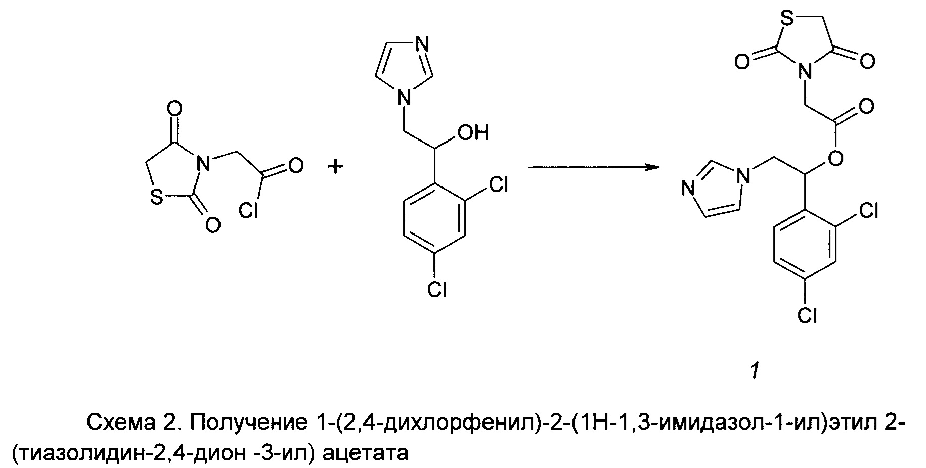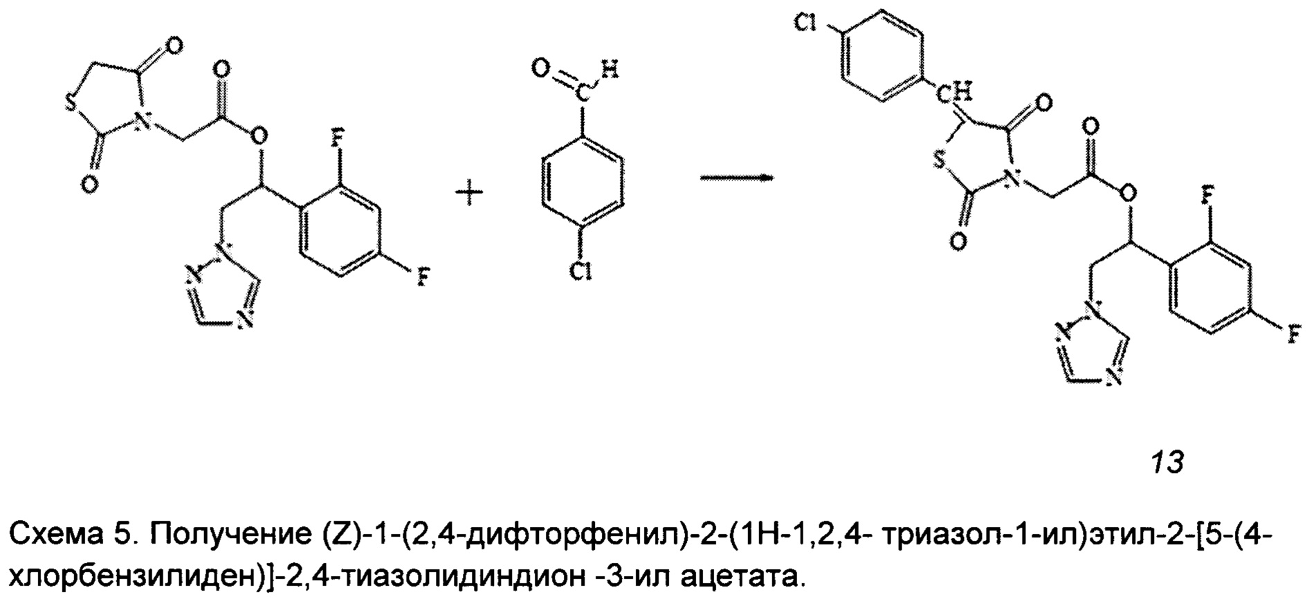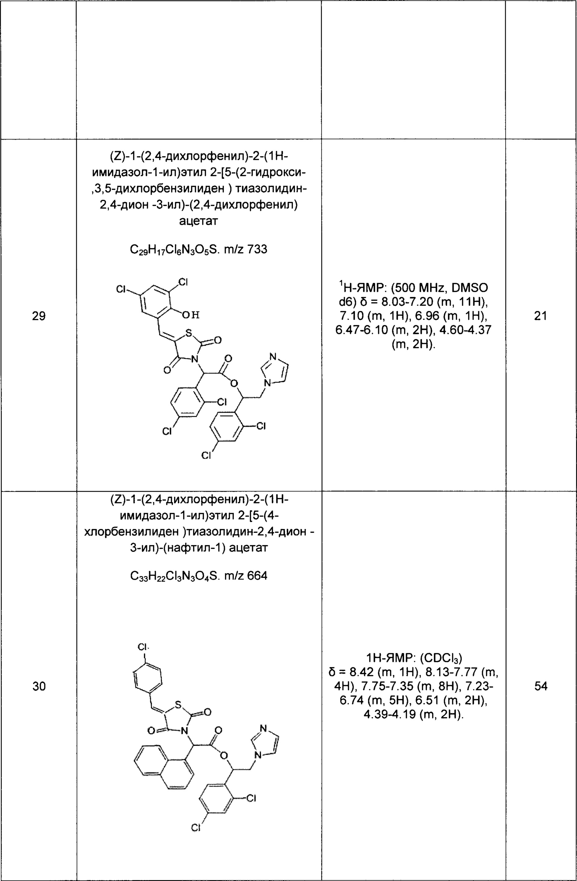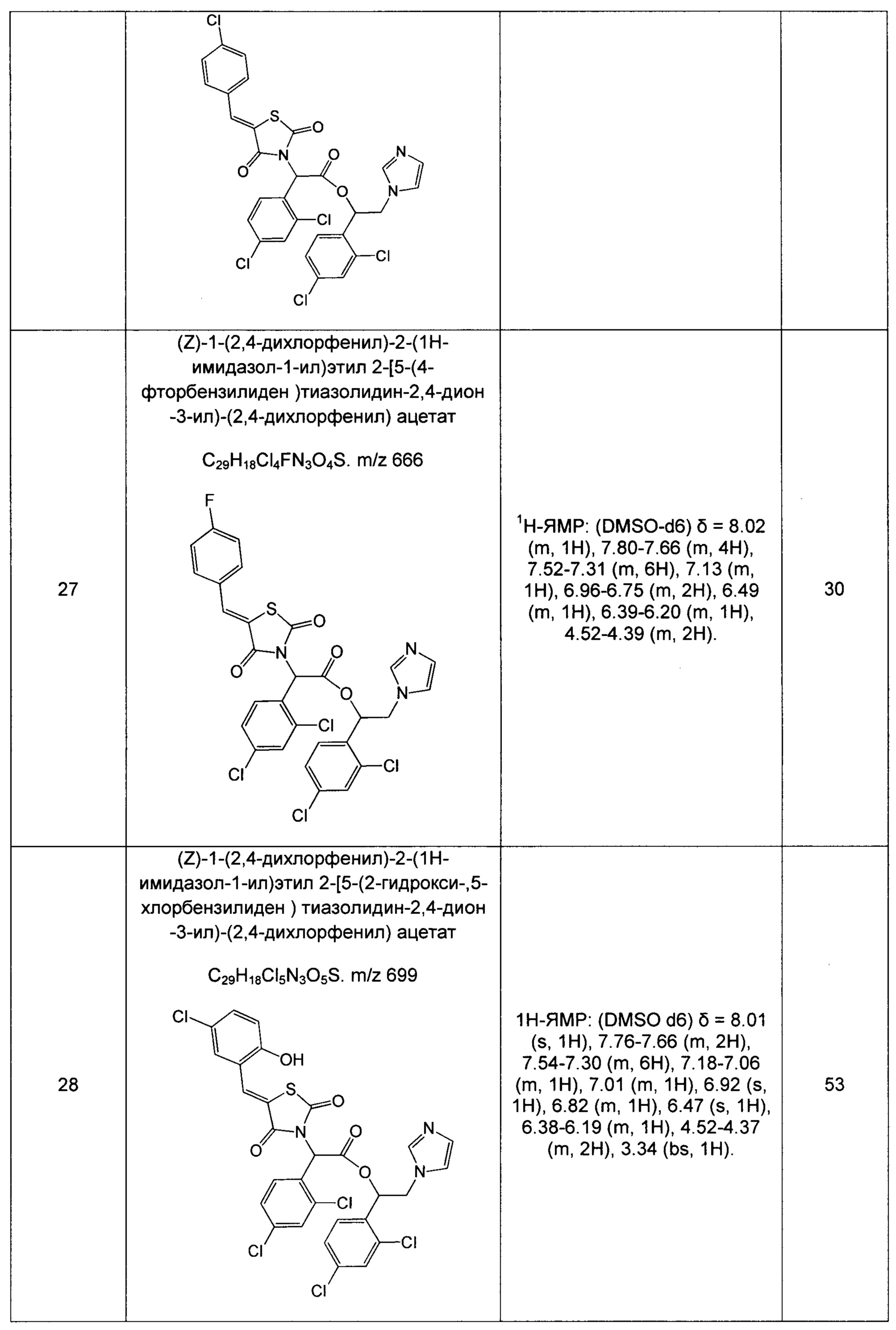 1. Соединение общей формулы (I) или общей формулы (II): или его стереоизомер или энантиомер, фармацевтически приемлемая соль, где: X выбирается независимо и представляет собой СН или N; Q выбирается независимо и представляет собой Н, -C1-6-алкил, фенил, галогенированный фенил, нафтил или галогенированный нафтил; R1, R2, R3, R4 выбираются независимо и представляют собой Н, -C1-6-алкил, -ОН, галоген, -O-бензил, фенил, причем фенил или бензил может быть необязательно замещен, по меньшей мере, одним заместителем, выбранным из галогена, -CN, -ОН, -O-C1-6-алкила, -СООН, -COOC1-6-алкил, причем R1 и R2 совместно с циклом, к которому они присоединены, могут образовывать бициклический фрагмент нафтил; R5, R6 выбираются независимо и представляют собой галоген. 2. Соединение по п. 1, в котором: X представляет собой СН; R5, R6 представляют собой Cl. 3. Соединение по п. 1, в котором: X представляет собой N; R5, R6 представляют собой F. 4. Соединение по п. 1, в котором: Q представляет собой 2-Cl-фенил, 4-Cl-фенил, 4-F-фенил, 2,4-Cl2-фенил. 5. Соединение по п. 1, в котором: R1, R2, R4 представляют собой Н; R3 представляет собой F. 6. Соединение по п. 1, в котором: R1, R2, R4 представляют собой Н; R3 представляет собой Cl. 7. Соединение по п. 1, в котором: R1 представляет собой -ОН; R2, R3, R4 представляют собой Н. 8. Соединение по п. 1, в котором: R1, R4 представляют собой Н; R2, R3 представляют собой -O-бензил. 9. Соединение по п. 1, в котором: R2, R3, R4 представляют собой Н; R1 представляет собой -O-CH2-4-F-C6H4. 10. Соединение по п. 1, в котором: R1 представляет собой -ОН; R2, R3 представляют собой Н; R4 представляет собой Cl. 11. Соединение по п. 1, в котором: R1 представляет собой -O-CH2-p-COOCH3-C6H4; R2, R4 представляют собой Cl; R3 представляет собой Н, галоген или -O-бензил. 12. Соединение по п. 1, в котором: R1 представляет собой -O-CH2-4-COOH-C6H4; R2, R4 представляют собой Cl; R3 представляет собой Н, галоген или -O-бензил. 13. Соединение по п. 1, выбранное из группы: 1-(2,4-дихлорфенил)-2-(1Н-1,3-имидазол-1-ил)этил-2-(тиазолидин-2,4-дион-3-ил) ацетат; (Z)-1-(2,4-дихлорфенил)-2-(1Н-1,3-имидазол-1-ил)этил-2-[5-(2-гидрокси,5-хлорбензилиден)-тиазолидин-2,4-дион-3-ил] ацетат; (Z)-1-(2,4-дихлорфенил)-2-(1Н-1,3-имидазол-1-ил)этил-2-[(5-(2-гидроксибензилиден)-тиазолидин-2,4-дион-3-ил] ацетат; (Z)-1-(2,4-дихлорфенил)-2-(1Н-1,3-имидазол-1-ил)этил-2-[(5-(2-(4-фторбензил)-оксибензилиден)-тиазолидин-2,4-дион-3-ил] ацетат; (Z)-1-(2,4-дихлорфенил)-2-(1Н-1,3-имидазол-1-ил)этил-2-[5-(2-(4-фторбензил)-окси,5-хлорбензилиден)-тиазолидин-2,4-дион-3-ил] ацетат; (Z)-1-(2,4-дихлорфенил)-2-(1Н-1,3-имидазол-1-ил)этил-2-[(5-(4-фторбензилиден)-тиазолидин-2,4-дион-3-ил] ацетат; (Z)-1-(2,4-дихлорфенил)-2-(1Н-1,3-имидазол-1-ил)этил-2-[(5-(4-хлорбензилиден)-тиазолидин-2,4-дион-3-ил] ацетат; (Z)-1-(2,4-дихлорфенил)-2-(1Н-1,3-имидазол-1-ил)этил-2-[(5-(2,4-дихлорбензилиден)-тиазолидин-2,4-дион-3-ил] ацетат (Z)-1-(2,4-дихлорфенил)-2-(1Н-1,3-имидазол-1-ил)этил-2-[(5-(2-гидрокси,3,5-дихлорбензилиден)-тиазолидин-2,4-дион-3-ил] ацетат; (Z)-1-(2,4-дихлорфенил)-2-(1Н-1,3-имидазол-1-ил)этил-2-[(5-(3,4-бис(бензилокси)бензилиден)-тиазолидин-2,4-дион-3-ил] ацетат; (Z)-3-(2-(1-((2,4-дихлорфенил)-2-(1Н-1,3-имидазол-1-ил)этокси)ацетил)-5(нафтилен-1-илметилен) тиазолидин-2,4-дион; 1-(2,4-дифторфенил)-2-(1Н-1,2,4-триазол-1-ил)этил-2-тиазолидин-2,4-дион-3-ил) ацетат; (Z)-1-(2,4-дифторфенил)-2-(1Н-1,2,4-триазол-1-ил)этил-2-[5-(4-хлорбензилиден)]-2,4-тиазолидиндион-3-ил ацетата; (Z)-1-(2,4-дифторфенил)-2-(1Н-1,2,4-триазол-1-ил)этил-2-[5-(2,4-дихлорбензилиден)]-2,4-тиазолидиндион-3-ил ацетат; 1-(1-(2,4-дихлорфенил)-2-(1Н-1,3-имидазол-1-ил)этил-2-(тиазолидин-2,4-дион-3-ил) пропионат; (Z)-1-(2,4-дихлорфенил)-2-(1Н-1,3-имид