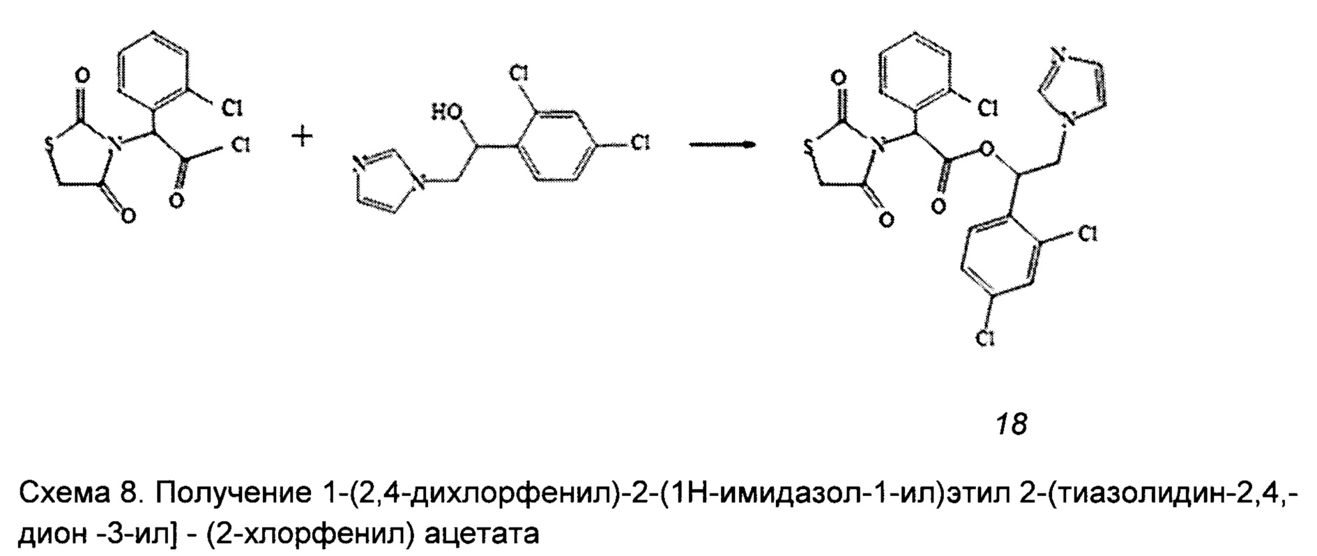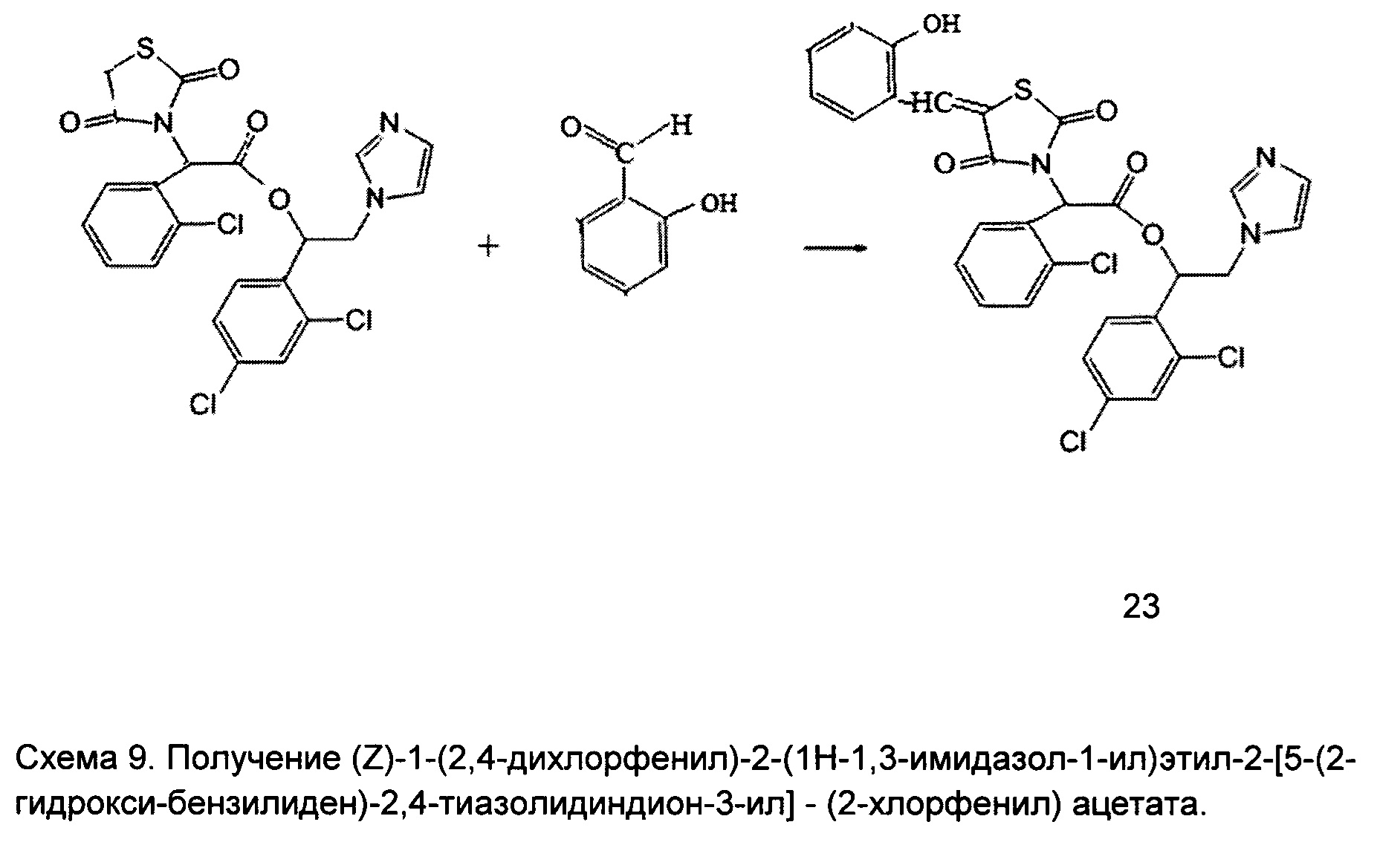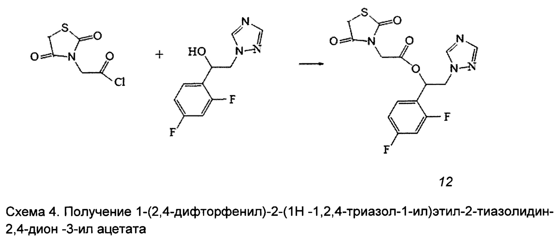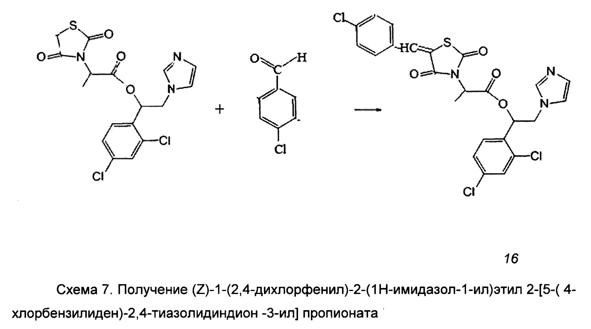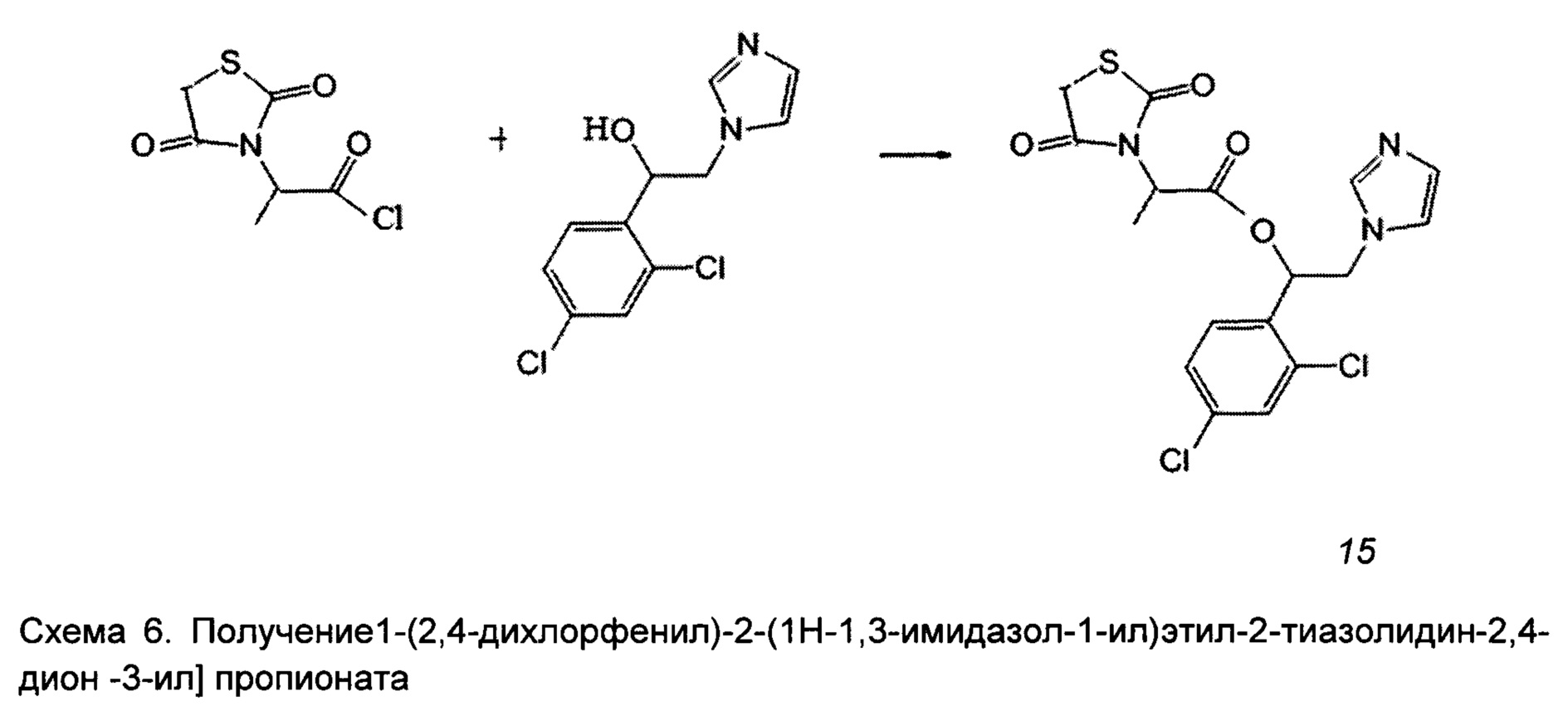 1. Соединение общей формулы (I) или общей формулы (II): или его стереоизомер или энантиомер, фармацевтически приемлемая соль, где: X выбирается независимо и представляет собой СН или N; Q выбирается независимо и представляет собой Н, -C1-6-алкил, фенил, галогенированный фенил, нафтил или галогенированный нафтил; R1, R2, R3, R4 выбираются независимо и представляют собой Н, -C1-6-алкил, -ОН, галоген, -O-бензил, фенил, причем фенил или бензил может быть необязательно замещен, по меньшей мере, одним заместителем, выбранным из галогена, -CN, -ОН, -O-C1-6-алкила, -СООН, -COOC1-6-алкил, причем R1 и R2 совместно с циклом, к которому они присоединены, могут образовывать бициклический фрагмент нафтил; R5, R6 выбираются независимо и представляют собой галоген. 2. Соединение по п. 1, в котором: X представляет собой СН; R5, R6 представляют собой Cl. 3. Соединение по п. 1, в котором: X представляет собой N; R5, R6 представляют собой F. 4. Соединение по п. 1, в котором: Q представляет собой 2-Cl-фенил, 4-Cl-фенил, 4-F-фенил, 2,4-Cl2-фенил. 5. Соединение по п. 1, в котором: R1, R2, R4 представляют собой Н; R3 представляет собой F. 6. Соединение по п. 1, в котором: R1, R2, R4 представляют собой Н; R3 представляет собой Cl. 7. Соединение по п. 1, в котором: R1 представляет собой -ОН; R2, R3, R4 представляют собой Н. 8. Соединение по п. 1, в котором: R1, R4 представляют собой Н; R2, R3 представляют собой -O-бензил. 9. Соединение по п. 1, в котором: R2, R3, R4 представляют собой Н; R1 представляет собой -O-CH2-4-F-C6H4. 10. Соединение по п. 1, в котором: R1 представляет собой -ОН; R2, R3 представляют собой Н; R4 представляет собой Cl. 11. Соединение по п. 1, в котором: R1 представляет собой -O-CH2-p-COOCH3-C6H4; R2, R4 представляют собой Cl; R3 представляет собой Н, галоген или -O-бензил. 12. Соединение по п. 1, в котором: R1 представляет собой -O-CH2-4-COOH-C6H4; R2, R4 представляют собой Cl; R3 представляет собой Н, галоген или -O-бензил. 13. Соединение по п. 1, выбранное из группы: 1-(2,4-дихлорфенил)-2-(1Н-1,3-имидазол-1-ил)этил-2-(тиазолидин-2,4-дион-3-ил) ацетат; (Z)-1-(2,4-дихлорфенил)-2-(1Н-1,3-имидазол-1-ил)этил-2-[5-(2-гидрокси,5-хлорбензилиден)-тиазолидин-2,4-дион-3-ил] ацетат; (Z)-1-(2,4-дихлорфенил)-2-(1Н-1,3-имидазол-1-ил)этил-2-[(5-(2-гидроксибензилиден)-тиазолидин-2,4-дион-3-ил] ацетат; (Z)-1-(2,4-дихлорфенил)-2-(1Н-1,3-имидазол-1-ил)этил-2-[(5-(2-(4-фторбензил)-оксибензилиден)-тиазолидин-2,4-дион-3-ил] ацетат; (Z)-1-(2,4-дихлорфенил)-2-(1Н-1,3-имидазол-1-ил)этил-2-[5-(2-(4-фторбензил)-окси,5-хлорбензилиден)-тиазолидин-2,4-дион-3-ил] ацетат; (Z)-1-(2,4-дихлорфенил)-2-(1Н-1,3-имидазол-1-ил)этил-2-[(5-(4-фторбензилиден)-тиазолидин-2,4-дион-3-ил] ацетат; (Z)-1-(2,4-дихлорфенил)-2-(1Н-1,3-имидазол-1-ил)этил-2-[(5-(4-хлорбензилиден)-тиазолидин-2,4-дион-3-ил] ацетат; (Z)-1-(2,4-дихлорфенил)-2-(1Н-1,3-имидазол-1-ил)этил-2-[(5-(2,4-дихлорбензилиден)-тиазолидин-2,4-дион-3-ил] ацетат (Z)-1-(2,4-дихлорфенил)-2-(1Н-1,3-имидазол-1-ил)этил-2-[(5-(2-гидрокси,3,5-дихлорбензилиден)-тиазолидин-2,4-дион-3-ил] ацетат; (Z)-1-(2,4-дихлорфенил)-2-(1Н-1,3-имидазол-1-ил)этил-2-[(5-(3,4-бис(бензилокси)бензилиден)-тиазолидин-2,4-дион-3-ил] ацетат; (Z)-3-(2-(1-((2,4-дихлорфенил)-2-(1Н-1,3-имидазол-1-ил)этокси)ацетил)-5(нафтилен-1-илметилен) тиазолидин-2,4-дион; 1-(2,4-дифторфенил)-2-(1Н-1,2,4-триазол-1-ил)этил-2-тиазолидин-2,4-дион-3-ил) ацетат; (Z)-1-(2,4-дифторфенил)-2-(1Н-1,2,4-триазол-1-ил)этил-2-[5-(4-хлорбензилиден)]-2,4-тиазолидиндион-3-ил ацетата; (Z)-1-(2,4-дифторфенил)-2-(1Н-1,2,4-триазол-1-ил)этил-2-[5-(2,4-дихлорбензилиден)]-2,4-тиазолидиндион-3-ил ацетат; 1-(1-(2,4-дихлорфенил)-2-(1Н-1,3-имидазол-1-ил)этил-2-(тиазолидин-2,4-дион-3-ил) пропионат; (Z)-1-(2,4-дихлорфенил)-2-(1Н-1,3-имид