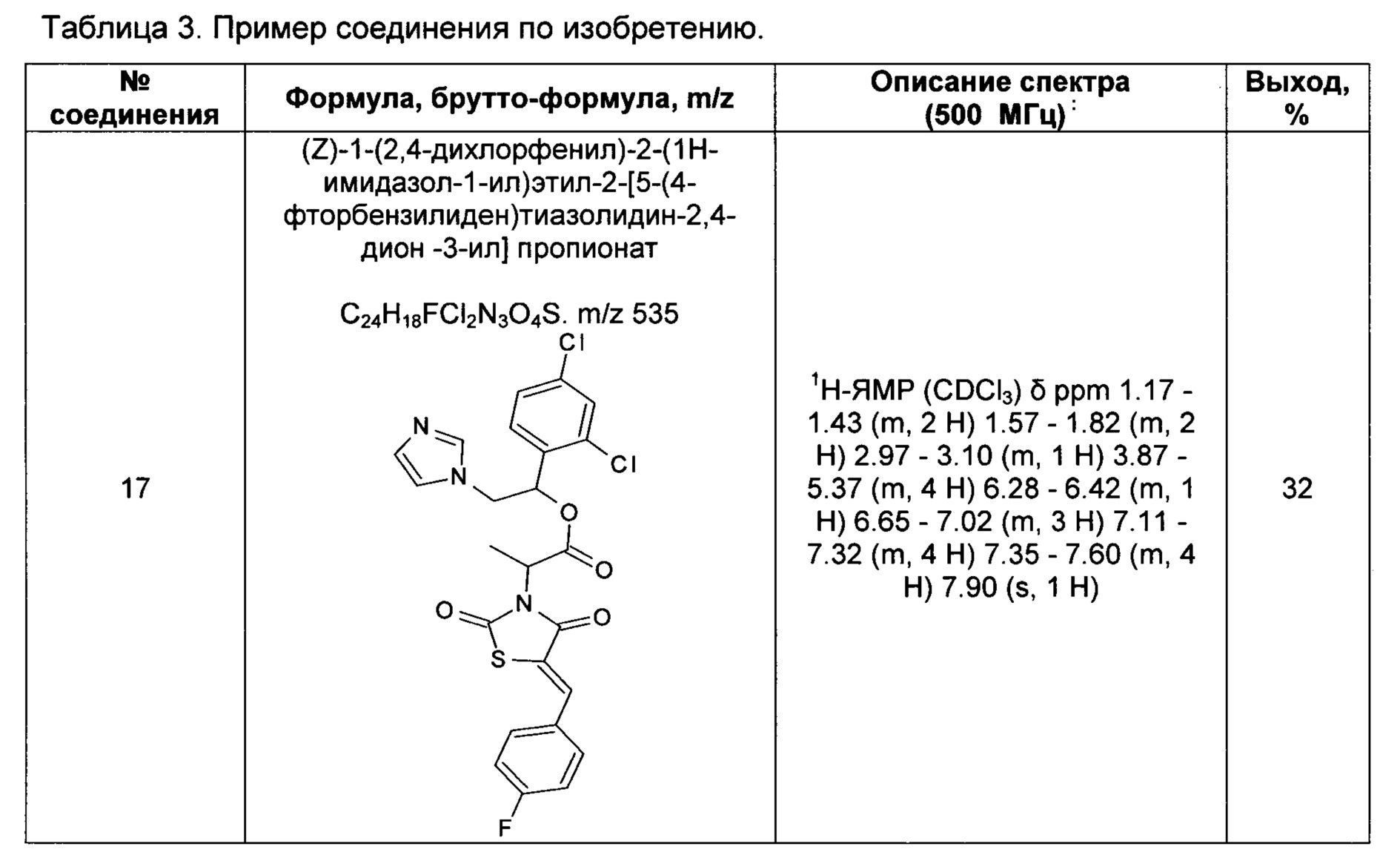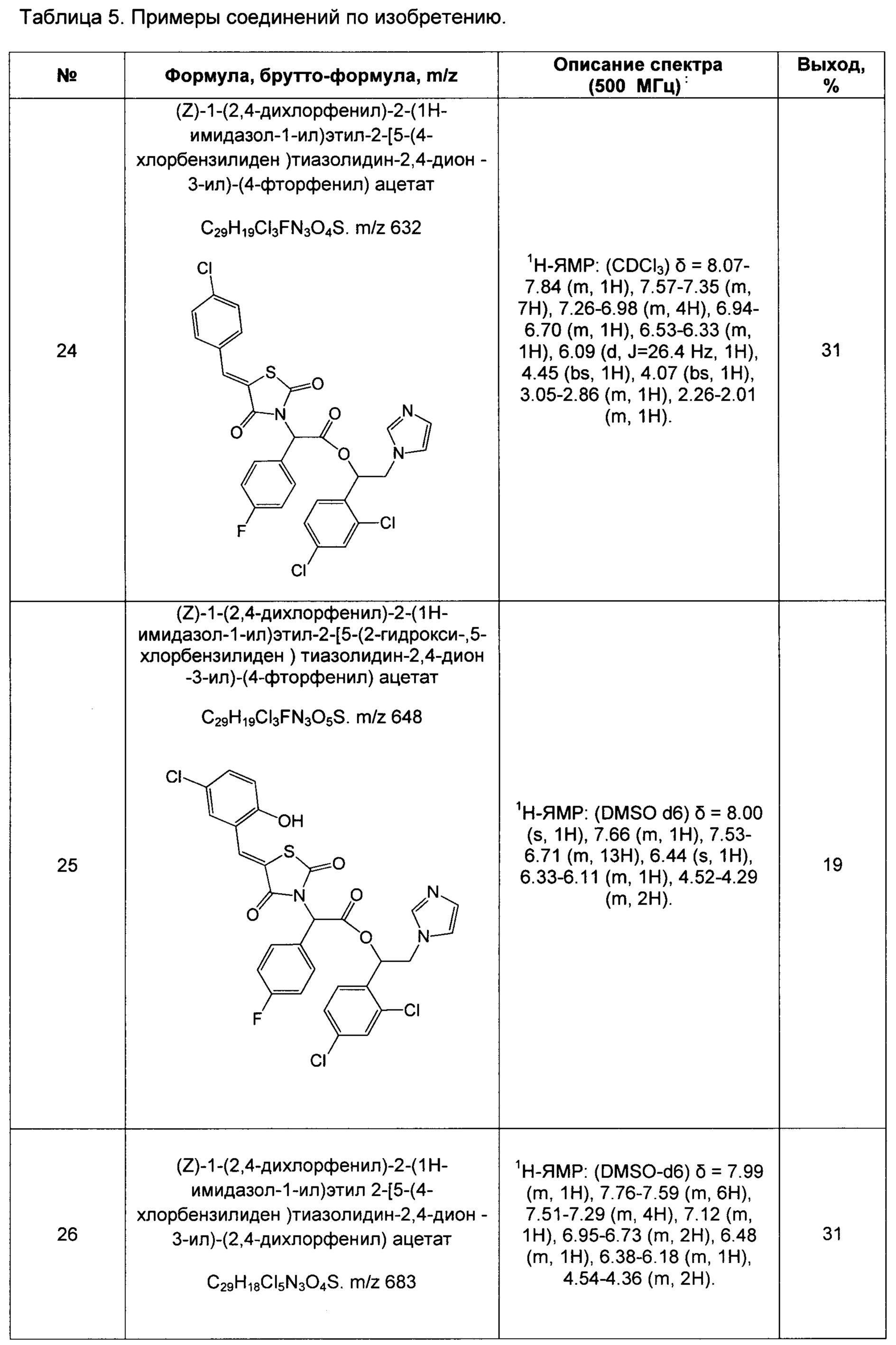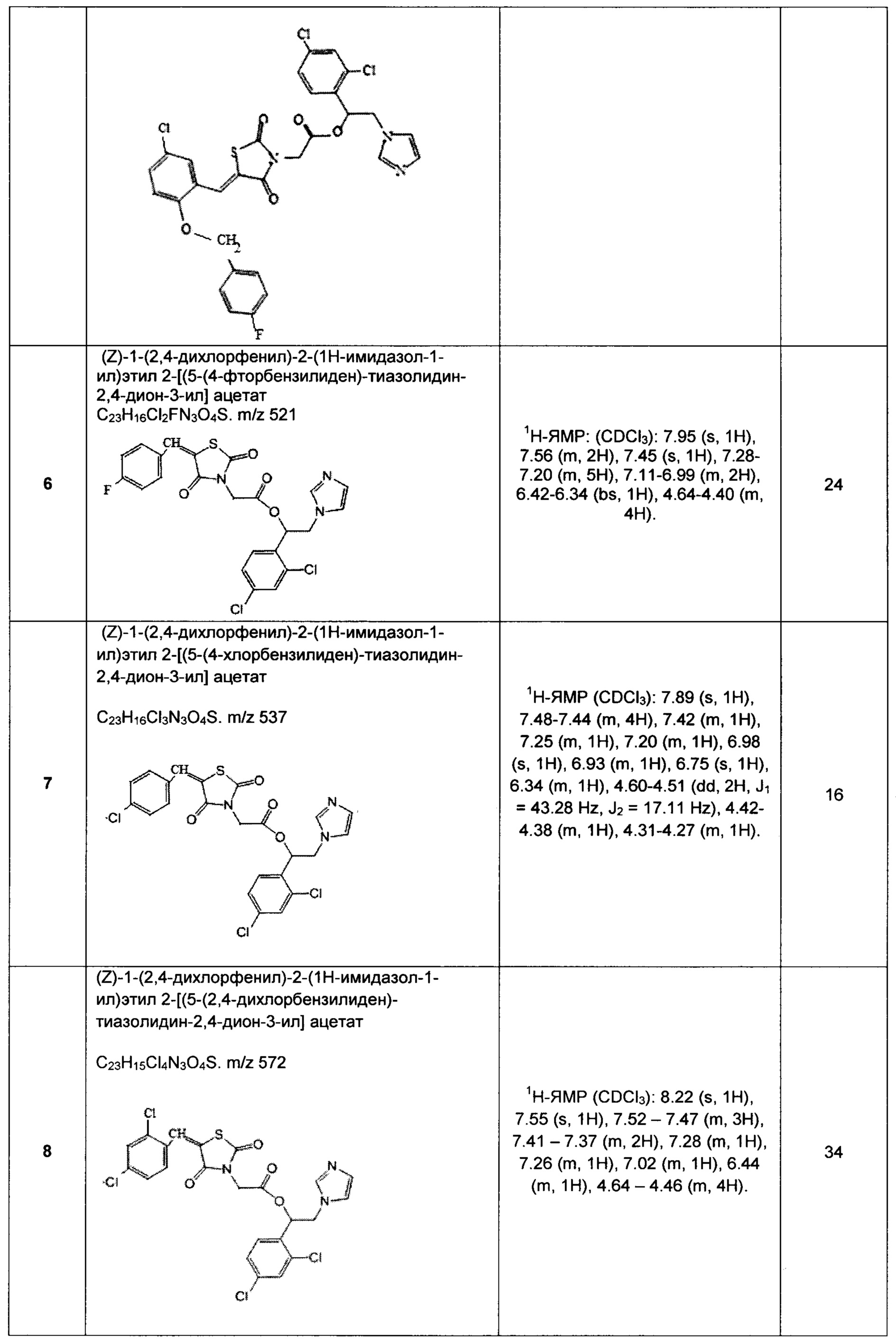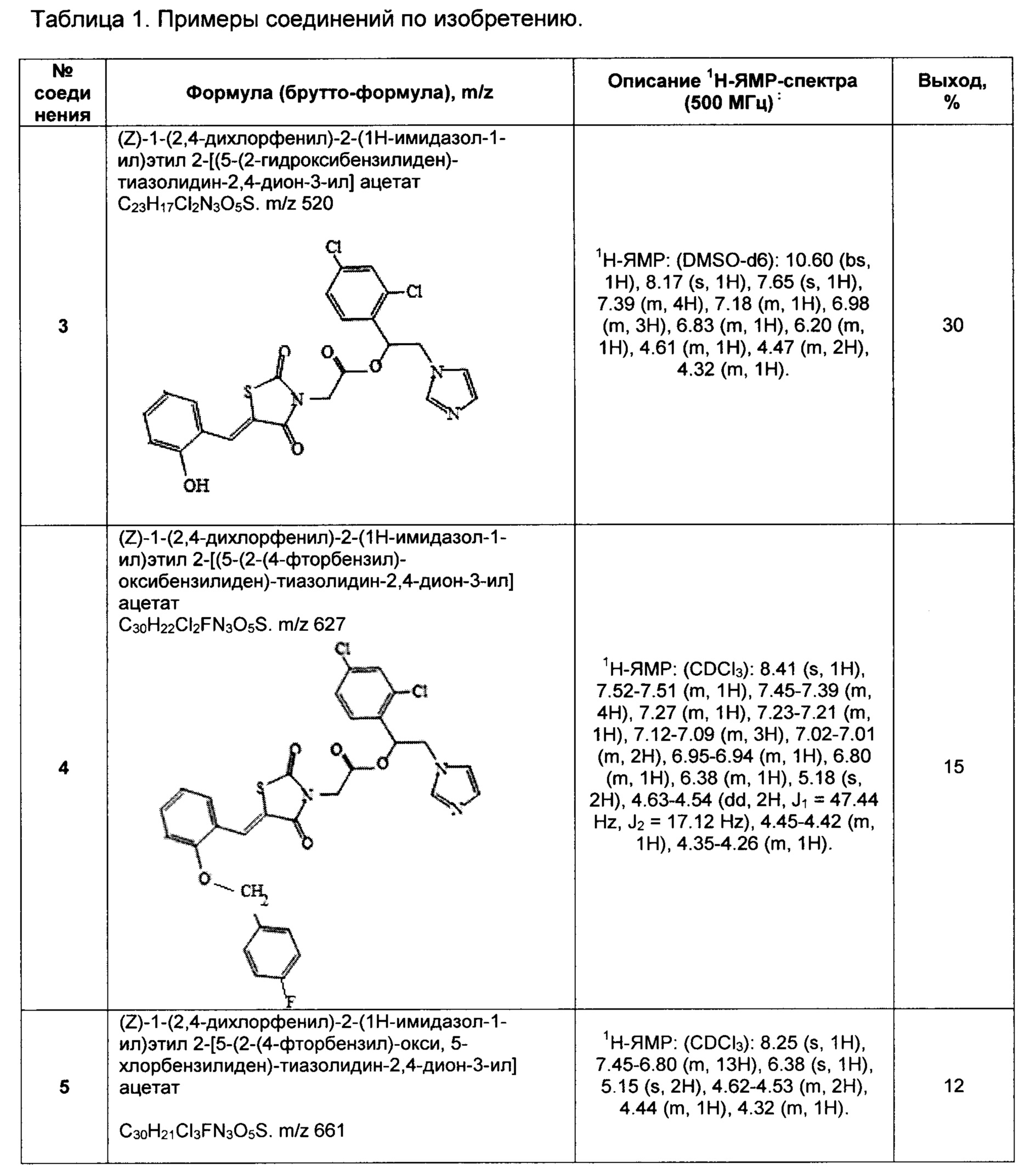 Область техники Изобретение относится к химии органических соединений, фармакологии и медицине и касается новых химических соединений, характеризующихся высокой противогрибковой активностью, которые, в частности, могут использоваться для профилактики и лечения инфекционных заболеваний у субъекта, в частности заболеваний, вызванных кандидозными и филоментозными патогенами. Уровень техники Недостаточная эффективность современной противомикробной терапии обусловлена в значительной степени развитием резистентности у возбудителей к имеющимся лекарственным препаратам. Именно поэтому во всем мире проводится интенсивный поиск и разработка новых эффективных лекарственных соединений. Несмотря на все усилия, современный арсенал медицинских средств недостаточен и не позволяет проводить эффективное лечение многих заболеваний, в том числе грибковых инфекций. Имеющиеся в настоящее время противогрибковые препараты - полиены и азолы, влияющие на главный компонент мембраны грибов - эргостерол, не обеспечивают должной избирательности действия. Они весьма токсичны, более того, многие штаммы возбудителей приобретают резистентность к препаратам группы азолов. Из уровня техники известны соединения, имеющие тиазолидиндионовый фрагмент и характеризующиеся противогрибковой активностью US 7105554, WO 2002022612, Thiazolidine and benzylidene thiazolidinedione inhibitors of mannosyltransferease as antifungal agents // Expert Opinion Ther. pat., Patent evaluation, 2002, 12,8, 1285-7. В данных документах описаны замещенные производные 5-бензилиден-2,4-тиазолидин-3 уксусной кислоты в качестве антимикотических средств, активных в отношении многих патогенных грибов. Из уровня техники известны также производные азола, характеризующиеся противогрибковой активностью WO 2005006860, Помимо этого описаны способы получения и противогрибковая активность ацильных производных азолов - широко известной группы противогрибковых средств, и, в частности, соединений, полученных путем ацилирования азольных гетероциклов по атому кислорода спиртовой части молекулы (Y. Wahbi et al. Aliphatic ethers and esters of 1-(2,4-dichlorophenyl)-2-(IH-imidazolyl)ethanol: study of antifungal activity against yeasts and hydrophobic character// Eur. J. Med. Chem, 1994, 29, 701-6.; D. De Vita et al. Synthesis and antifungal activity of a new series of 2-(1H-imidazol-1-yl)-1-phenylethanol derivatives // Eur. J. Med. Chem., 2012, 49, 334-342). Однако, как уже упоминалось выше, основном недостатком препаратов, на основе производных азолов, является растущая резистентность, что может свести на нет все прилагаемые усилия по лечению. Проблема еще усугубляется тем, что развивается перекрестная устойчивость ко всем используемым препаратам азольной группы (J.E. Parker. Resistance to antifungals that target CYP51 // J. Chem. Biol, 2014.). Поэтому сохраняется высокая необходимость в разработке новых эффективных противогрибковых средств для терапии широкого спектра заболеваний, вызванных грибковыми инфекциями. Раскрытие изобретения Задачей настоящего изобретения является разработка и создание новых эффективных противогрибковых средств, перспективных для применения в клинической практике для терапии и/или профилактики инфекционных заболеваний. Техническим результатом изобретения является разработка и получение новых химических соединений, обладающих высокой противогрибковой активностью, пониженной токсичностью и перспективных для применения в терапии инфекционных заболеваний у субъекта, в частности заболеваний, вызванных кандидозными и ф