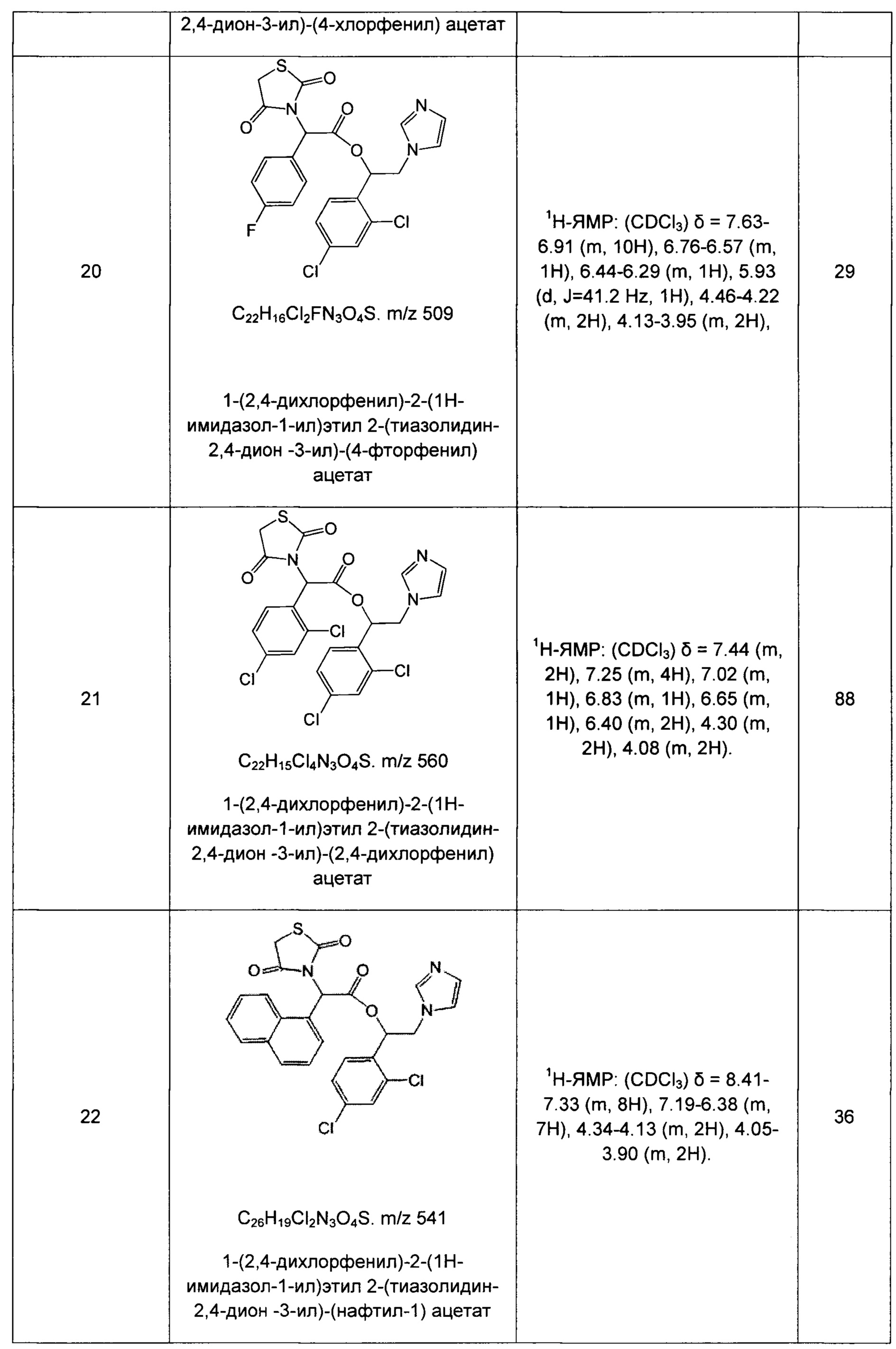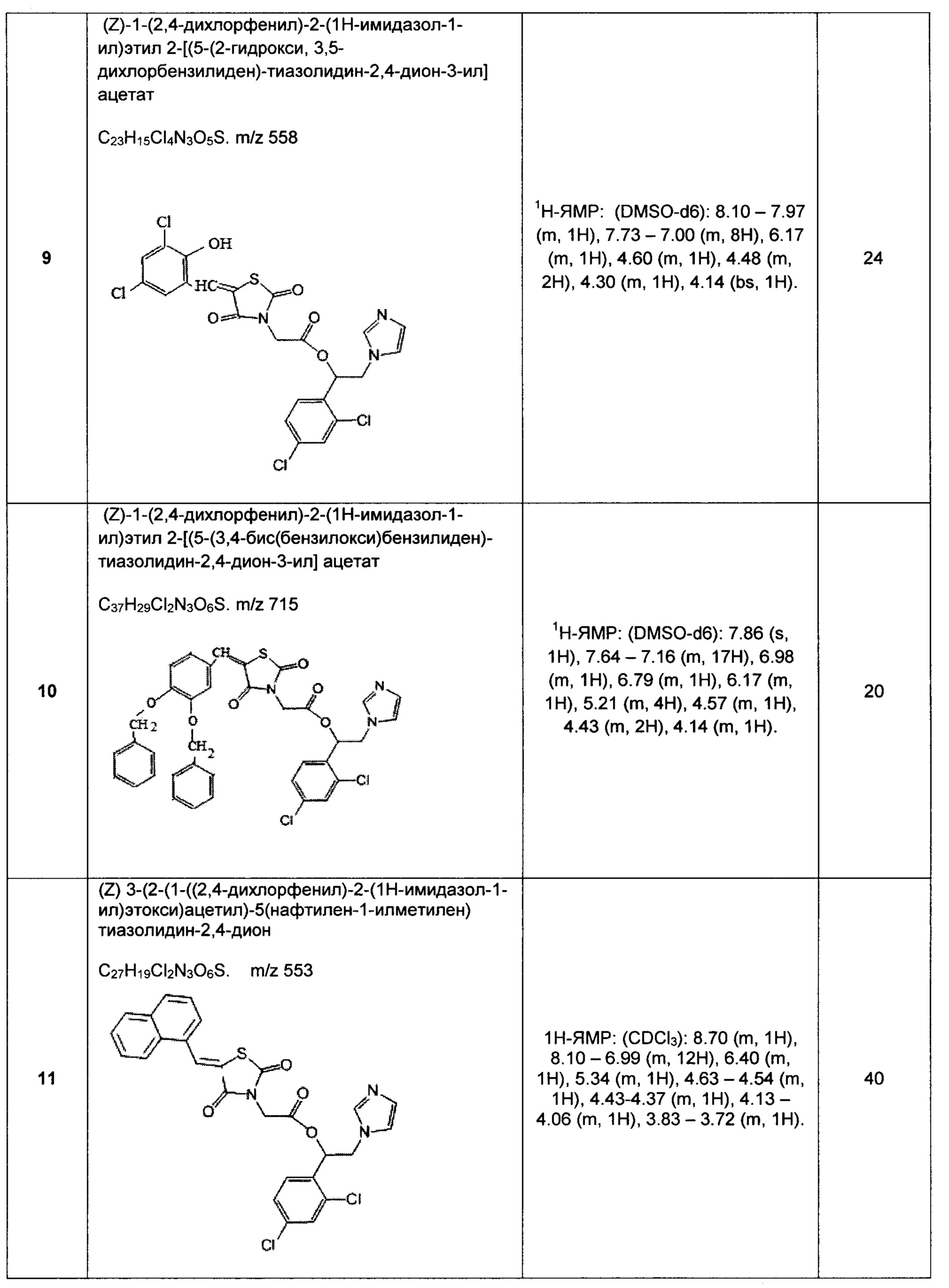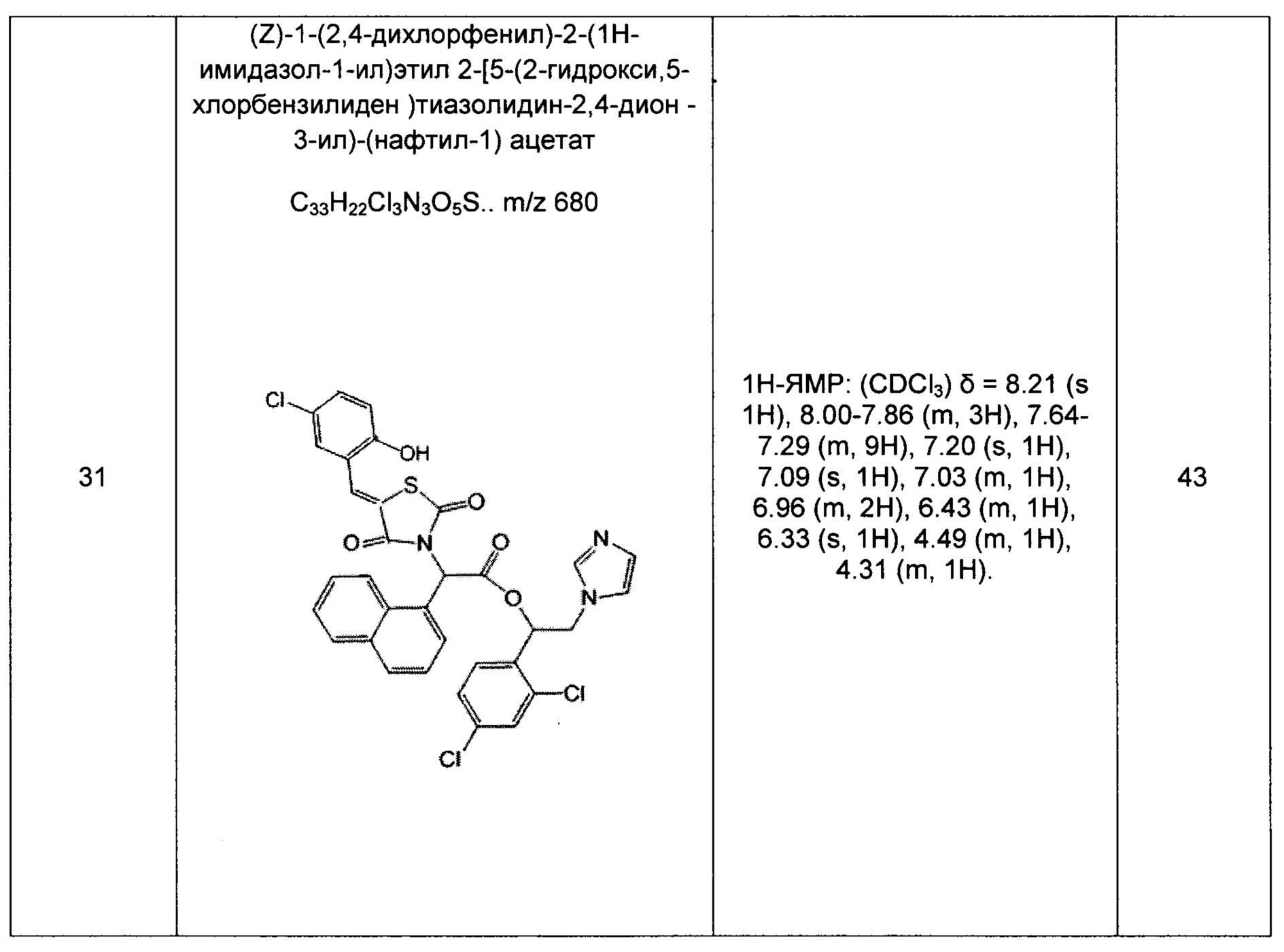 Область техники Изобретение относится к химии органических соединений, фармакологии и медицине и касается новых химических соединений, характеризующихся высокой противогрибковой активностью, которые, в частности, могут использоваться для профилактики и лечения инфекционных заболеваний у субъекта, в частности заболеваний, вызванных кандидозными и филоментозными патогенами. Уровень техники Недостаточная эффективность современной противомикробной терапии обусловлена в значительной степени развитием резистентности у возбудителей к имеющимся лекарственным препаратам. Именно поэтому во всем мире проводится интенсивный поиск и разработка новых эффективных лекарственных соединений. Несмотря на все усилия, современный арсенал медицинских средств недостаточен и не позволяет проводить эффективное лечение многих заболеваний, в том числе грибковых инфекций. Имеющиеся в настоящее время противогрибковые препараты - полиены и азолы, влияющие на главный компонент мембраны грибов - эргостерол, не обеспечивают должной избирательности действия. Они весьма токсичны, более того, многие штаммы возбудителей приобретают резистентность к препаратам группы азолов. Из уровня техники известны соединения, имеющие тиазолидиндионовый фрагмент и характеризующиеся противогрибковой активностью US 7105554, WO 2002022612, Thiazolidine and benzylidene thiazolidinedione inhibitors of mannosyltransferease as antifungal agents // Expert Opinion Ther. pat., Patent evaluation, 2002, 12,8, 1285-7. В данных документах описаны замещенные производные 5-бензилиден-2,4-тиазолидин-3 уксусной кислоты в качестве антимикотических средств, активных в отношении многих патогенных грибов. Из уровня техники известны также производные азола, характеризующиеся противогрибковой активностью WO 2005006860, Помимо этого описаны способы получения и противогрибковая активность ацильных производных азолов - широко известной группы противогрибковых средств, и, в частности, соединений, полученных путем ацилирования азольных гетероциклов по атому кислорода спиртовой части молекулы (Y. Wahbi et al. Aliphatic ethers and esters of 1-(2,4-dichlorophenyl)-2-(IH-imidazolyl)ethanol: study of antifungal activity against yeasts and hydrophobic character// Eur. J. Med. Chem, 1994, 29, 701-6.; D. De Vita et al. Synthesis and antifungal activity of a new series of 2-(1H-imidazol-1-yl)-1-phenylethanol derivatives // Eur. J. Med. Chem., 2012, 49, 334-342). Однако, как уже упоминалось выше, основном недостатком препаратов, на основе производных азолов, является растущая резистентность, что может свести на нет все прилагаемые усилия по лечению. Проблема еще усугубляется тем, что развивается перекрестная устойчивость ко всем используемым препаратам азольной группы (J.E. Parker. Resistance to antifungals that target CYP51 // J. Chem. Biol, 2014.). Поэтому сохраняется высокая необходимость в разработке новых эффективных противогрибковых средств для терапии широкого спектра заболеваний, вызванных грибковыми инфекциями. Раскрытие изобретения Задачей настоящего изобретения является разработка и создание новых эффективных противогрибковых средств, перспективных для применения в клинической практике для терапии и/или профилактики инфекционных заболеваний. Техническим результатом изобретения является разработка и получение новых химических соединений, обладающих высокой противогрибковой активностью, пониженной токсичностью и перспективных для применения в терапии инфекционных заболеваний у субъекта, в частности заболеваний, вызванных кандидозными и ф