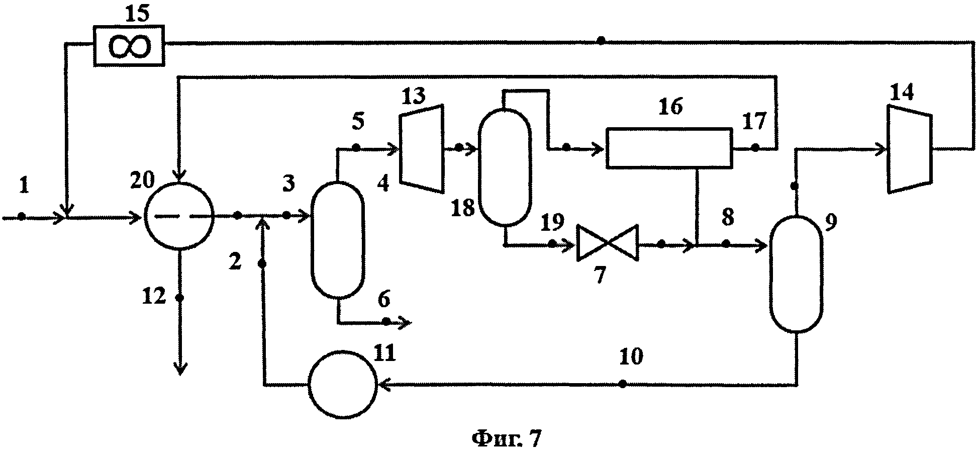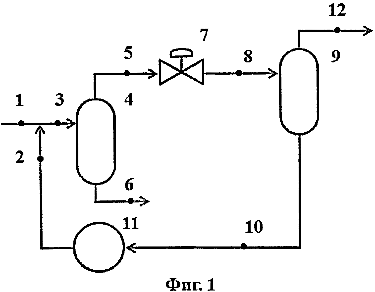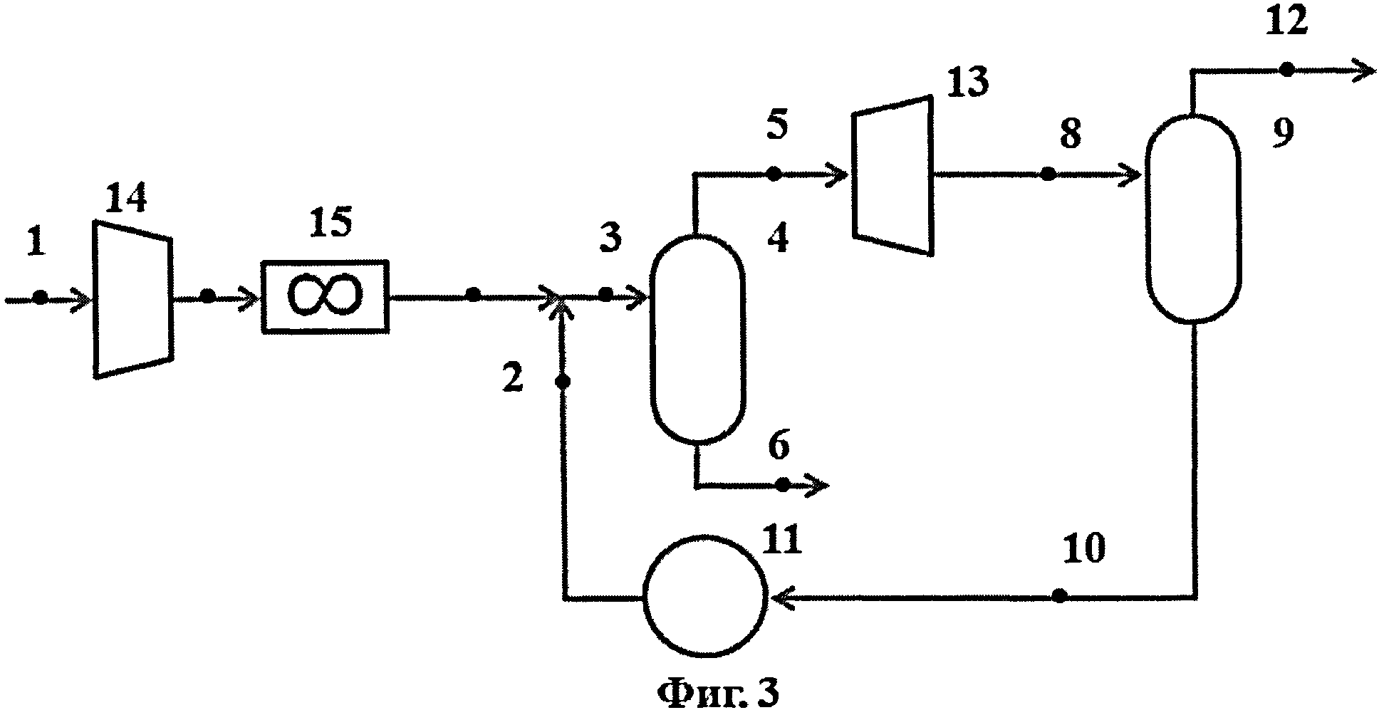 Настоящее изобретение может быть использовано в установках, предназначенных для дегидратации газов, содержащих углекислый газ. Известен способ дегидратации углекислого газа (см. патент СА 325811, 1932), в котором газ сжимается последовательно в двух компрессорах, после каждого компрессора газ охлаждают в аппаратах воздушного охлаждения (АВО) и направляют в трап, в котором из газа удаляют сконденсировавшуюся влагу. Газ из трапа далее поступает в адсорбер, где за счет процесса поглощения паров воды адсорбентами происходит окончательная дегидратация углекислого газа. Недостатком данного способа являются большие габариты установок, реализующих этот способ, обусловленные наличием адсорберов, а также необходимость подвода энергии при регенерации адсорбента. Ближайшим аналогом является способ дегидратации высоконапорного газа (JP 63074908, 1988), обогащенного углекислым газом, в котором газ, содержащий СО2, охлаждается при помощи аппарата АВО, охлажденный газ расширяется в дроссельном клапане или турбине. Вода, образовавшаяся после расширения, отделяется от газа в сепараторе, газ из сепаратора сжимается в компрессоре, охлаждается с помощью АВО и направляется к потребителю газа. Существенным недостатком описанного способа является невозможность обеспечения глубокой дегидратации газа, из-за невозможности обеспечения низких температур газа в процессе его расширения. Целью технического решения по настоящему изобретению является обеспечение высокой степени дегидратации газа, содержащего СО2, путем охлаждения газа до низких температур, при которых происходит образование жидкого СО2 с растворенной в нем водой. Поставленная цель достигается тем, что в предлагаемом способе дегидратации газа, содержащего СО2, основанном на получении двухфазной смеси при ее расширении и выделении из смеси жидкой фазы в сепараторе, согласно изобретению, сырой газ охлаждают, подмешивая к нему жидкий СО2 с растворенной в нем водой, полученную смесь разделяют на газовую фазу и жидкую фазу, содержащую воду, газовую фазу расширяют с получением жидкости, содержащей жидкий СО2 и воду, жидкость частично или полностью направляют на смешение с сырым газом, при этом расширение проводят до температуры ниже температуры гидратообразования. В процессе расширения газ могут пропускать через дроссельный клапан или турбодетандер. В случае расширения газа в турбодетандере осушенный или сырой газ можно сжимать в компрессоре, установленном на одном валу с турбодетандером. Газ могут расширять также во вращающемся потоке в канале циклонного сепаратора или в канале вихревой трубы. Процесс расширения можно проводить, по крайней мере, в две стадии, причем в одной из стадий расширение проводится в циклонном сепараторе и/или в дроссельном клапане. Двухфазную смесь, полученную после расширения, можно сепарировать на осушенный газ и двухфазный поток, из которого выделять жидкость в дополнительном сепараторе, газ из дополнительного сепаратора сжимать, охлаждать и смешивать с сырым газом. Газ и/или смесь, образовавшуюся после смешения газа с жидкостью, содержащей воду, можно охлаждать. На Фиг.1 представлена принципиальная схема установки для осуществления предлагаемого способа низкотемпературной дегидратации газа, содержащего СО2. Установка работает следующим образом. Сыр