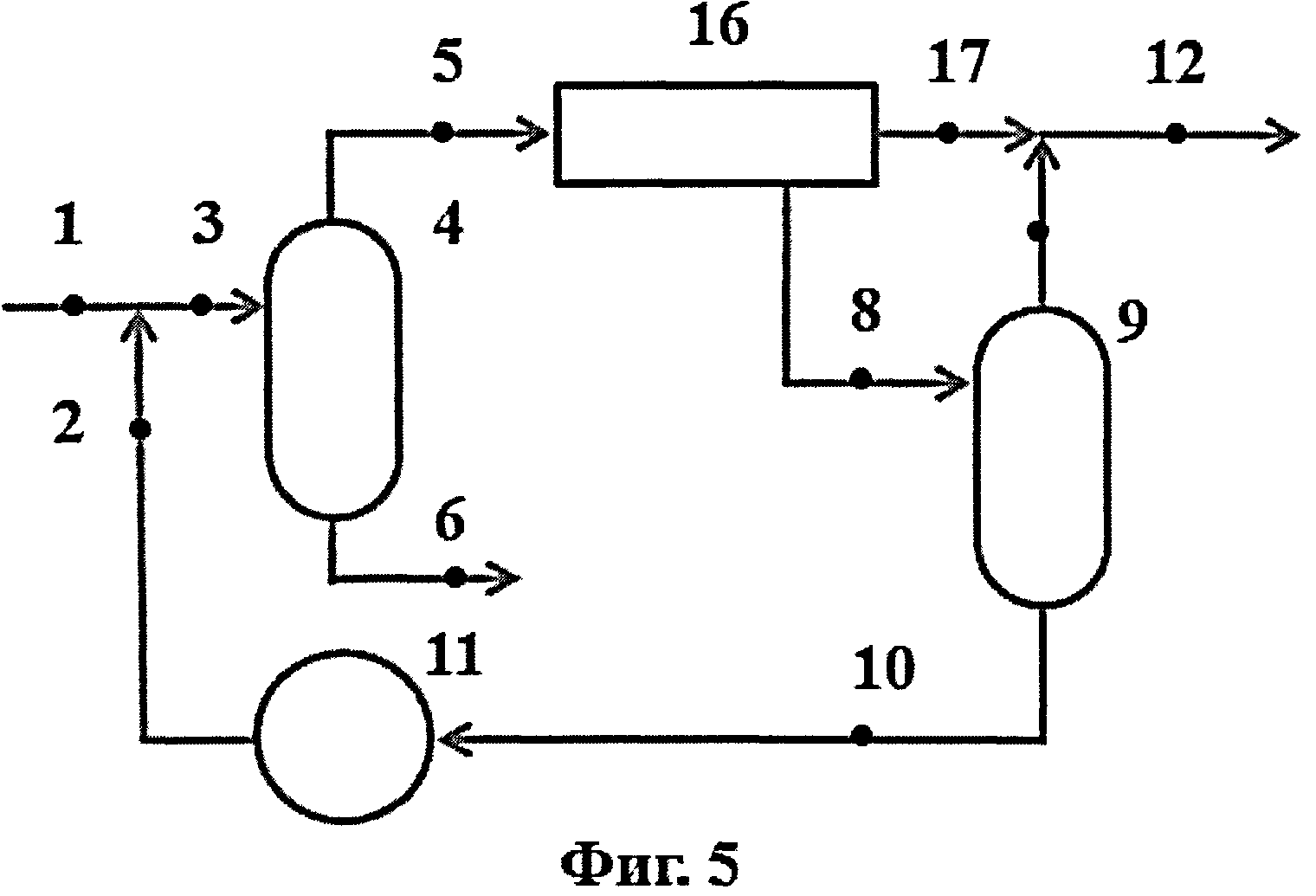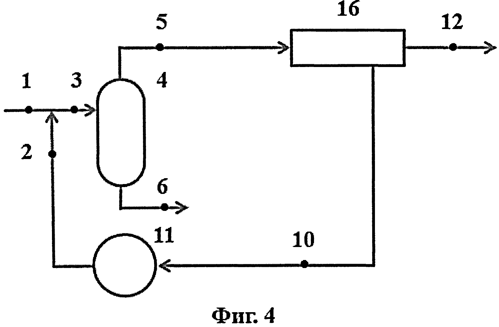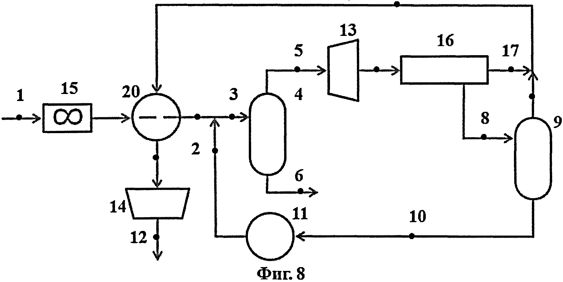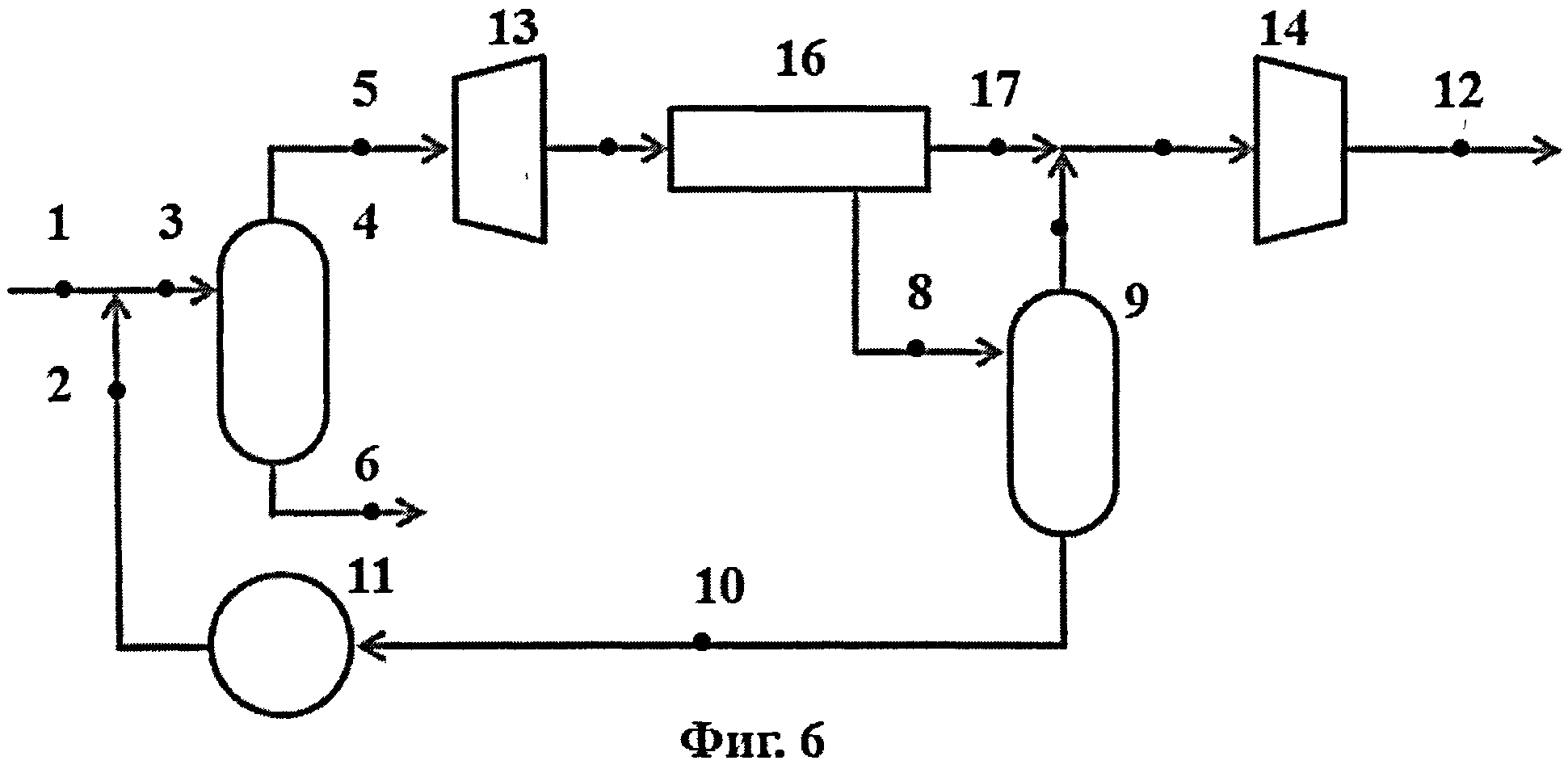 Настоящее изобретение может быть использовано в установках, предназначенных для дегидратации газов, содержащих углекислый газ. Известен способ дегидратации углекислого газа (см. патент СА 325811, 1932), в котором газ сжимается последовательно в двух компрессорах, после каждого компрессора газ охлаждают в аппаратах воздушного охлаждения (АВО) и направляют в трап, в котором из газа удаляют сконденсировавшуюся влагу. Газ из трапа далее поступает в адсорбер, где за счет процесса поглощения паров воды адсорбентами происходит окончательная дегидратация углекислого газа. Недостатком данного способа являются большие габариты установок, реализующих этот способ, обусловленные наличием адсорберов, а также необходимость подвода энергии при регенерации адсорбента. Ближайшим аналогом является способ дегидратации высоконапорного газа (JP 63074908, 1988), обогащенного углекислым газом, в котором газ, содержащий СО2, охлаждается при помощи аппарата АВО, охлажденный газ расширяется в дроссельном клапане или турбине. Вода, образовавшаяся после расширения, отделяется от газа в сепараторе, газ из сепаратора сжимается в компрессоре, охлаждается с помощью АВО и направляется к потребителю газа. Существенным недостатком описанного способа является невозможность обеспечения глубокой дегидратации газа, из-за невозможности обеспечения низких температур газа в процессе его расширения. Целью технического решения по настоящему изобретению является обеспечение высокой степени дегидратации газа, содержащего СО2, путем охлаждения газа до низких температур, при которых происходит образование жидкого СО2 с растворенной в нем водой. Поставленная цель достигается тем, что в предлагаемом способе дегидратации газа, содержащего СО2, основанном на получении двухфазной смеси при ее расширении и выделении из смеси жидкой фазы в сепараторе, согласно изобретению, сырой газ охлаждают, подмешивая к нему жидкий СО2 с растворенной в нем водой, полученную смесь разделяют на газовую фазу и жидкую фазу, содержащую воду, газовую фазу расширяют с получением жидкости, содержащей жидкий СО2 и воду, жидкость частично или полностью направляют на смешение с сырым газом, при этом расширение проводят до температуры ниже температуры гидратообразования. В процессе расширения газ могут пропускать через дроссельный клапан или турбодетандер. В случае расширения газа в турбодетандере осушенный или сырой газ можно сжимать в компрессоре, установленном на одном валу с турбодетандером. Газ могут расширять также во вращающемся потоке в канале циклонного сепаратора или в канале вихревой трубы. Процесс расширения можно проводить, по крайней мере, в две стадии, причем в одной из стадий расширение проводится в циклонном сепараторе и/или в дроссельном клапане. Двухфазную смесь, полученную после расширения, можно сепарировать на осушенный газ и двухфазный поток, из которого выделять жидкость в дополнительном сепараторе, газ из дополнительного сепаратора сжимать, охлаждать и смешивать с сырым газом. Газ и/или смесь, образовавшуюся после смешения газа с жидкостью, содержащей воду, можно охлаждать. На Фиг.1 представлена принципиальная схема установки для осуществления предлагаемого способа низкотемпературной дегидратации газа, содержащего СО2. Установка работает следующим образом. Сыр