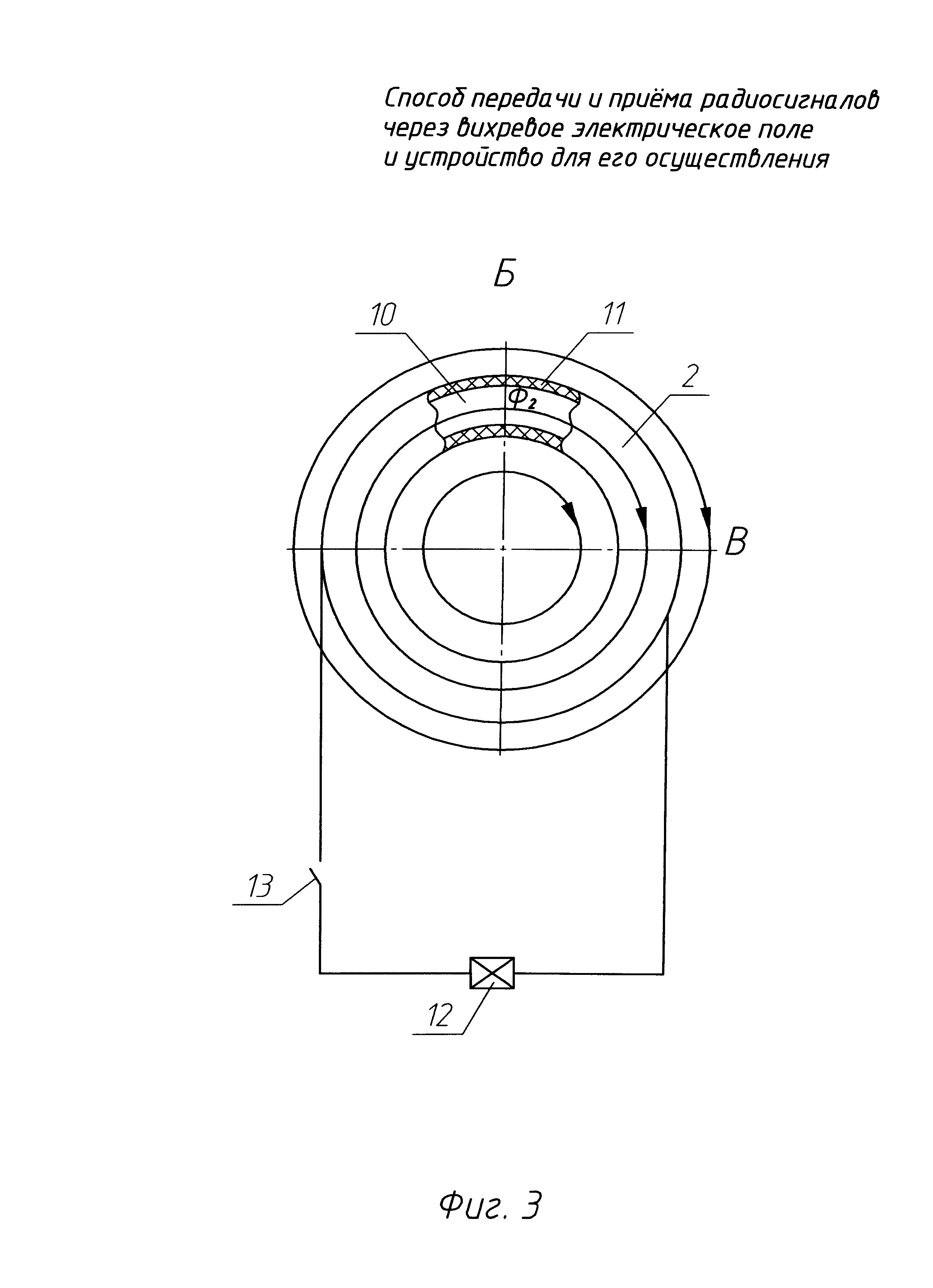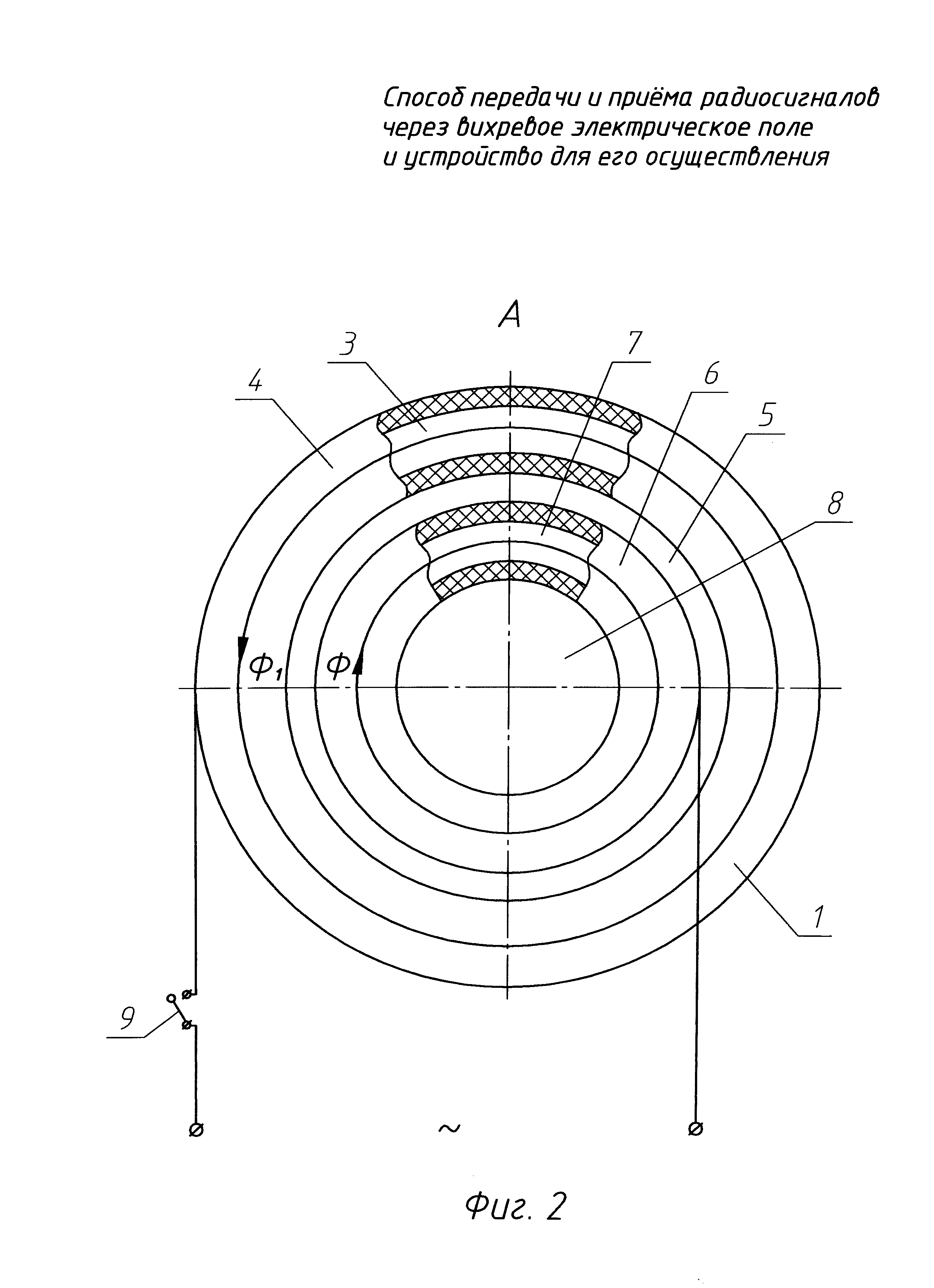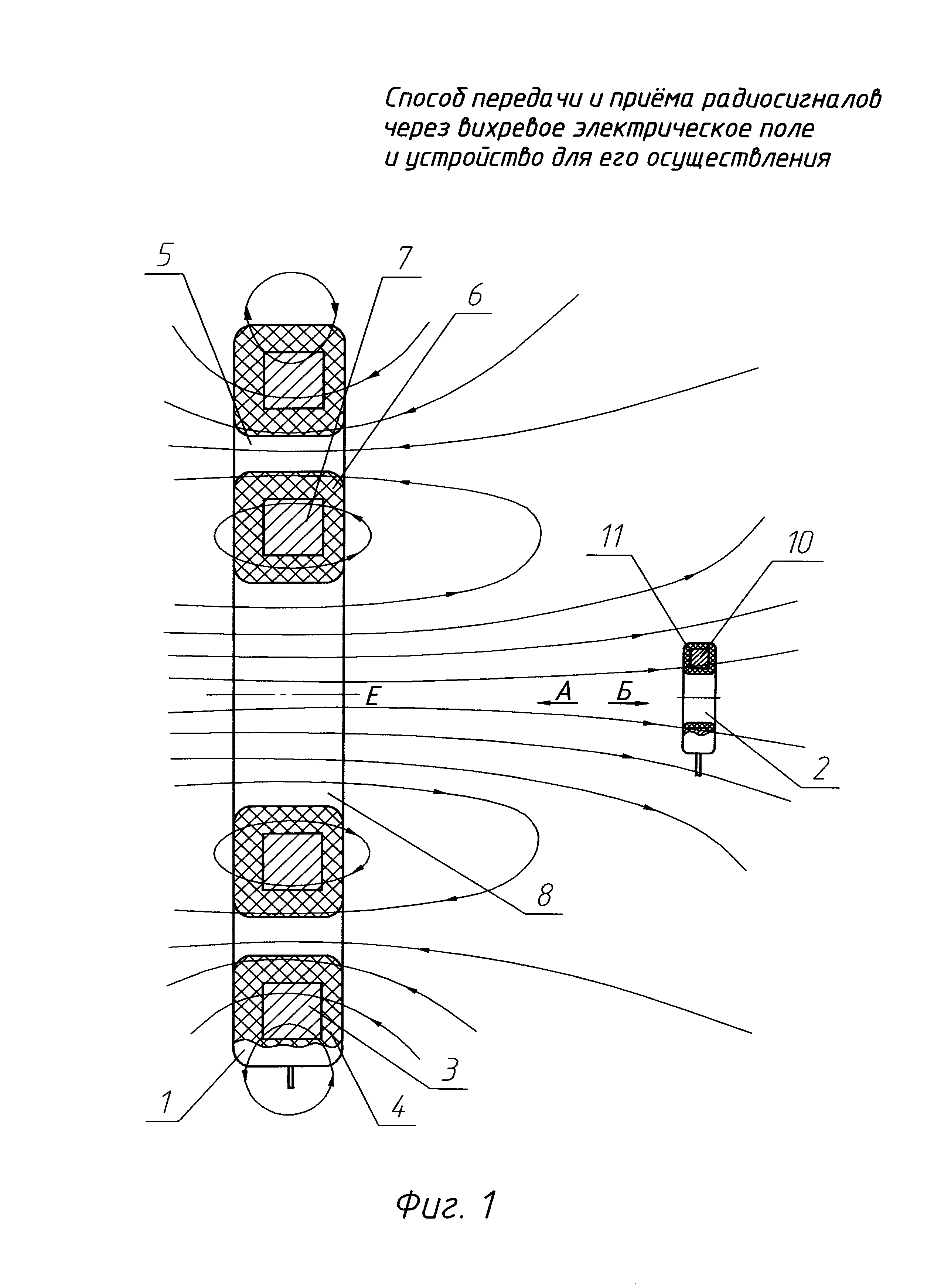 Предлагаемое изобретение относится к области радиотехники и может быть использовано для передачи и приема информации. Известно устройство связи (патент RU №2116700 Устройство связи, МПК H04B 14/00), которое содержит передатчик, линию связи, приемник. Недостатком этого устройства является то, что вероятный противник располагает техническими средствами для обнаружения радиосигналов, исходящих от передатчика, а также определения места его нахождения. Магистральная линия связи, МПК H04B 3/34), которое содержит магистральные N-канальные линии связи, подключенные с перекрещиванием или без перекрещивания в зависимости от значений заданной расчетной функции. Недостатком этого устройства является то, что его невозможно использовать на транспорте и нецелесообразно применять в тех случаях, когда абоненты часто меняют место своего нахождения. Известен способ передачи и приема информации и устройство для его осуществления (патент RU №2319305 Способ передачи и приема информации и устройство для его осуществления, МПК H04B 14/00). Этот способ включает преобразование по установленному закону передаваемой информации в соответствующие изменения электрического тока, проходящего через определенные вещества. Устройство, функционирующее в данном способе, содержит передатчик, приемник, антенну при беспроволочной передаче или двухпроводную линию при проводной передаче. Недостатком этого способа и устройства является то, что их невозможно использовать на транспорте при проводной передаче и не обеспечивается скрытность информации при работе в эфире. Наиболее близким техническим решением, выбранным за прототип, является способ передачи информации в системах с кодовым разделением каналов и устройство для его осуществления (патент RU №2475961 Способ передачи информации в системах с кодовым разделением каналов и устройство для его осуществления, МПК H04B 7/216). Данный способ заключается в одновременном транслировании сложных широкополосных сигналов на фоне сигнала синхронизации, а устройство имеет высокоскоростную систему передачи конфиденциальной информации. Недостатком этого способа и устройства является отсутствие гарантии того, что вероятный противник не сможет обработать сигнал с целью получения конфиденциальной информации. Техническим результатом предполагаемого изобретения является осуществление незаметной для вероятного противника радиосвязи. Технический результат достигается предлагаемым способом передачи и приема радиосигналов через вихревое электрическое поле, включающим излучение радиоволн в эфир, прием радиоволн, усиление и преобразование принятого радиосигнала. При этом для передачи радиосигнала используют вихревое электрическое поле, циркулирующее относительно магнитопровода передатчика. А для приема радиосигнала используют явление магнитоэлектрической индукции, возникающее при пронизывании магнитопровода приемника вихревым электрическим полем и воздействии на магнитопровод порожденного им переменного магнитного поля. Магнитное поле создает индукционный переменный магнитный поток, индуцирующий в катушке, расположенной на магнитопроводе, электрическую движущую силу (э.д.с.). Катушка приемника, в свою очередь, подключается к блоку усиления, преобразования и отделения от помех радиосигналов. Устройство передачи и