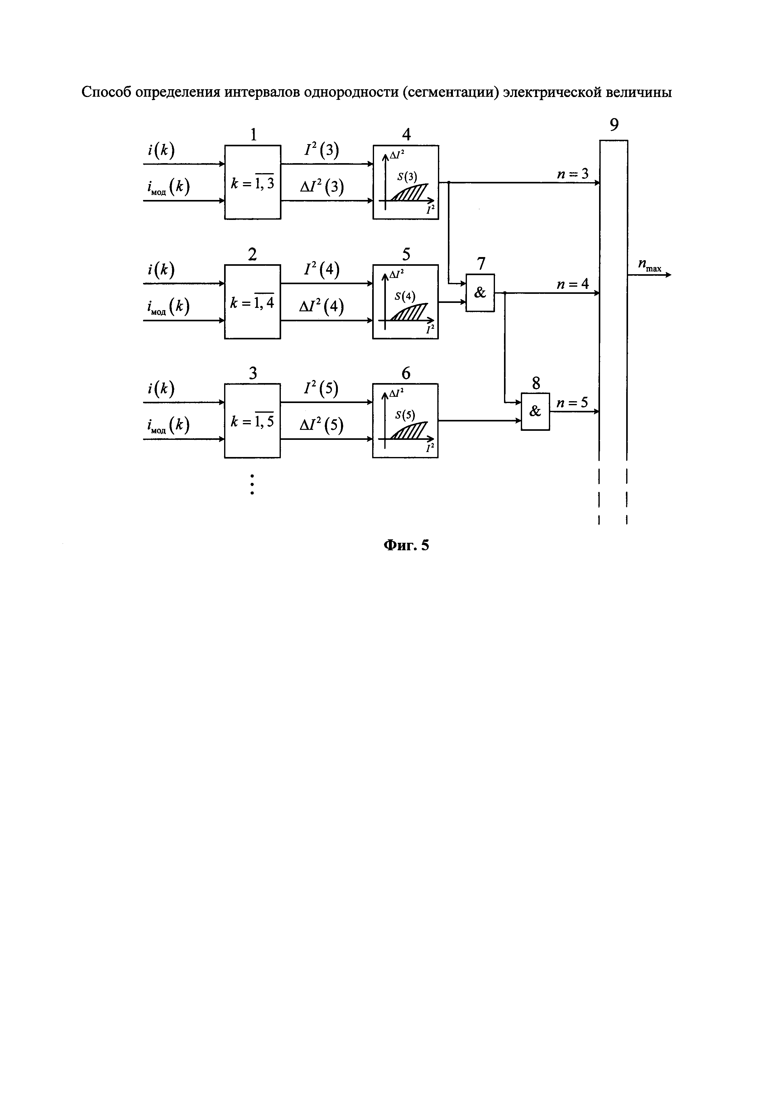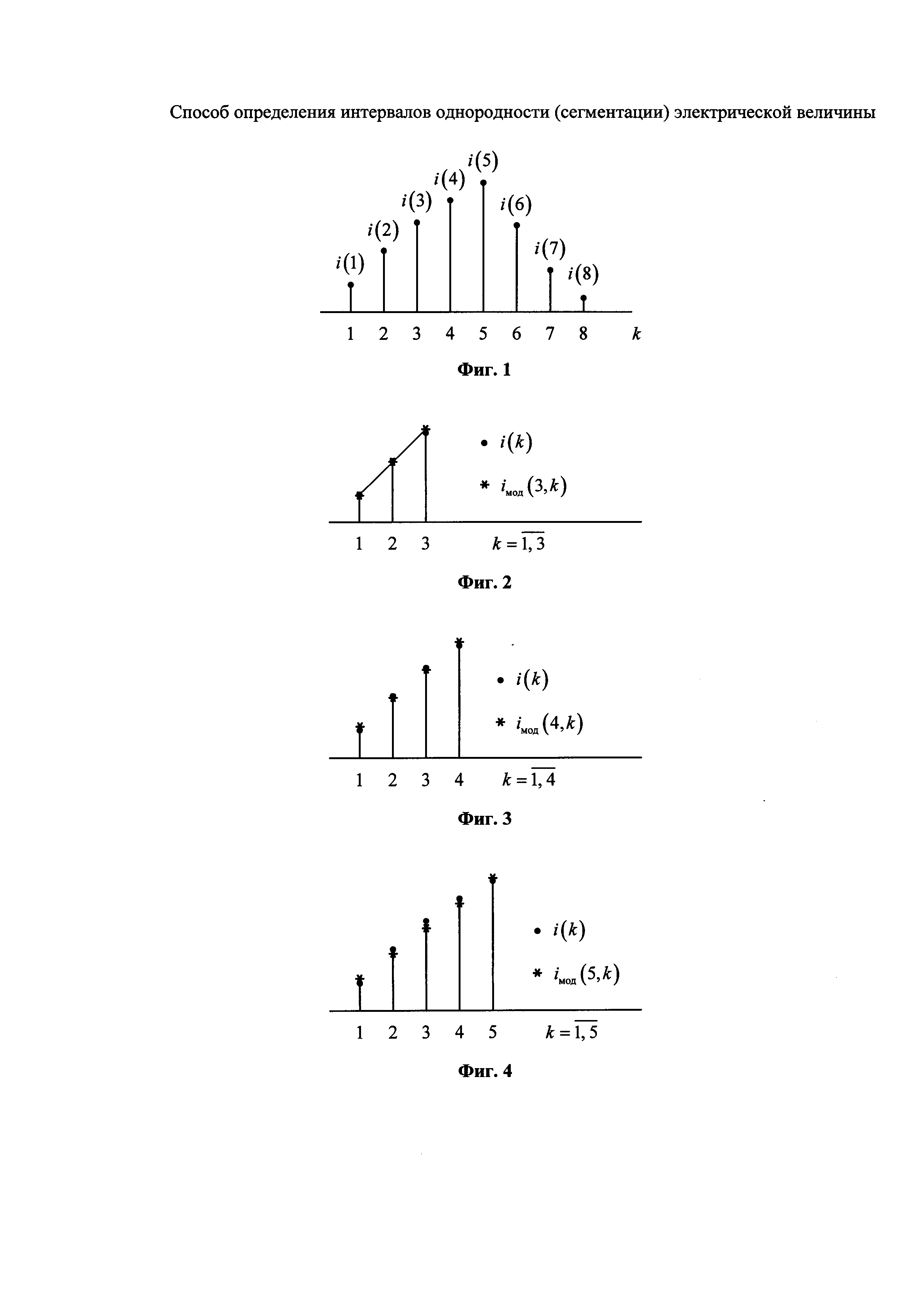 1. Способ определения интервалов однородности (сегментации) электрической величины, согласно которому отсчеты электрической величины сравнивают с отсчетами модельного сигнала, формируют по результатам сравнения двумерный сигнал, которым воздействуют на распознающий модуль, задают на плоскости двумерного сигнала область срабатывания распознающего модуля, отображают двумерный сигнал на его плоскости и фиксируют интервал однородности в случае попадания отображения в область срабатывания, отличающийся тем, что упомянутые операции выполняют поочередно на разных интервалах наблюдения электрической величины, каждый из которых продолжительнее предыдущего на один интервал дискретизации, причем первый интервал наблюдения выбирают из условия превышения числом отсчетов электрической величины на единицу числа варьируемых параметров модельного сигнала, на каждом интервале наблюдения формируют индивидуальный двумерный сигнал, которым воздействуют на индивидуальный модуль с собственной областью срабатывания, переходят от предыдущего интервала наблюдения к последующему в случае срабатывания распознающего модуля предыдущего интервала и определяют интервал однородности электрической величины как последний из интервалов наблюдения, на котором будет зафиксировано срабатывание его распознающего модуля. 2. Способ по п. 1, отличающийся тем, что каждый двумерный сигнал составляют из сигнала оценки уровня электрической величины на интервале ее наблюдения и из сигнала невязки между электрической величиной и модельным сигналом на том же интервале. 3. Способ по п. 1, отличающийся тем, что используют линейный модельный сигнал iмод(n,k)=xл(n)+yл(n)k, где k=1, 2, … - дискретное время; n≥3 - число отсчетов электрической величины i(k) на интервале наблюдения xл(n)=bл(n)pл(n,i)- yл(n)=- где сигнал оценки уровня электрической величины определяют как а сигнал невязки - 4. Способ по п. 1, отличающийся тем, что используют синусоидальный модельный сигнал частоты сети iмод(n,k)=xс(n)sinαk+yс(n)cosαk, где α=ωτ; ω - частота сети; τ - интервал дискретизации, хс(n), yс(n) - варьируемые параметры модельного сигнала.