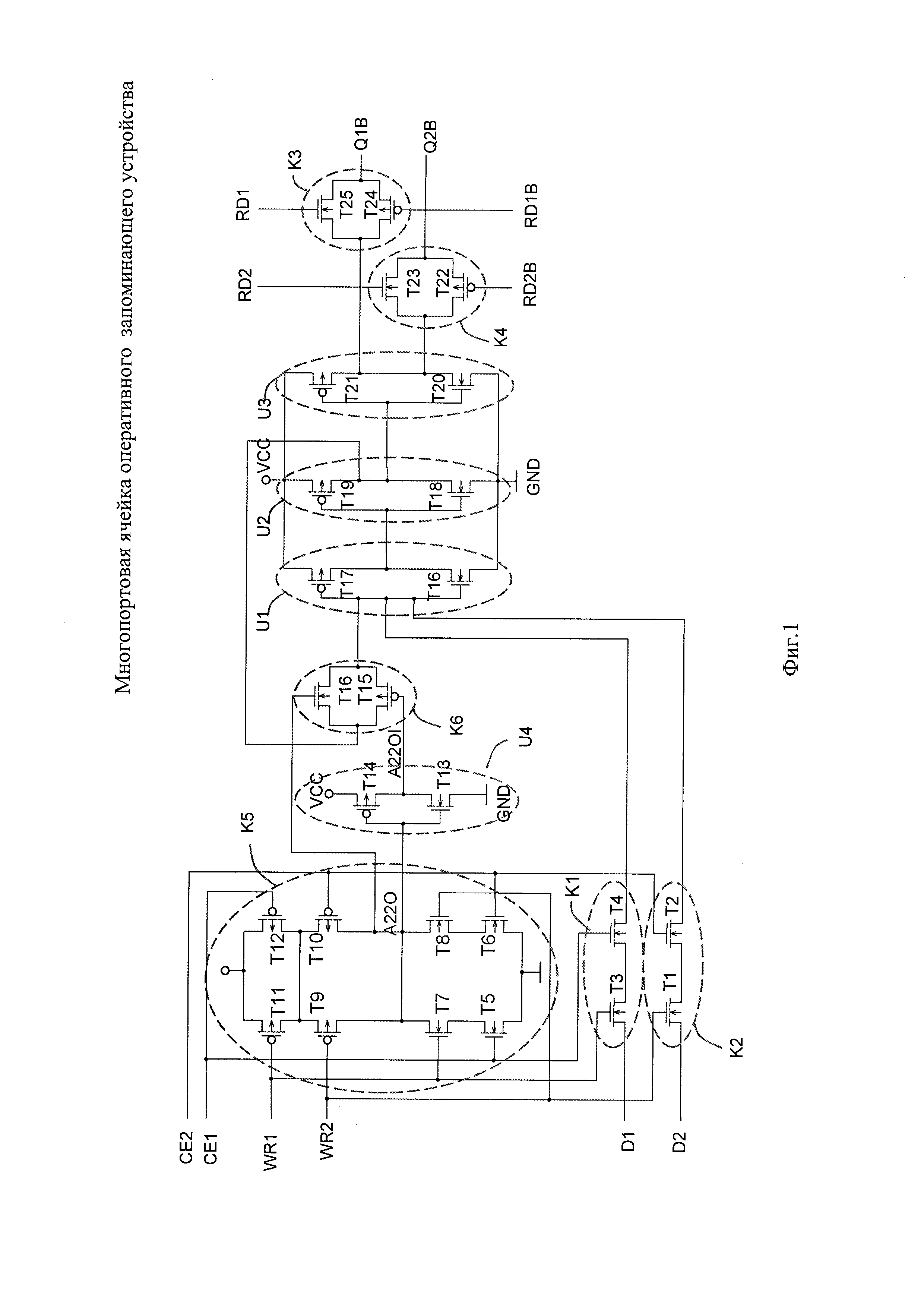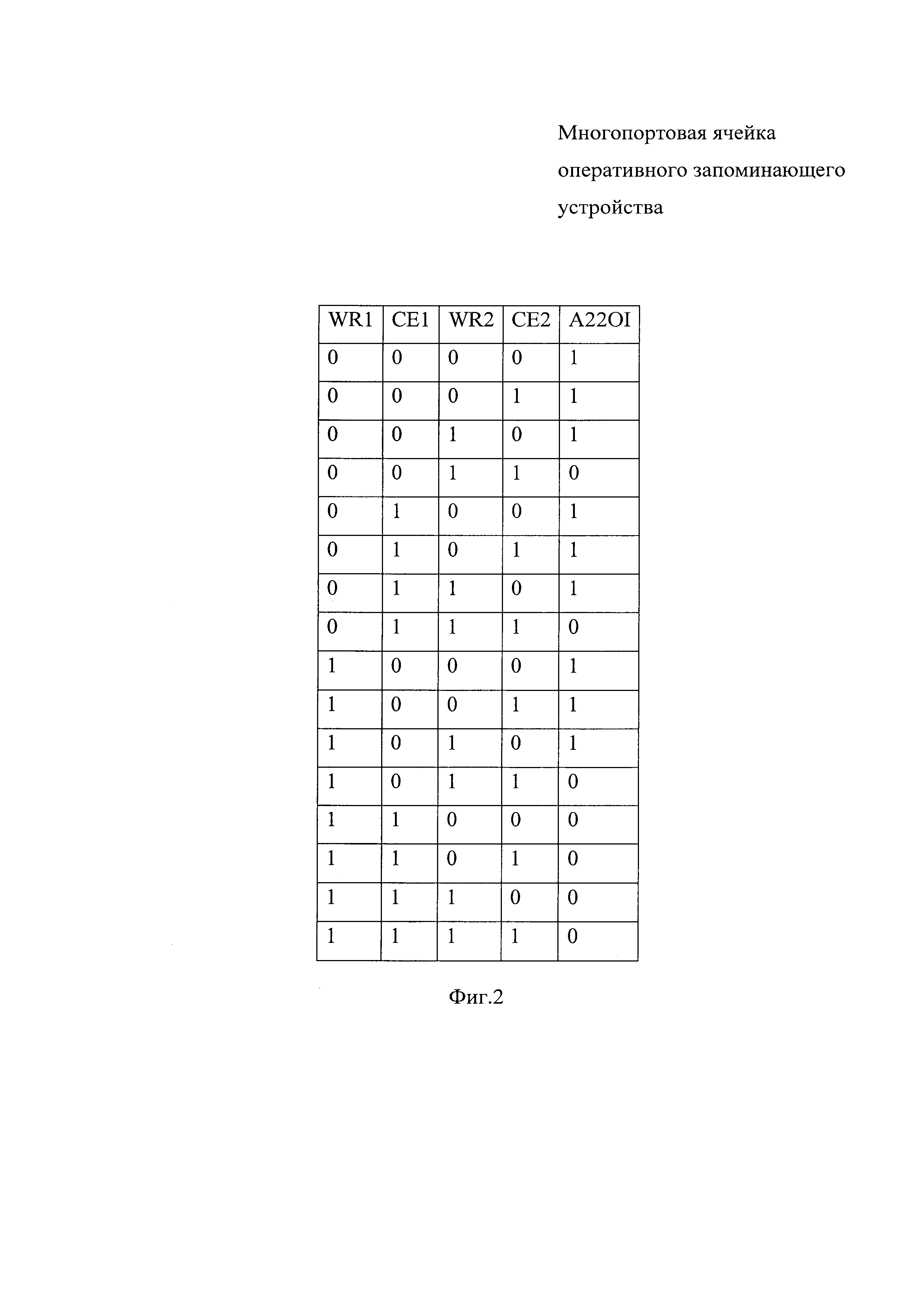 Ячейка оперативного запоминающего устройства, содержащая три последовательно соединенных инвертора; вход первого инвертора соединен первой входной шиной данных через первый проходной ключ записи данных; вход первого инвертора соединен со второй входной шиной данных через второй проходной ключ записи данных; выход первого инвертора соединен с входом второго инвертора; выход второго инвертора соединен с входом первого инвертора через комплементарный проходной ключ перезаписи, один затвор которого управляется выходным сигналом четырехвходовой схемы 2И-2ИЛИ-НЕ, второй затвор ключа перезаписи управляется выходным сигналом четырехвходовой схемы 2И-2ИЛИ-НЕ через четвертый инвертор, при этом входами схемы 2И-2ИЛИ-НЕ являются адресные входы записи и выбора столбца обоих портов; вход третьего инвертора соединен с выходом второго инвертора, выход третьего инвертора соединен с первой выходной разрядной шиной через третий комплементарный проходной ключ, управляемый первой адресной шиной чтения данных и ее инверсией, и соединен со второй выходной разрядной шиной через четвертый комплементарный проходной ключ, управляемый второй адресной шиной чтения данных и ее инверсией; причем первый проходной ключ записи данных выполнен из двух последовательно включенных транзисторов, затворы которых управляются первой адресной шиной записи и первой адресной шиной выбора столбца, второй проходной ключ записи данных выполнен из двух последовательно включенных транзисторов, затворы которых управляются второй адресной шиной записи и второй адресной шиной выбора столбца.