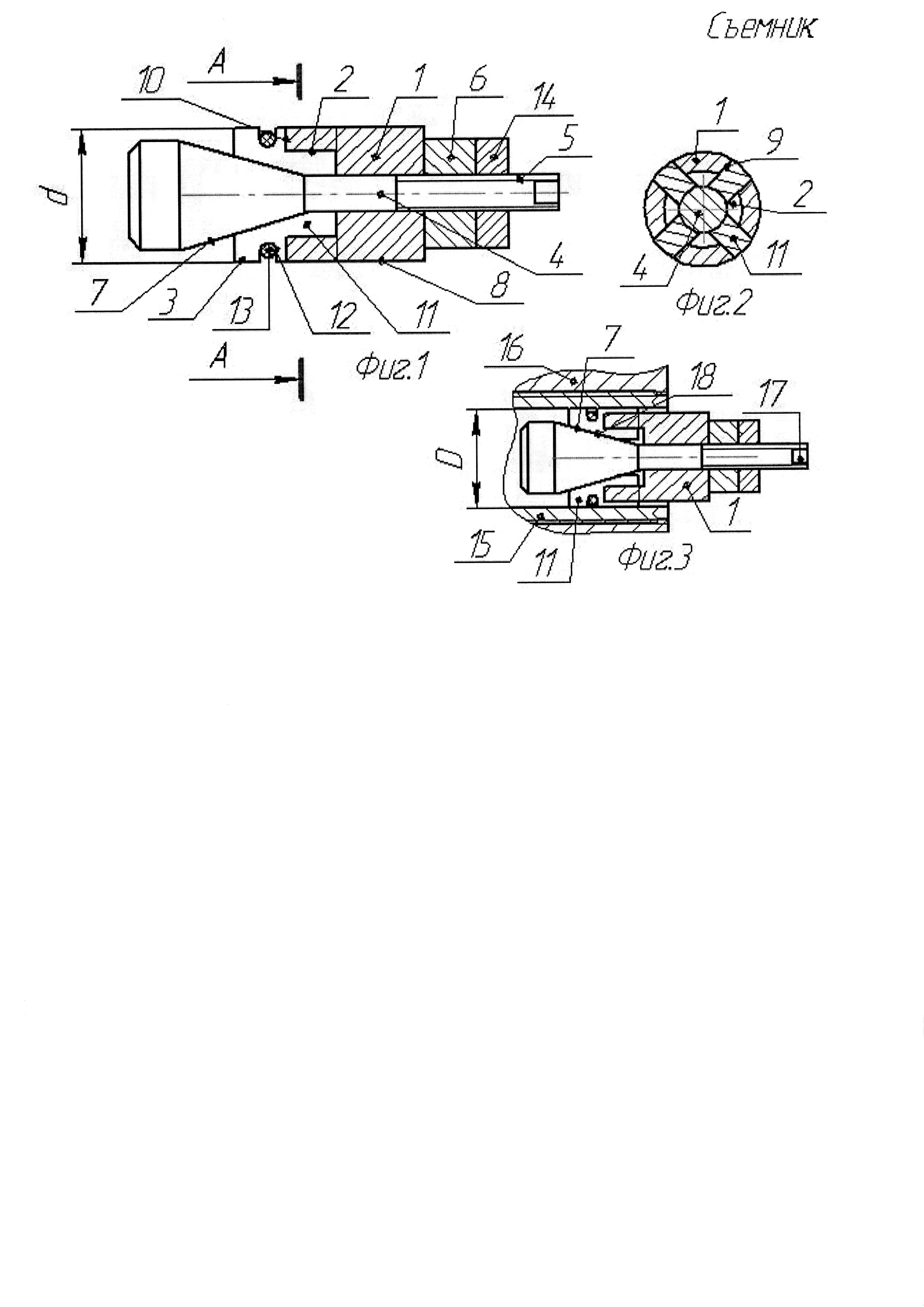 Изобретение относится к съемникам для извлечения полой детали с оборванной резьбовой частью. Съемник содержит втулку, выполненную с соосно расположенной цилиндрической выборкой и снабженную элементами зацепления, и тягу, имеющую на одном конце наружную резьбу с гайкой, а на другом конце - конический участок, расположенный напротив цилиндрической выборки втулки. Элементы зацепления выполнены с возможностью контакта с коническим участком. Тяга выполнена с возможностью осевого перемещения внутри втулки. Втулка выполнена с гладкой наружной боковой стенкой и с четырьмя продольными пазами, выполненными с торца втулки, обращенного к коническому участку тяги, а элементы зацепления выполнены в виде плашек для сцепления с внутренней стенкой извлекаемой детали, которые установлены в продольные пазы с возможностью продольного и радиального перемещения. На наружной стенке плашек выполнен поперечный паз, причем в продольные пазы установлено резиновое кольцо, прижимающее плашки к тяге, а на резьбовой конец тяги навернута контргайка. Технический результат заключается в расширении технических возможностей съемника. 3 ил.