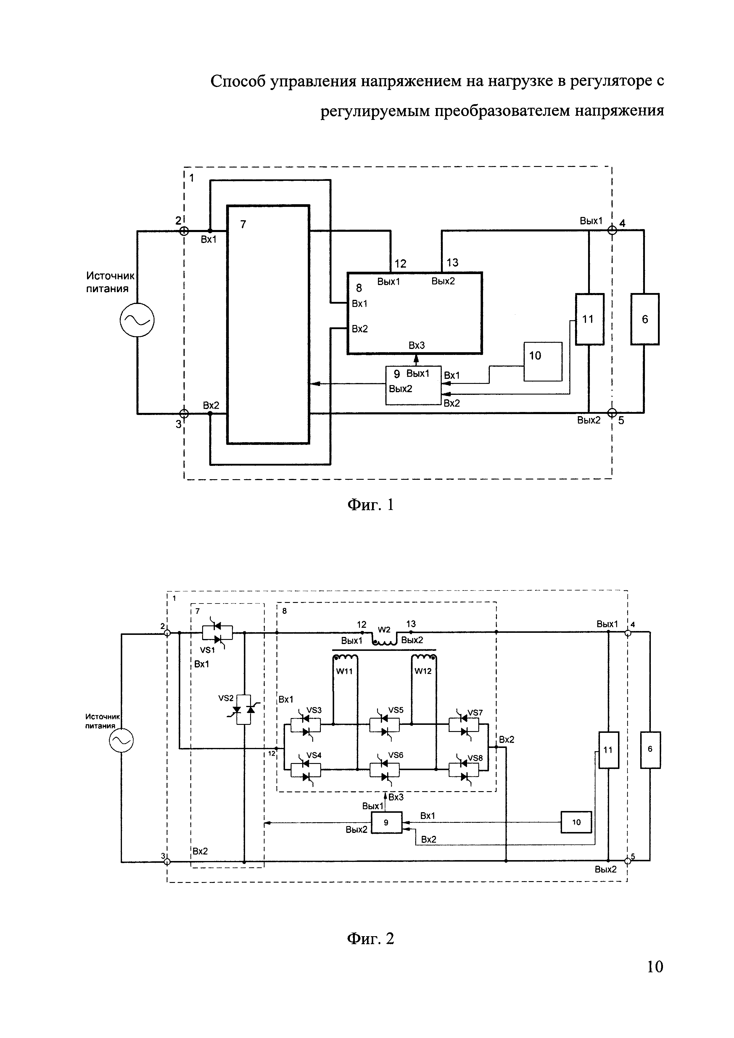 Способ управления напряжением на нагрузке в регуляторе с регулируемым преобразователем напряжения, входные зажимы которого подключены к зажимам источника питания, а выходные зажимы включены последовательно с нагрузкой, системой управления, содержащей датчик напряжения, включенный параллельно нагрузке, блок управления, подключенный к управляющему входу регулируемого преобразователя напряжения, и блок задания уровня напряжения нагрузки, включающий задание диапазона регулирования напряжения на выходе регулируемого преобразователя напряжения, измерение напряжения на нагрузке датчиком напряжения, сравнение измеренного значения напряжения на нагрузке с требуемым напряжением на нагрузке в блоке управления регулируемого преобразователя напряжения и формирование сигнала управления на выходе блока управления, устанавливающего напряжение на выходе регулируемого преобразователя напряжения, обеспечивающего требуемое напряжение на нагрузке, отличающийся тем, что в блоке управления сравнивают требуемое значение напряжения на нагрузке с диапазоном регулирования выходного напряжения регулируемого преобразователя напряжения и, если требуемое значение напряжения на нагрузке не превышает диапазон регулирования выходного напряжения регулируемого преобразователя напряжения, то ветвь, состоящую из последовательного соединения нагрузки и выходных зажимов регулируемого преобразователя напряжения, замыкают накоротко, а если требуемое значение напряжения на нагрузке превышает диапазон регулирования выходного напряжения регулируемого преобразователя напряжения, то ветвь, состоящую из последовательного соединения нагрузки и выходных зажимов регулируемого преобразователя напряжения, подключают к зажимам источника питания.