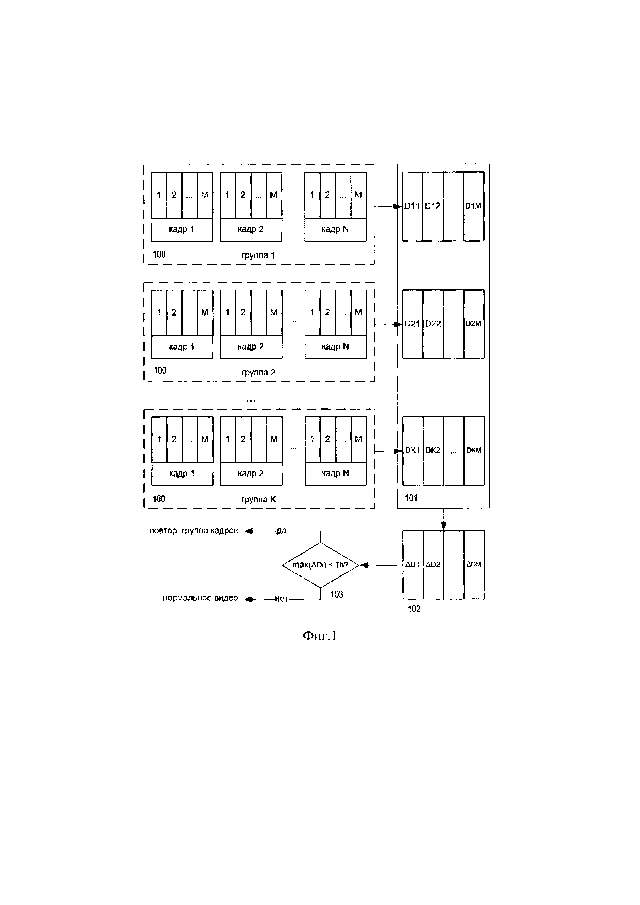 1. Способ выявления повторяющихся кадров видео в системе цифрового телевидения, заключающийся в сравнении значений яркости пикселей соседних кадров видео, отличающийся тем, что разбивают последовательность кадров видео на K групп, каждая из которых содержит N соседних кадров, затем каждый из кадров разбивают на М сегментов равной площади с вычислением для каждого из них среднего арифметического значения яркости пикселей, далее для каждой j-й группы кадров вычисляют математическое ожидание и среднеквадратическое отклонение значений яркости каждого i-го сегмента кадра D[i, j], выбирают для каждого из i максимальное и минимальное значение Dmax[i] и Dmin[i], после чего вычисляют М разностей ΔD[i]=Dmax[i]-Dmin[i] и, если максимальное из ΔD[i] меньше порогового значения, диагностируют наличие повторяющихся кадров в видео. 2. Способ по п. 1, отличающийся тем, что дополнительно сохраняют в базе данных пороговое значение. 3. Способ по п. 1, отличающийся тем, что дополнительно сохраняют в базе данных информацию о фактах выявления повторяющихся кадров, а также отсчеты времени, соответствующие данным фактам. 4. Способ по п. 3, отличающийся тем, что информацию о фактах выявления повторяющихся кадров дополнительно отображают на мониторе оператора. 5. Способ по п. 3, отличающийся тем, что дополнительно сохраняют в базе данных географические координаты места выявления повторяющихся кадров. 6. Способ по п. 3, отличающийся тем, что результаты выявления повторяющихся кадров передают в центр распространения видеопрограммы. 7. Способ по п. 3, отличающийся тем, что выявление повторяющихся кадров видео осуществляют на стационарном пункте мониторинга качества телевещания. 8. Способ по п. 5, отличающийся тем, что выявление повторяющихся кадров видео осуществляют на мобильном пункте мониторинга качества телевещания. 9. Способ по п. 1, отличающийся тем, что N выбирают в интервале от 2 до 64 кадров.