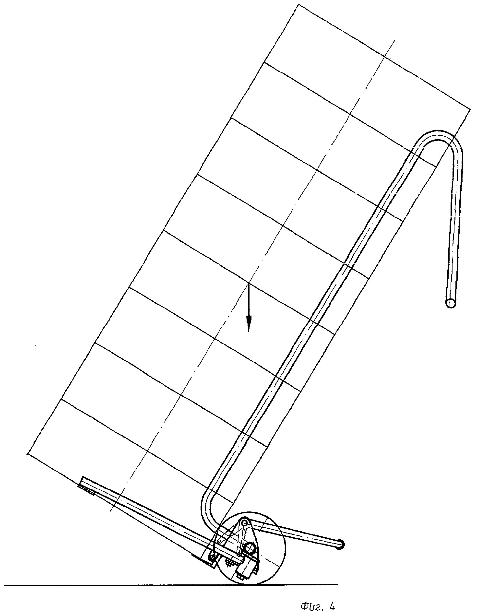 лезвиями клинообразных зацепов поз.12 внедряются под низ нижней шины. Опираясь одной ногой на ось поз.2 тележки и одновременно подавая рукоятку тележки поз.4 на себя, рабочий кантует штабель шин в