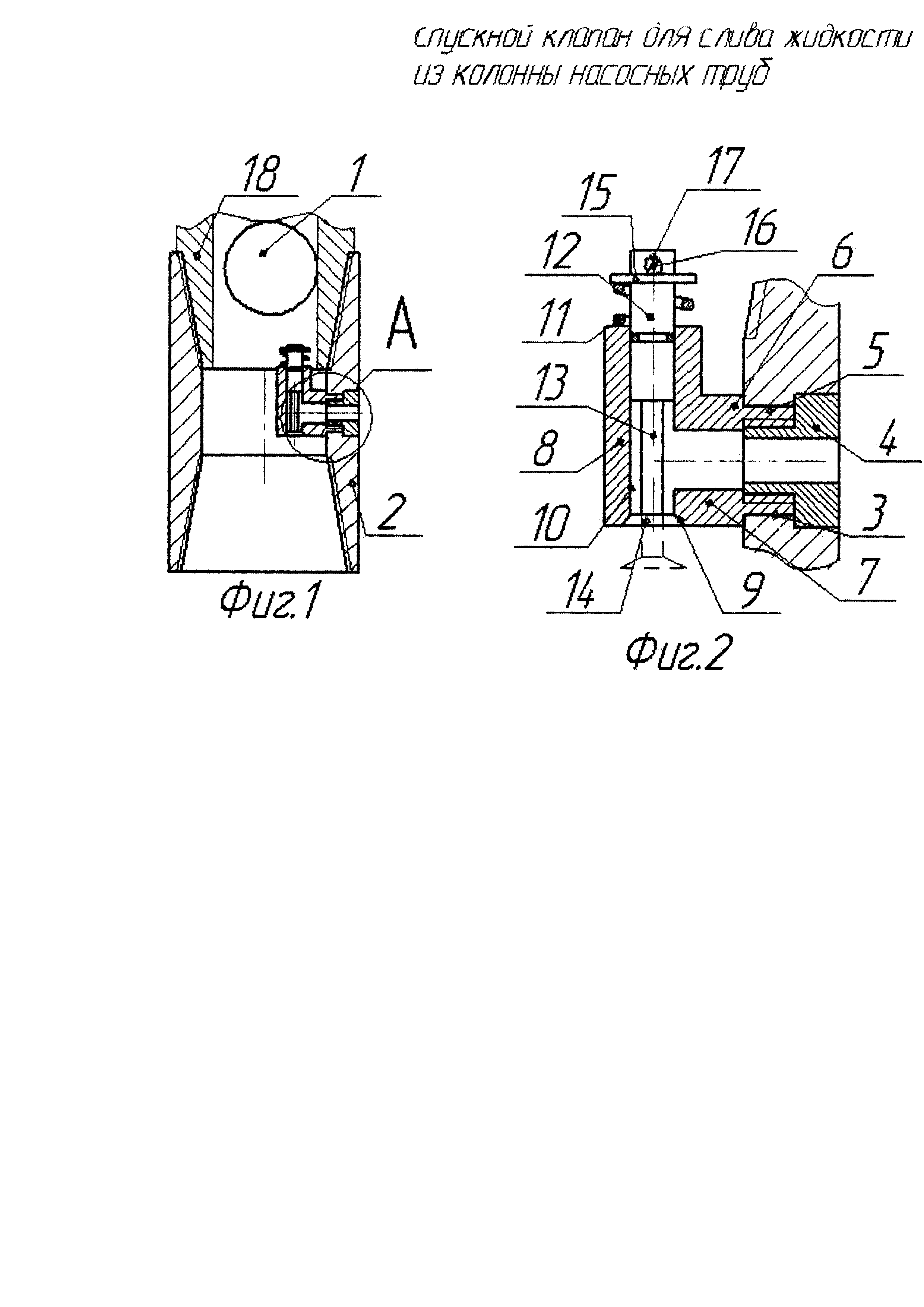 Изобретение относится к нефтяной промышленности и предназначено для слива жидкости из колонны насосно-компрессорных труб перед подъемом их из скважины. Из существующего уровня техники известен спускной клапан (патент RU 159502, МПК F16L 55/055, опубл. 10.02.2016), содержащий шарик, патрубок с радиальным отверстием, штуцер, установленный в радиальном отверстии патрубка и выполненный со сквозным отверстием, причем в сквозное отверстие штуцера установлен шток с глухим отверстием и двумя радиальными отверстиями, причем рядом с торцом штуцера, находящегося в полости патрубка, на боковой стенке штока выполнен кольцевой паз, в котором находятся кромки продольного паза металлической полоски, а выступы, выполненные в средней части кромок, находятся в верхней части кольцевого паза, причем металлическая полоска находится в верхней полости патрубка и верхняя часть этой полоски согнута в сторону свободного торца штока. Недостатком известного спускного клапана является возможность произвольного срабатывания от вибрации и перепада давления жидкости в полости колонны насосно-компрессорных труб. Шток удерживается в отверстии штуцера весом металлической полоски. При возникновении вибрации или перепада давления жидкости шток перемещается в сторону от штуцера и сливной клапан произвольно срабатывает. Наиболее близким по технической сущности к заявляемому устройству является спускной клапан для слива жидкости из колонны насосных штанг (патент RU 157541, МПК E03D 1/30, опубл. 10.12.2015), содержащий шарик, патрубок с отверстием, штуцер, соединенный в отверстии патрубка с тонкой частью двухступенчатого патрубка, причем на свободный конец толстой части двухступенчатого патрубка соединен полый цилиндр, выполненный с фаской на нижнем конце внутренней боковой стенки, причем в полый цилиндр установлен подпружиненный пружиной сжатия шток со стержнем, причем в нижнем конце стержня имеется выступ в форме усеченного конуса. Недостатком прототипа является низкая надежность, обусловленная высокой вероятностью отсоединения стержня от штока. Эти детали соединены между собою резьбовым соединением. При перемещении штока вниз пружина сжатия поворачивает его в одном направлении, а при перемещении штока вверх пружина сжатия поворачивает его в другом направлении. В результате этого нарушается прочность резьбового соединения и после нескольких циклов работы устройства стержень полностью отсоединяется от штока. Задачей изобретения является повышение надежности. Поставленная задача решается тем, что в спускном клапане для слива жидкости из колонны насосных труб, содержащем шарик, патрубок с отверстием, штуцер, соединенный в отверстии патрубка с тонкой частью двухступенчатого патрубка, причем на свободный конец толстой части двухступенчатого патрубка соединен полый цилиндр, выполненный с фаской на нижнем конце внутренней боковой стенки, причем в полый цилиндр установлен подпружиненный пружиной сжатия шток со стержнем, причем в нижнем конце стержня имеется выступ в форме усеченного конуса, согласно изобретению на верхний конец штока над пружиной сжатия одета шайба, зафиксированная винтом, завернутым в радиальную резьбовую выборку, выполненную на штоке над шайбой, при этом шток выполнен за одно целое со стержнем, имеющим на нижнем конце выступ в форме усечен