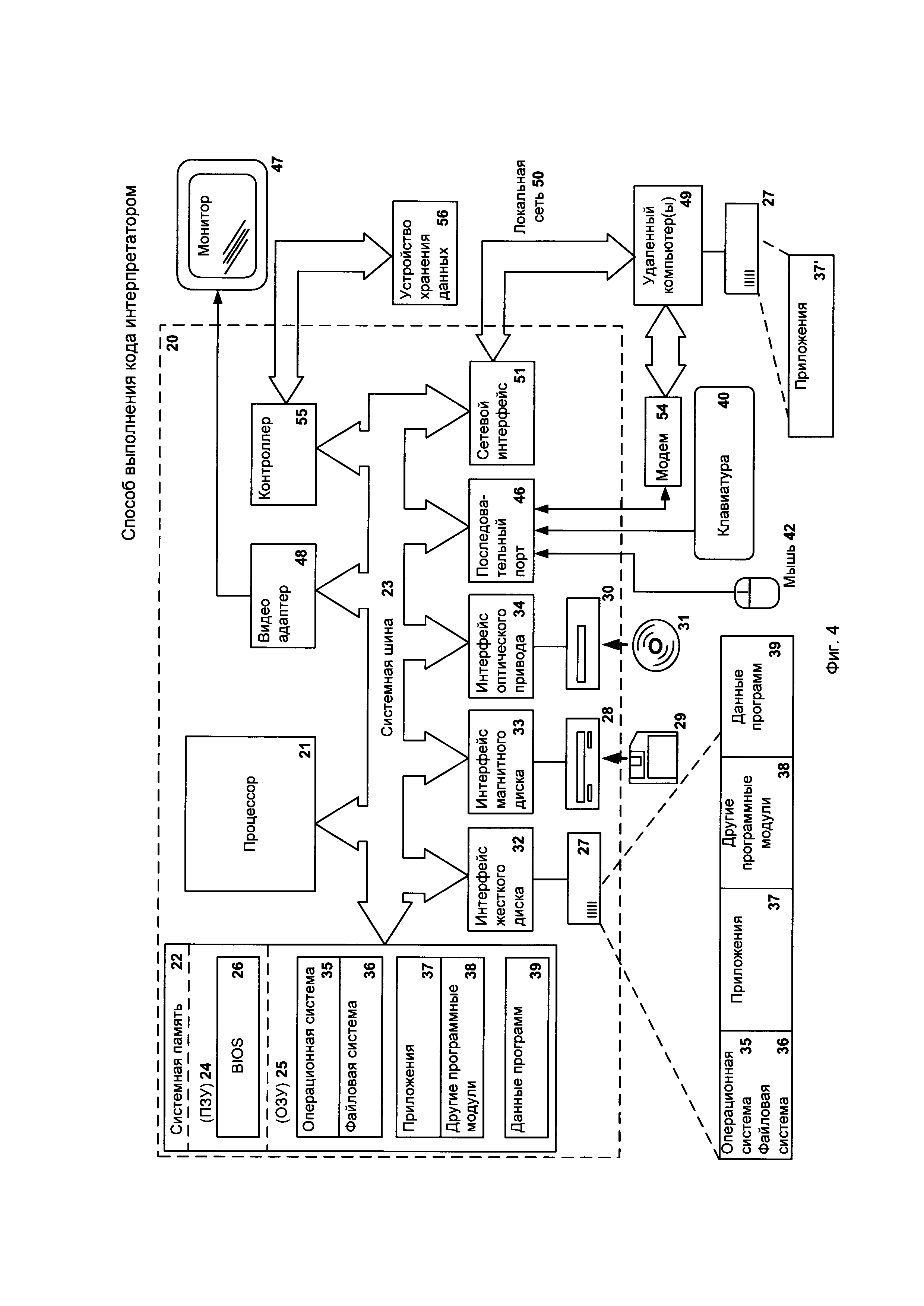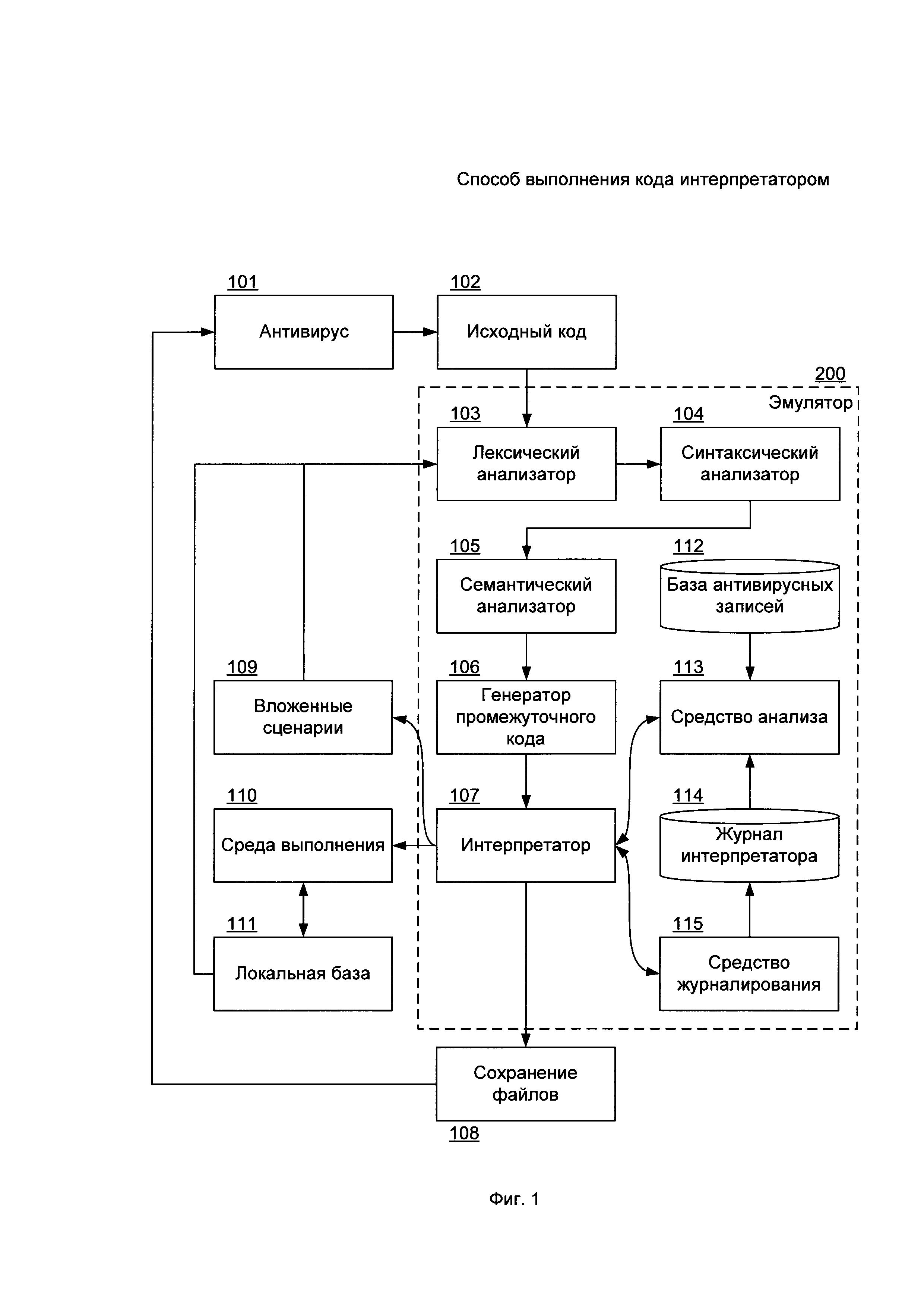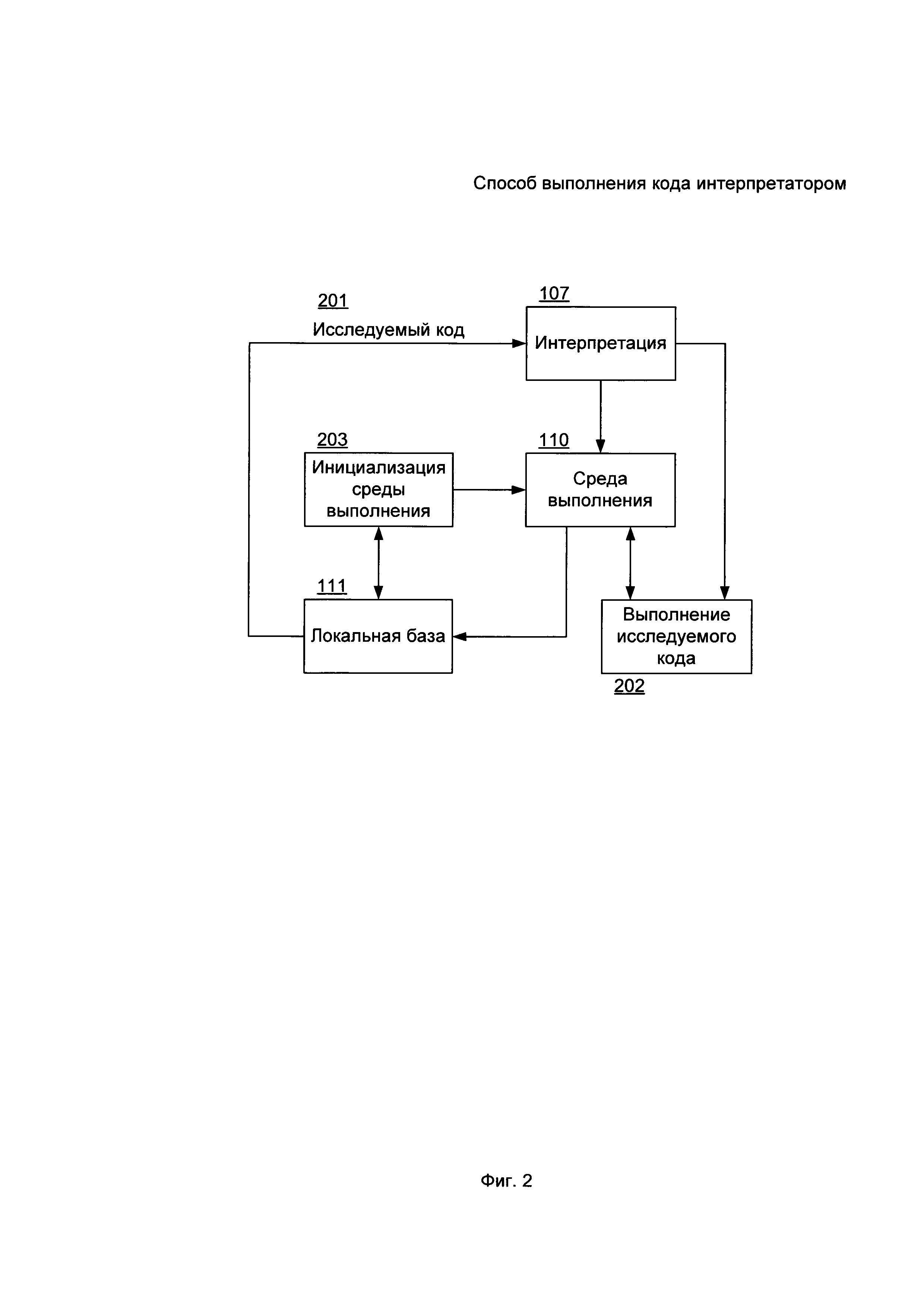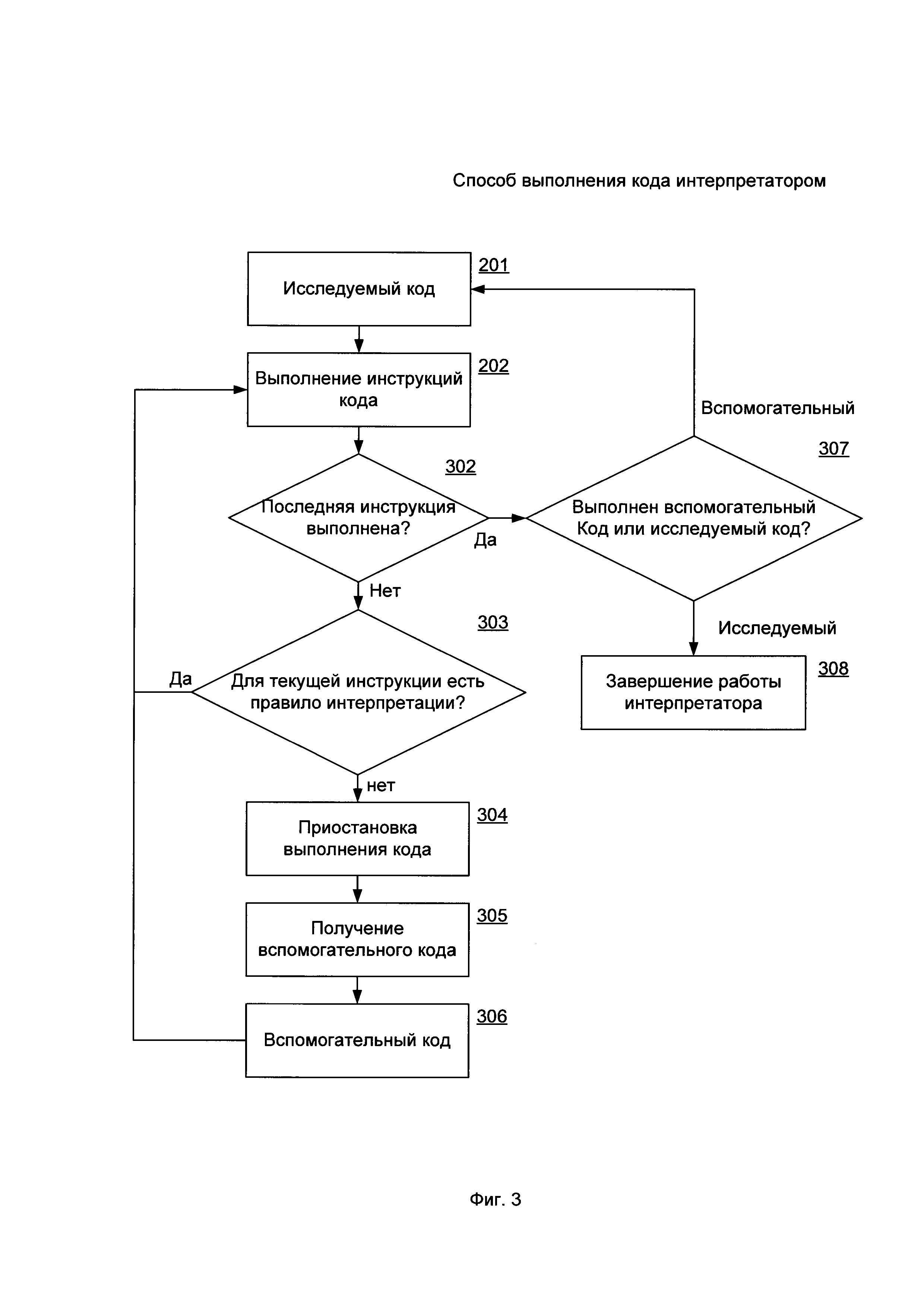 1. Реализуемый компьютером способ выполнения программного кода интерпретатором, в котором: а) последовательно выполняют каждую инструкцию исследуемого кода; б) когда интерпретатор переходит к выполнению инструкции исследуемого кода, содержащей неизвестный объект, для которого у интерпретатора отсутствует правило интерпретации, приостанавливают дальнейшее выполнение исследуемого кода, при этом объект является одним из: процедурой; экземпляром класса; методом или переменной экземпляра класса; сценарием; файлом; в) получают вспомогательный код, результат выполнения которого соответствует результату выполнения упомянутого неизвестного объекта, при этом вспомогательный код содержит известные объекты, для которых в интерпретаторе присутствует правило интерпретации; г) последовательно выполняют каждую инструкцию вспомогательного кода; и д) после завершения выполнения вспомогательного кода возобновляют выполнение исследуемого кода на шаге б) со следующей инструкции исследуемого кода, пока не будет выполнена последняя инструкция исследуемого кода. 2. Способ по п. 1, в котором на шаге а) инициализируют среду выполнения интерпретатора. 3. Способ по п. 2, в котором вспомогательный код содержится в среде выполнения интерпретатора и на шаге в) вспомогательный код получают из среды выполнения интерпретатора. 4. Способ по п. 1, в котором на шаге в) вспомогательный код получают из локальной базы. 5. Способ по п. 4, в котором инициализируют среду выполнения интерпретатора для вспомогательного кода. 6. Способ по п. 4, в котором на шаге в) получают упомянутый вспомогательный код из удаленной базы, когда упомянутый вспомогательный код отсутствует в локальной базе. 7. Способ по п. 1, в котором выполнение кода и выполнение вспомогательного кода включает следующие этапы: лексический анализ, синтаксический анализ, создание промежуточного кода и интерпретацию промежуточного кода согласно правилам интерпретации. 8. Способ по п. 1, в котором вспомогательный код дополнительно содержит по меньшей мере один другой неизвестный объект, для которого получают другой вспомогательный код, результат выполнения упомянутого другого вспомогательного кода соответствует результату выполнения другого неизвестного объекта.