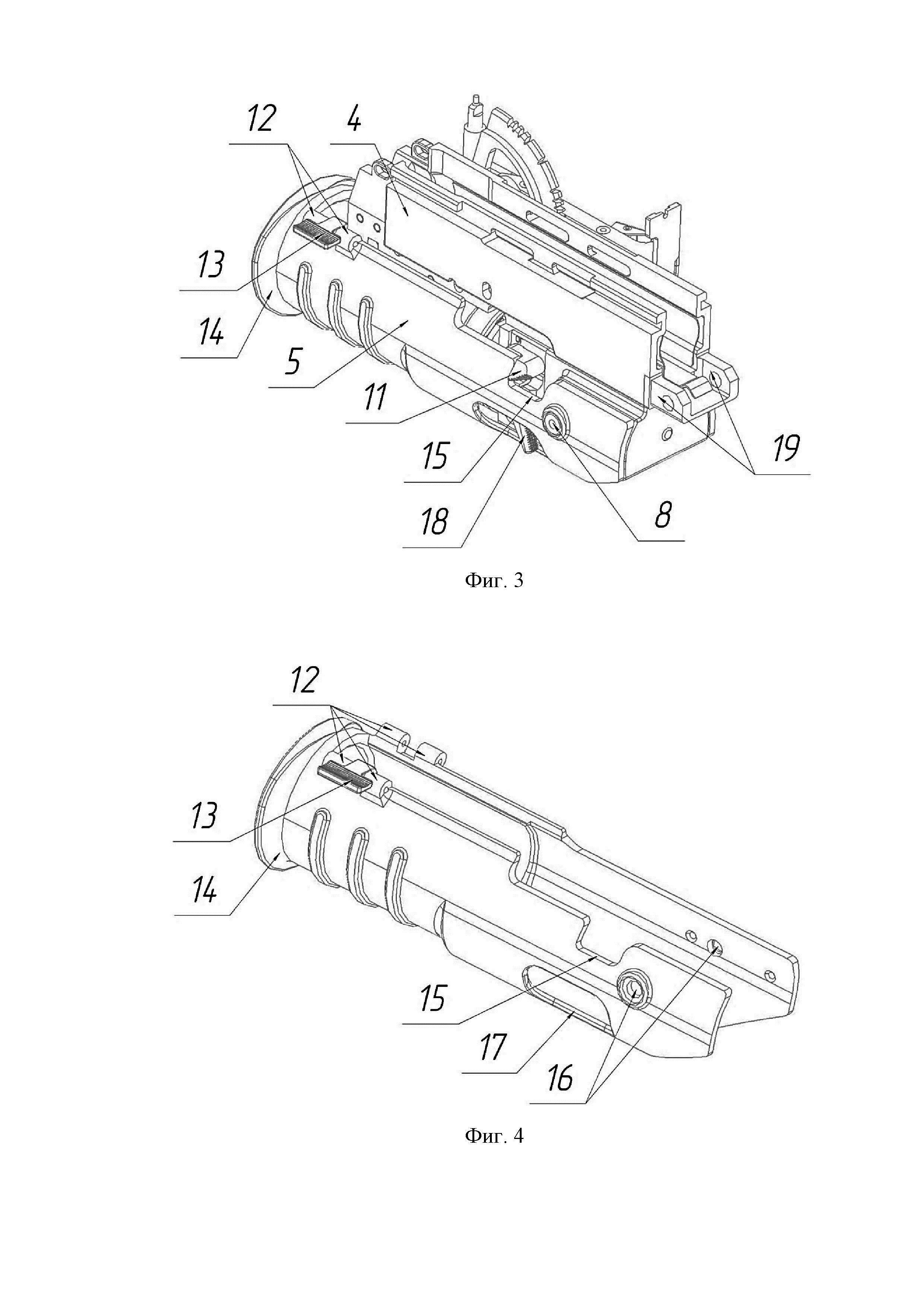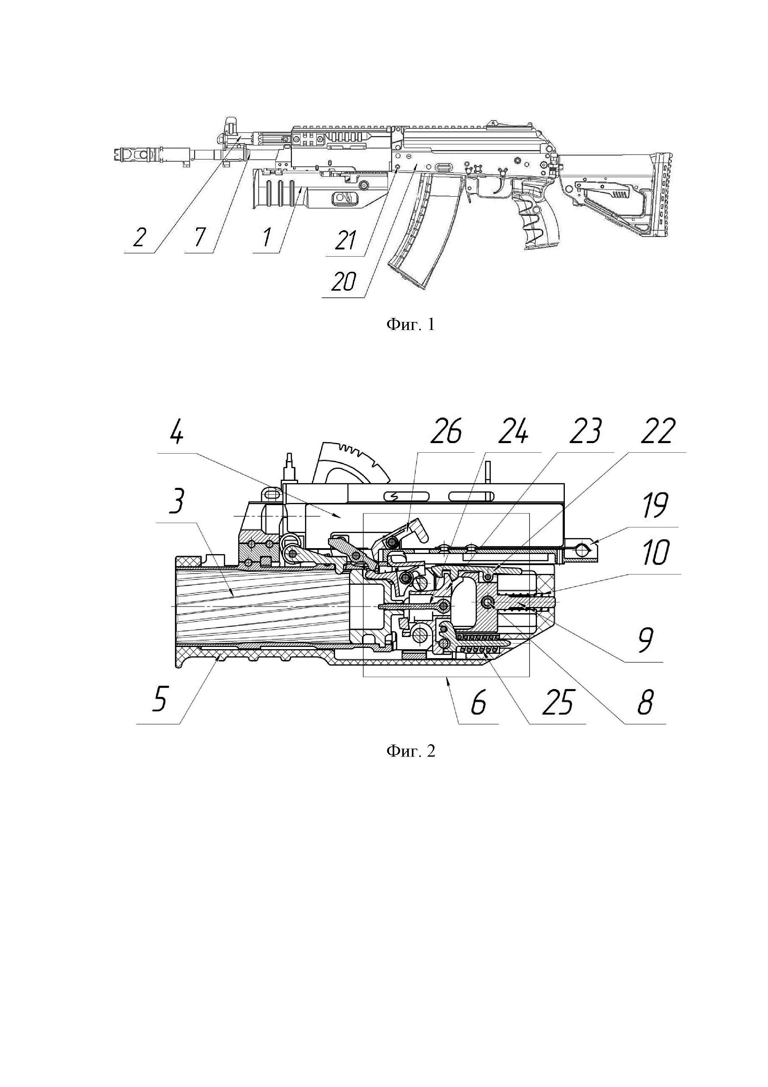 Изобретение относится к стрелковому оружию, к гранатометному вооружению, а конкретно к подствольным гранатометам. Известен 40 мм подствольный гранатомет М203 (США) для штурмовых винтовок и способ осуществления стрельбы из гранатомета (см. http://warweapons.ru/podstvolnyiy-granatomet-m203-ssha/). Подствольный гранатомет состоит из подвижного ствола с жестко закрепленным на нем кожухом, корпуса ударно-спускового механизма. Кожух обеспечивает при продольных перемещениях заряжание гранатомета, запирание канала ствола и взведение спускового механизма. Для осуществления выстрела из подствольного гранатомета устанавливают гранатомет на штурмовые винтовки, заряжают с казенной части. Выстрел производят нажатием на спусковой крючок указательным пальцем руки стрелка, обхватывающей магазин винтовки. При стрельбе из штурмовой винтовки с установленным на ней подствольным гранатометом кожух ствола выполняет функцию цевья. Недостатками данного устройства и способа являются низкие эксплуатационные характеристики, а именно неудобство присоединения из-за необходимости значительной разборки винтовки для присоединения подствольного гранатомета, а также ненадежное удержание винтовки охватом магазина во время стрельбы из оружия с присоединенным гранатометом. Известен 40 мм подствольный гранатомет ГП-34 для автоматов Калашникова и способ осуществления стрельбы из гранатомета (см. http://zonwar.ru/granatomet/podstvol/GP-34.html). Подствольный гранатомет включает ствол, кронштейн для крепления гранатомета к стрелковому оружию, ударно-спусковой механизм, переводчик. На гранатомете имеется пустотелая резиновая рукоятка для удержания оружия при стрельбе из гранатомета. Для осуществления выстрела из подствольного гранатомета устанавливают гранатомет на ствол автомата на Т-образный выступ колодки газовой камеры посредством Т-образного паза в передней части кронштейна и обхватом ствола автомата задней частью кронштейна с упором в цевье автомата, фиксируют защелкой, заряжают с дульной части. Выстрел производят нажатием на спуск указательным пальцем руки стрелка при обхвате ею резиновой рукоятки, при этом под действием боевой пружины курок энергично поворачивается вверх и ударяет по бойку, боек продвигается вверх, разбивая капсюль-воспламенитель боеприпаса, происходит выстрел. Недостатками данного устройства и способа являются: - низкие эксплуатационные характеристики, а именно неудобство удержания оружия при стрельбе из автомата с присоединенным к нему подствольным гранатометом, так как гранатомет полностью перекрывает цевье автомата и имеет угловатые формы и выступающие детали в месте удержания оружия, а также неудобство удержания оружия при стрельбе из присоединенного к автомату подствольного гранатомета из-за недостаточной жесткости и высоты резиновой рукоятки, при этом высота и жесткость рукоятки определяются условием свободного присоединения к автомату магазина; - неудобство обслуживания из-за значительного усилия, которое прикладывается при нажатии на спусковой крючок указательным пальцем руки стрелка. Технической задачей заявляемого изобретения является повышение эксплуатационных характеристик стрелкового оружия с присоединенным подствольным гранатометом за счет повышения удобства удержания и обслуживания и быстрой установки гранатомета на о