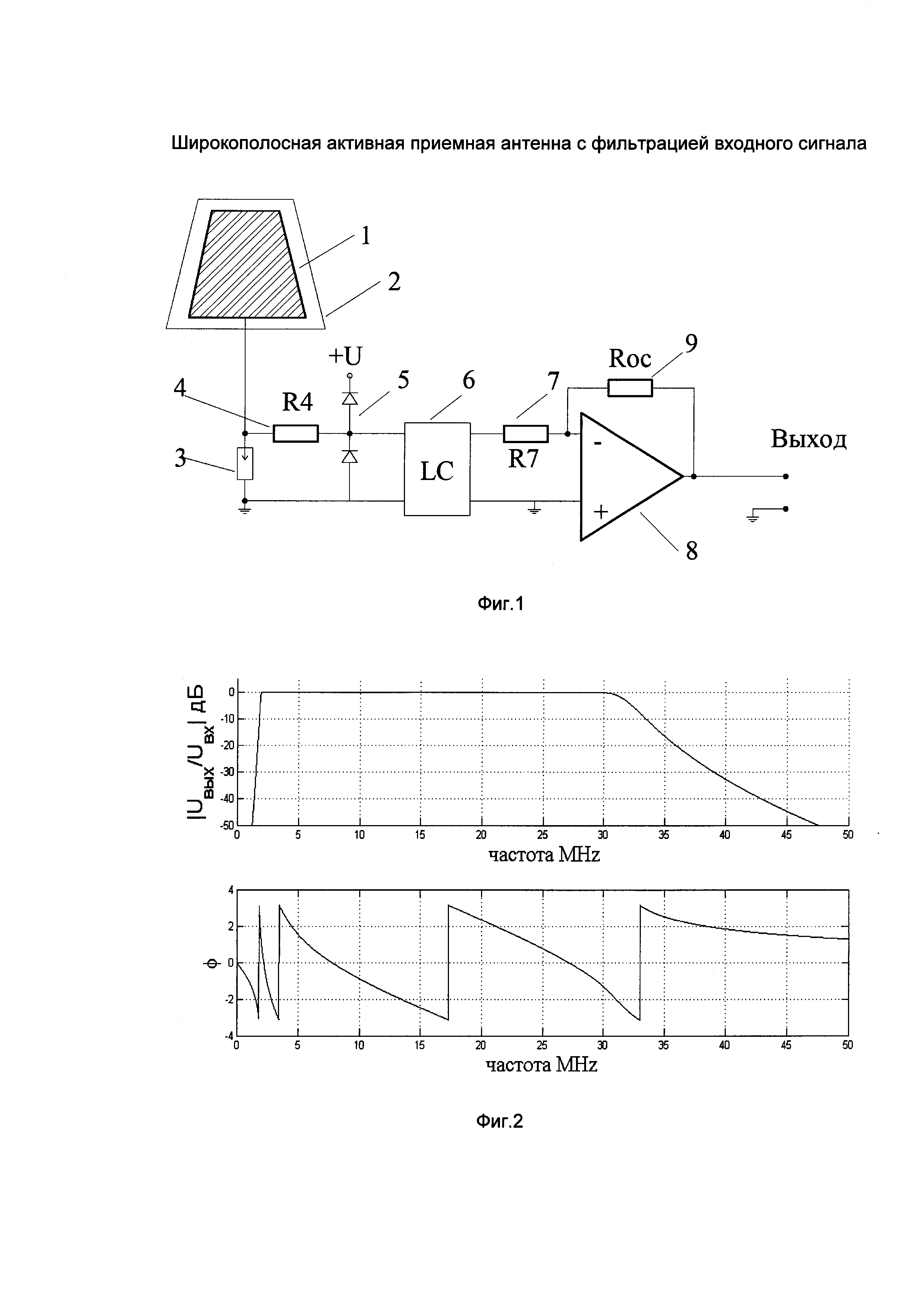 1. Широкополосная приемная активная антенна с фильтрацией входного сигнала, содержащая электрически короткий антенный элемент, несимметричный инвертирующий усилитель, вход которого подключен к антенному элементу, отличающаяся тем, что электрически короткий антенный элемент представляет собой металлическую пластину, при этом выход антенного элемента подключен к входу усилителя через LC-четырехполюсник, выполняющий роль частотного фильтра, и два резистора, один из которых включен последовательно между антенным элементом и LC-четырехполюсником, а второй также последовательно включен между LC-четырехполюсником и входом активного усилителя, а также схему защиты усилителя и LC-четырехполюсника от удара молнии и перенапряжений, состоящую из разрядника, включенного параллельно на вход антенного элемента, причем работа диодов и разрядника согласуется между собой через величину первого резистора, а между входом и выходом усилителя включен резистор обратной связи. 2. Антенна по п. 1, отличающаяся тем, что электрически короткий антенный элемент для защиты от влаги, солнечной радиации, аэродинамического и механического воздействия помещен в радиопрозрачный обтекатель.